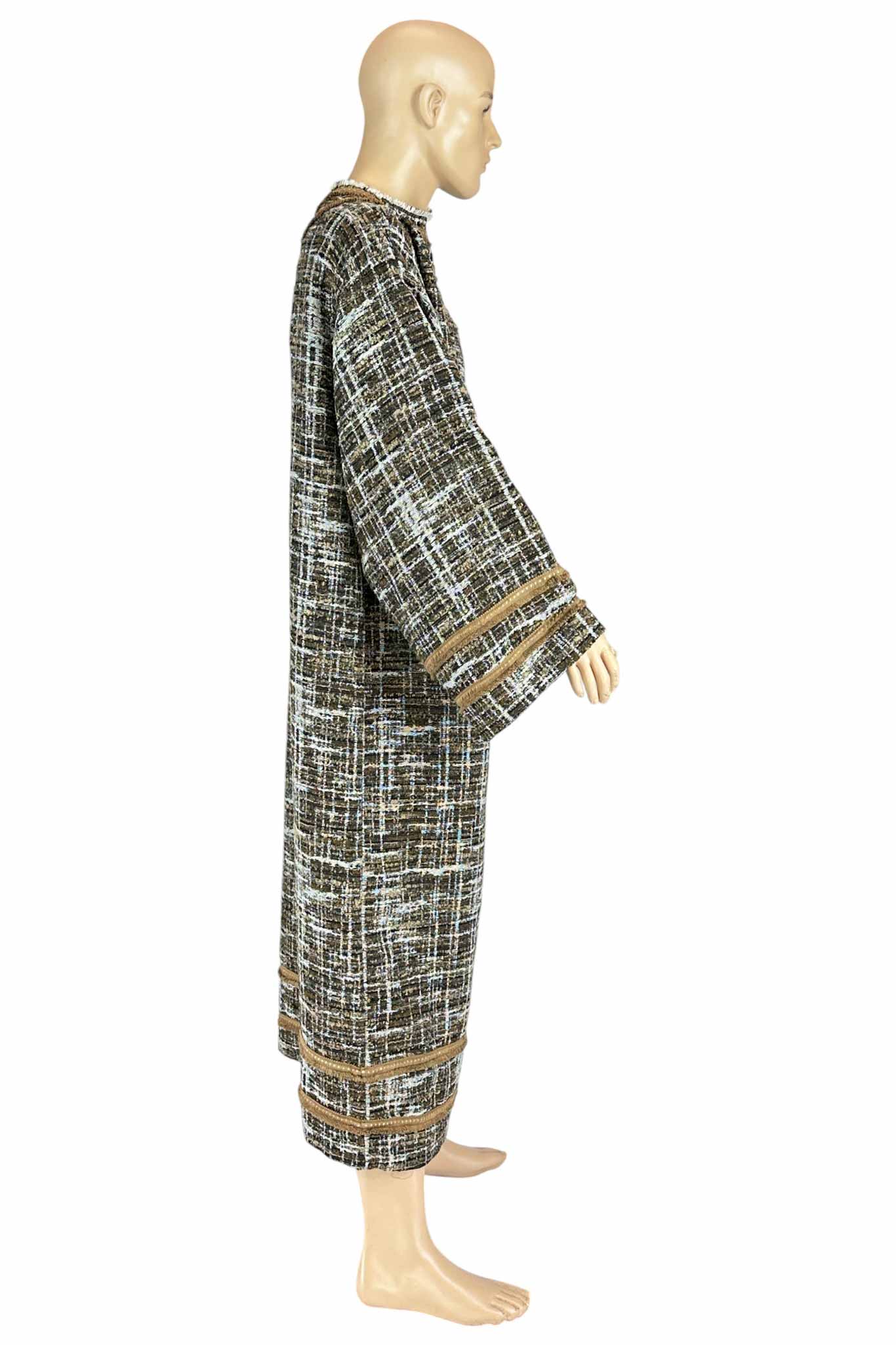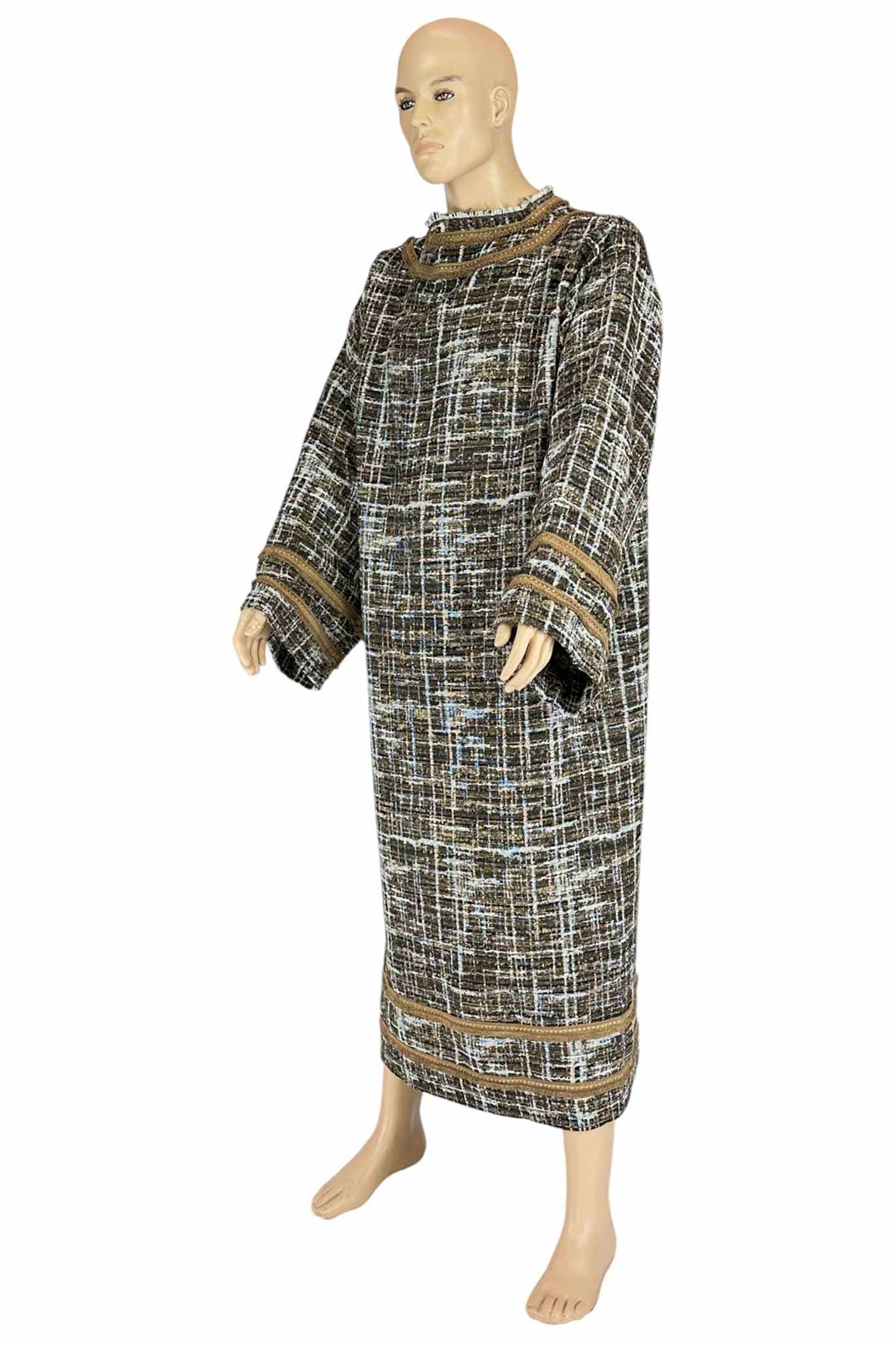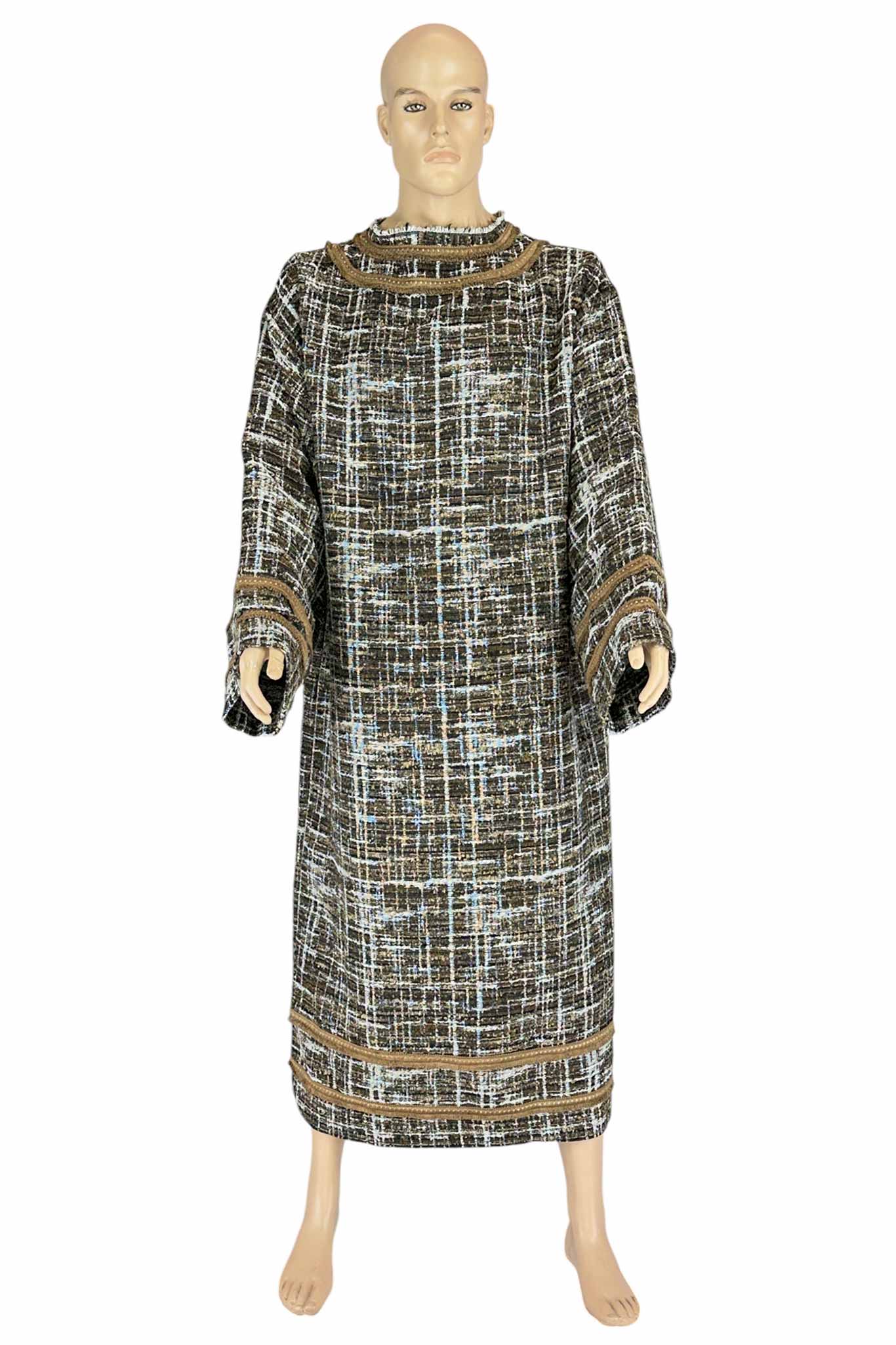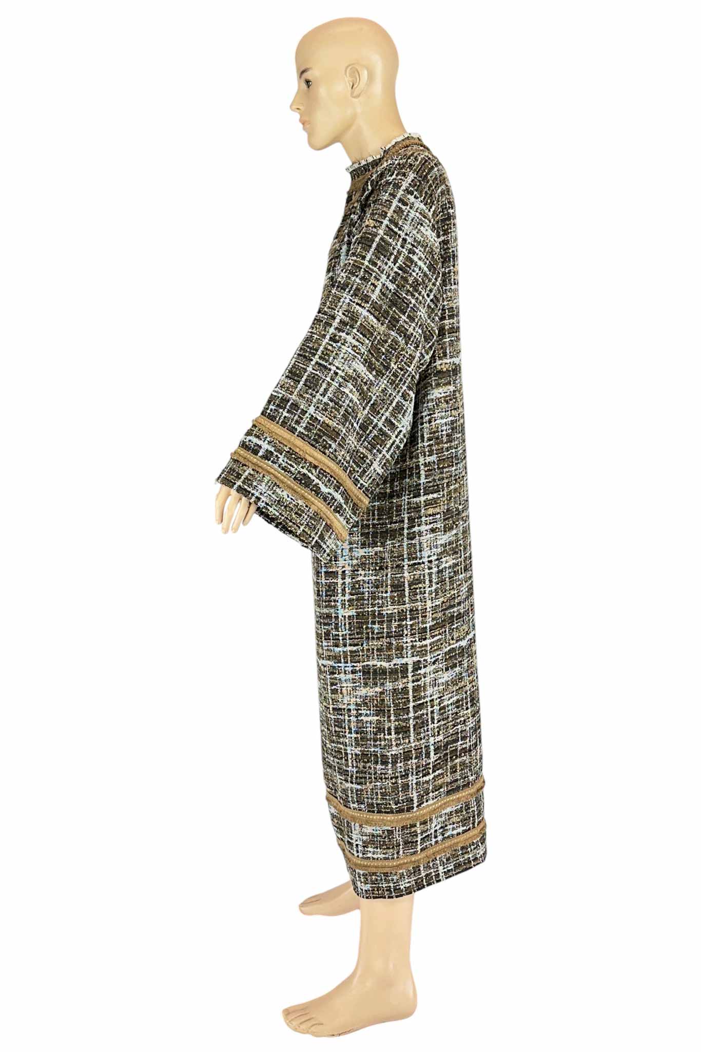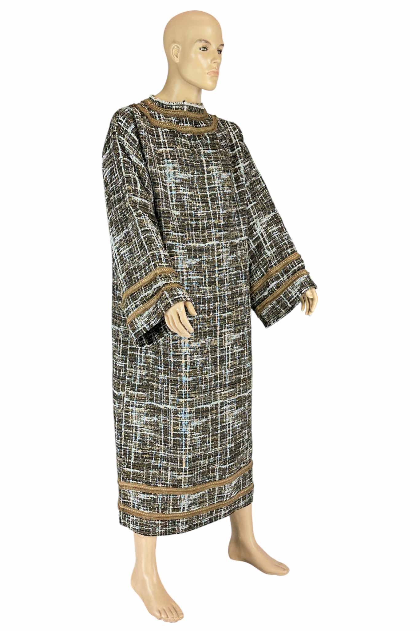 Immergiti nella storia con il nostro Noleggio abito uomo medievale in tunica decorata, un capo d’abbigliamento che richiama lo stile austero ma affascinante dell’Europa medievale. Questa tunica lunga, realizzata con un tessuto strutturato marrone e avorio, è arricchita da decorazioni lineari color oro che delimitano i polsi, l’orlo inferiore e lo scollo quadrato, conferendo un tocco nobile all’intero abito. Il taglio ampio e dritto, tipico dell’epoca, garantisce una vestibilità comoda e regale, perfetta per impersonare figure come nobili, funzionari o filosofi di corte.
