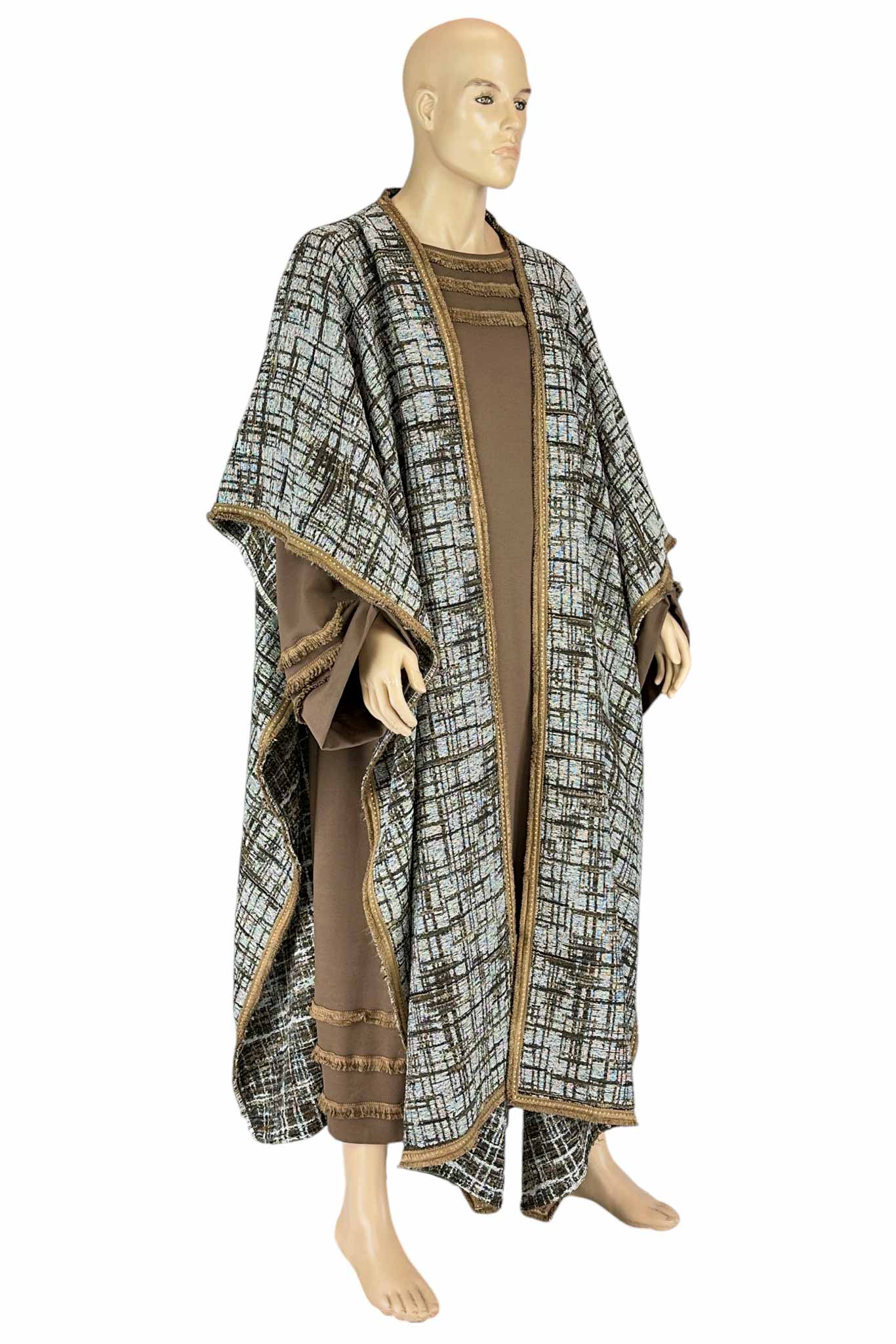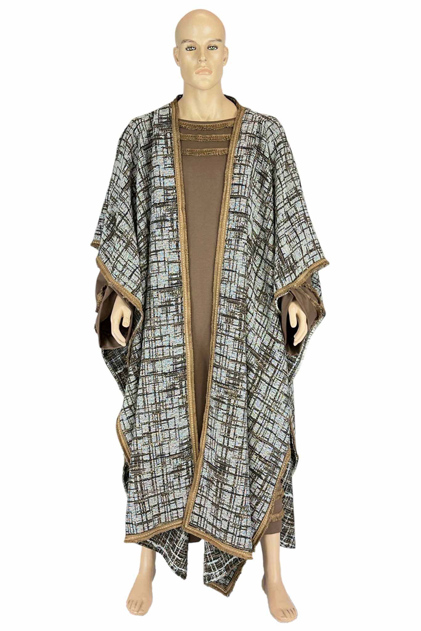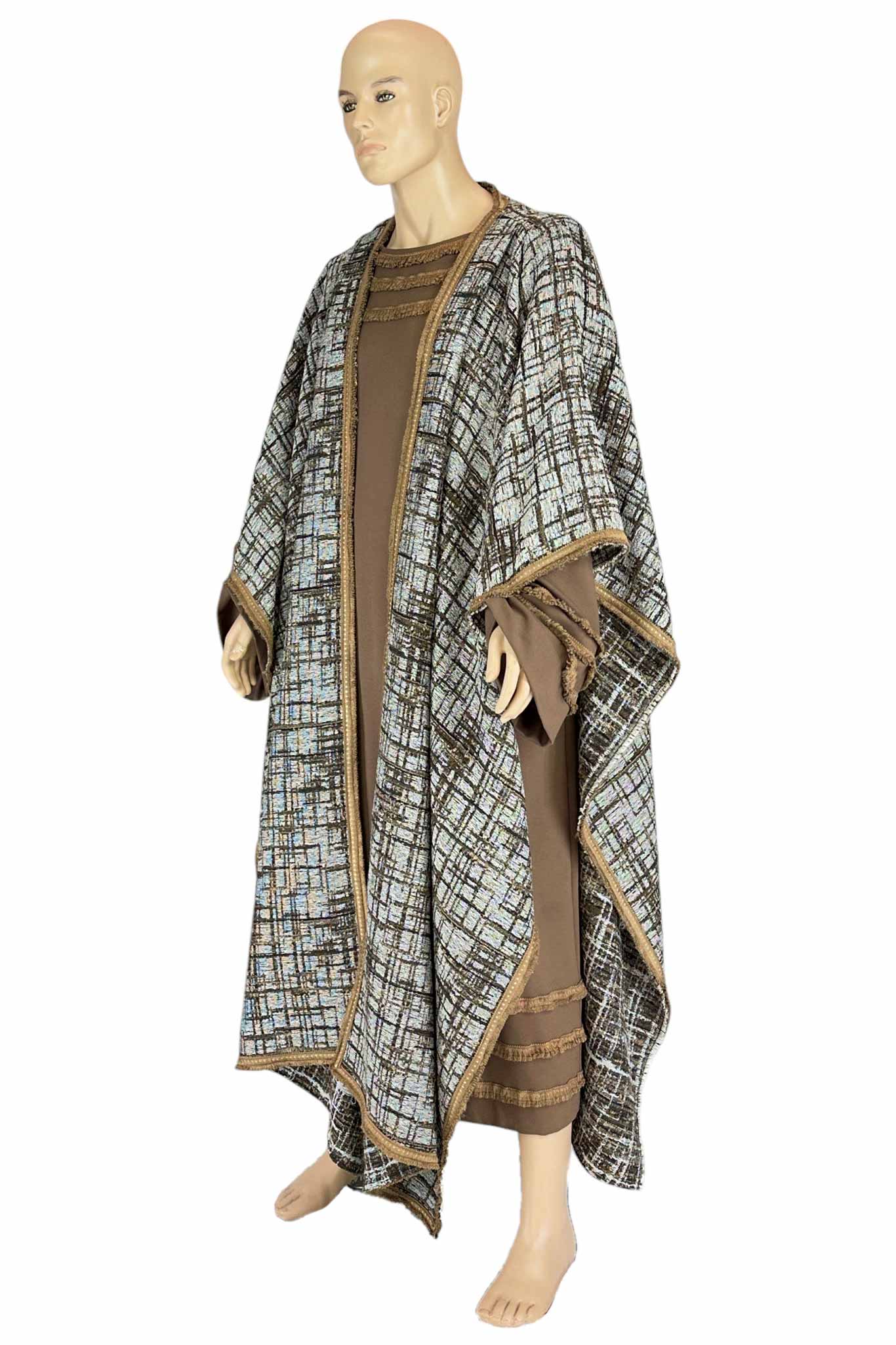 Questa raffinata tunica lunga, realizzata in tessuto marrone dalle linee fluide, è impreziosita da decori con frange dorate lungo il bordo delle maniche e della gonna, evocando lo stile dei dignitari dell'antichità. A completare il look, un maestoso mantello geometrico con effetto tessuto tramato nei toni del beige, nero e azzurro, bordato da passamaneria oro, che dona eleganza e importanza alla figura.