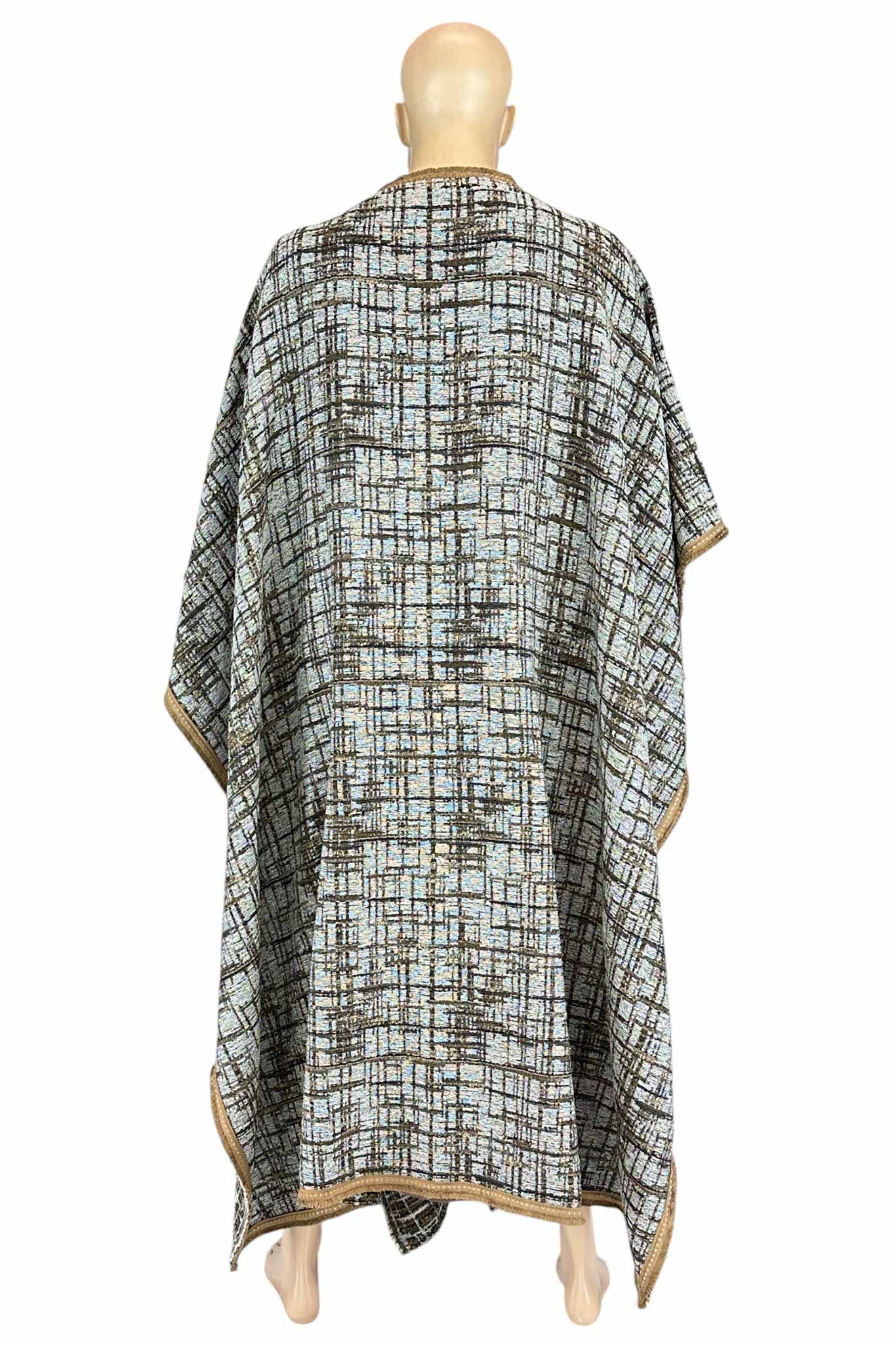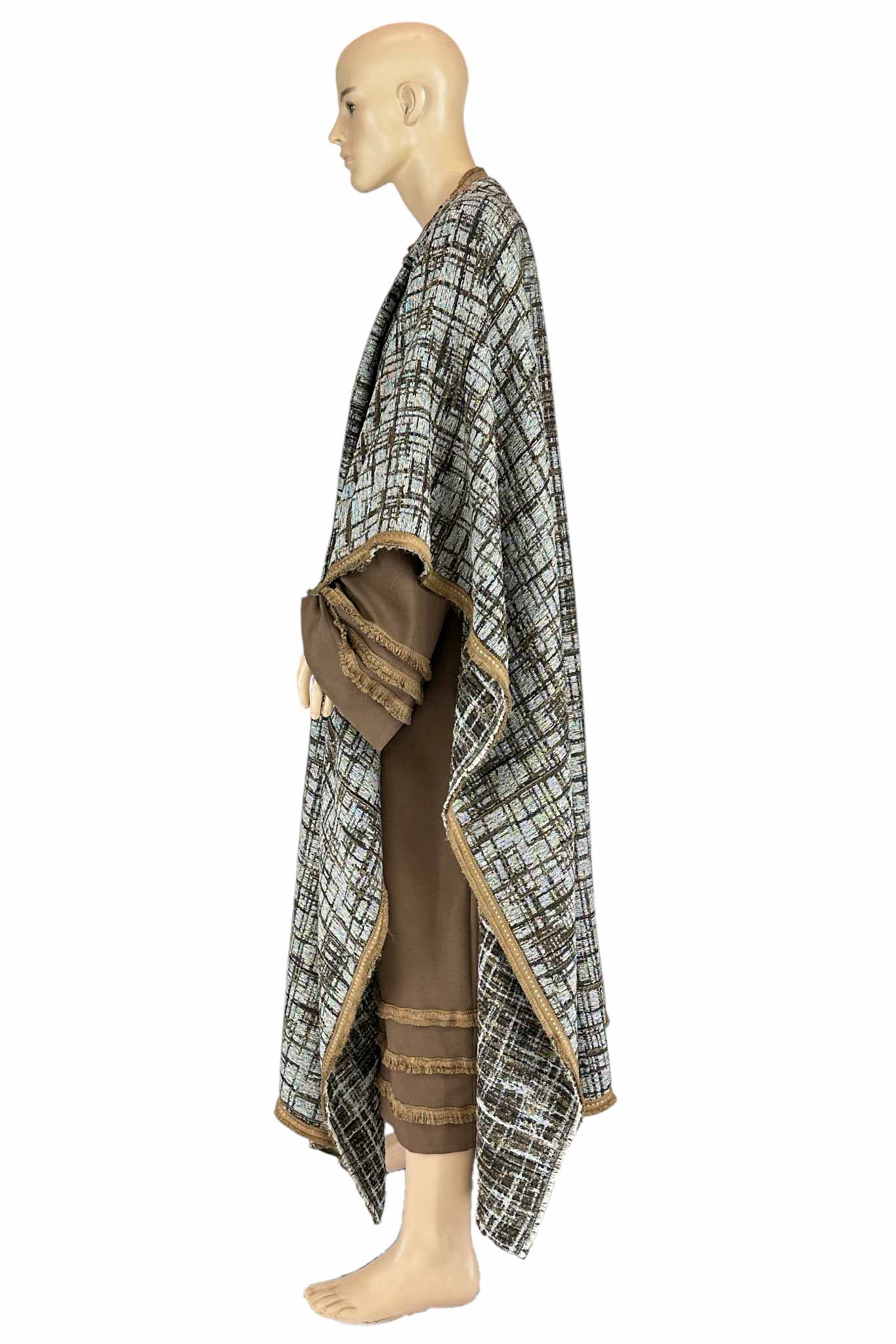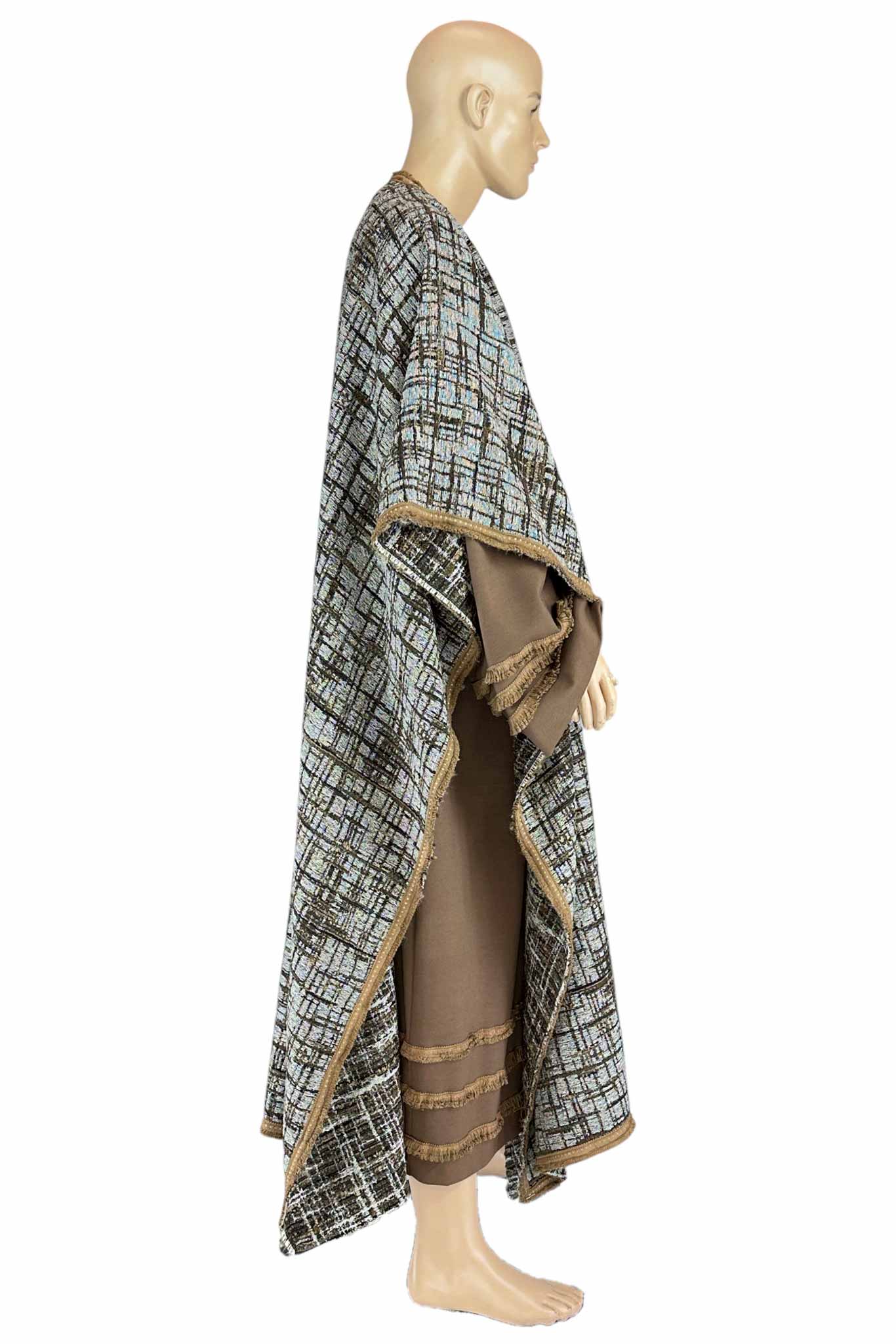 Questa raffinata tunica lunga, realizzata in tessuto marrone dalle linee fluide, è impreziosita da decori con frange dorate lungo il bordo delle maniche e della gonna, evocando lo stile dei dignitari dell'antichità. A completare il look, un maestoso mantello geometrico con effetto tessuto tramato nei toni del beige, nero e azzurro, bordato da passamaneria oro, che dona eleganza e importanza alla figura.