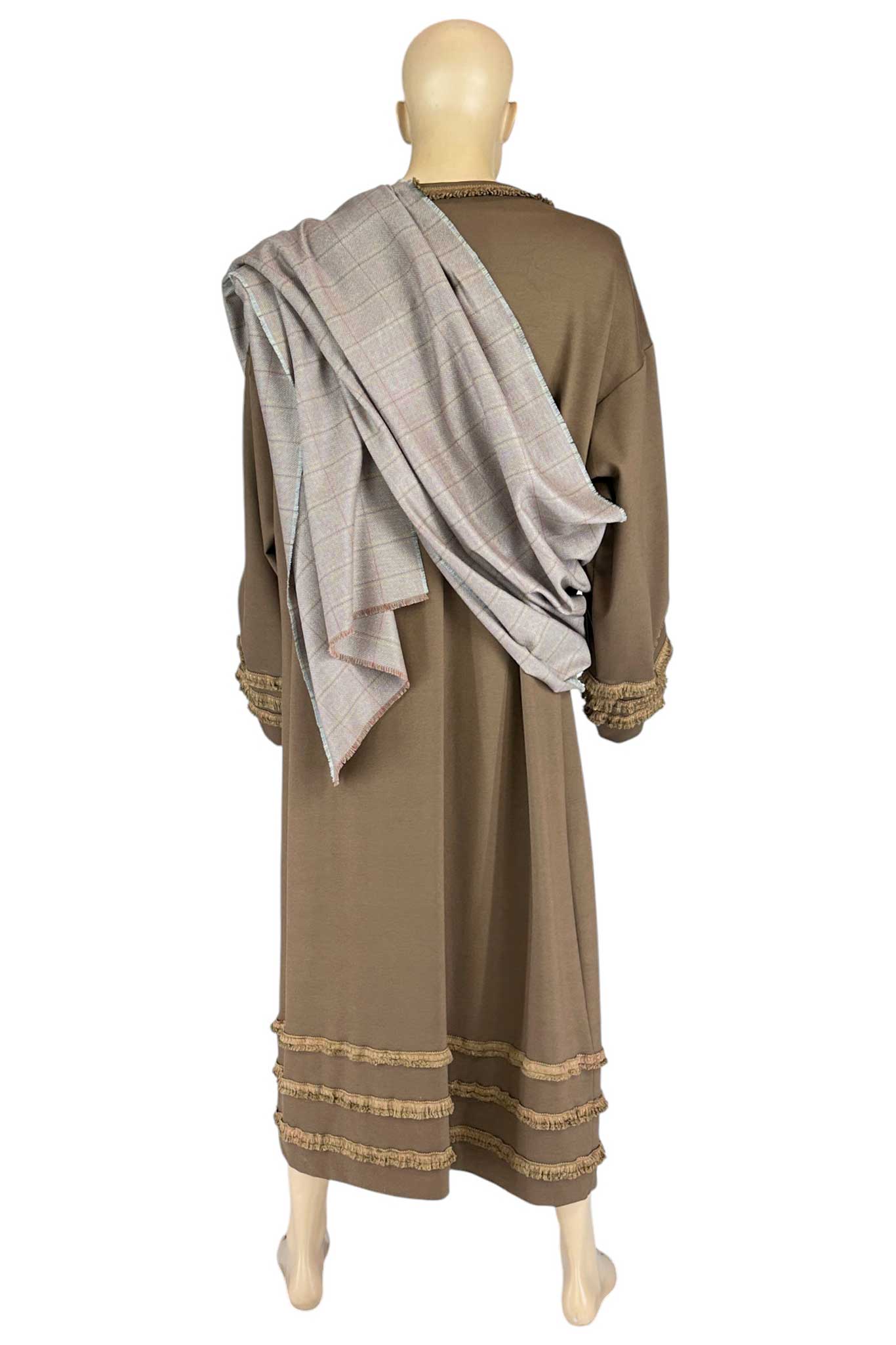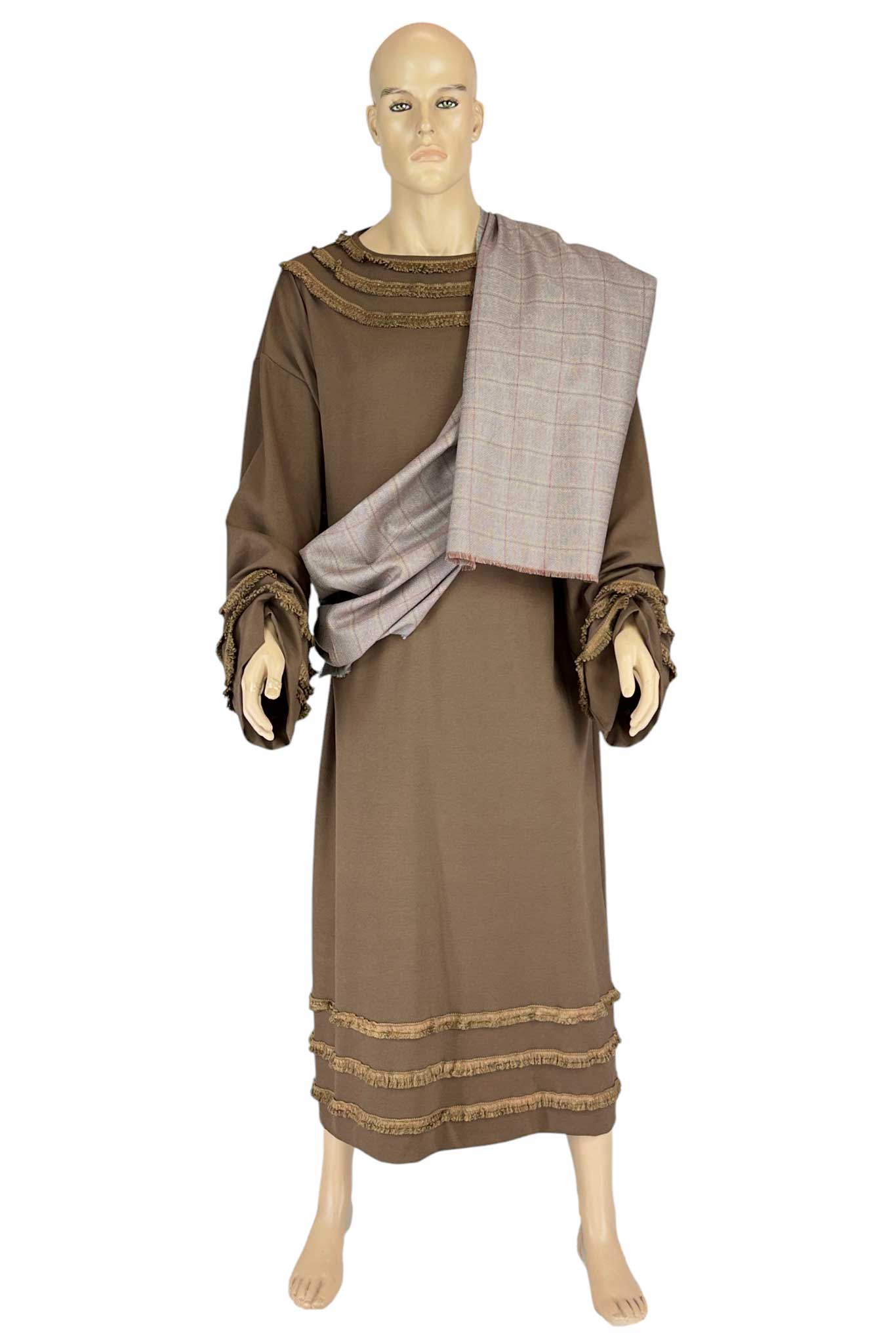 Rivivi il fascino del passato con il nostro servizio di noleggio tunica storica uomo con stola per rievocazioni, un capo ideale per chi desidera distinguersi in contesti teatrali, rievocazioni storiche o celebrazioni a tema. Questo abito è composto da una lunga tunica color tabacco, decorata con bande ornamentali dorate lungo il bordo delle maniche e alla base, e una stola grigia con motivo a quadri drappeggiata con eleganza sulla spalla sinistra.