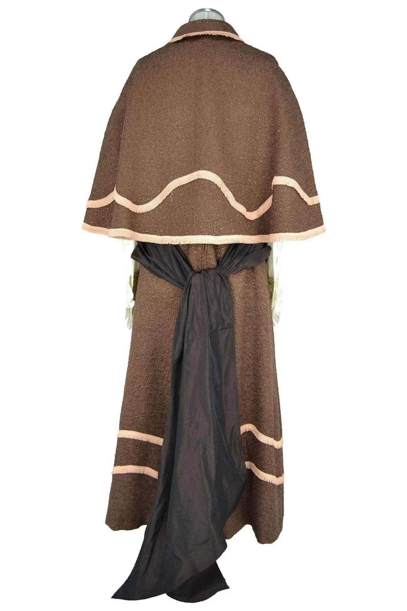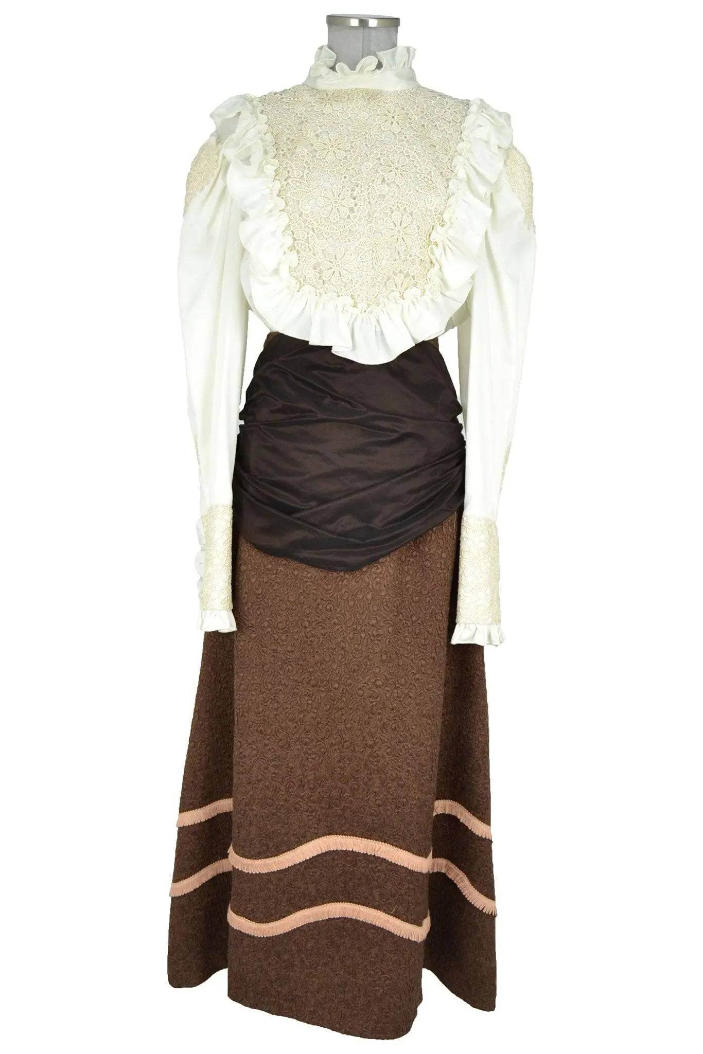 Noleggio abito donna governante di fine '800 o primi '900, composto da una bellissima blusa color panna con ampio carré di pizzo, ruches, polsini operati e incrostazioni di pizzo sulle spalle; la gonna in pesante tessuto goffrato ha doppia bordura in passamaneria e drappeggio attorno ai fianchi.