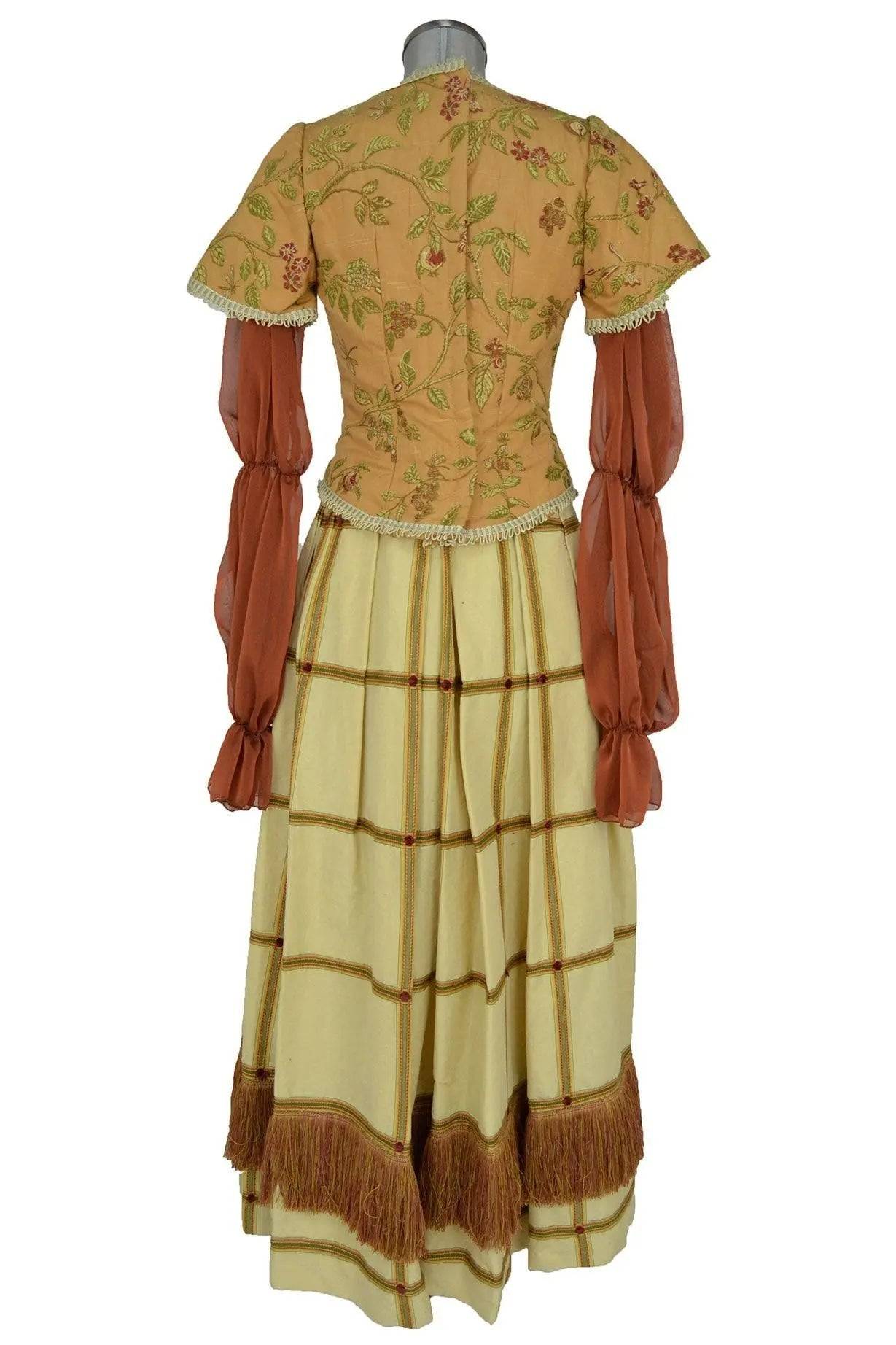 Noleggio abito donna fantasioso ispirato al '600 e '700, adatto per popolana o borghese; il corpino a motivi floreali presenta doppia manica, quella sottostante in velo arricciata al polso e al gomito; la gonna non amplissima a riquadri è orlata da un'alta frangia in tinta.