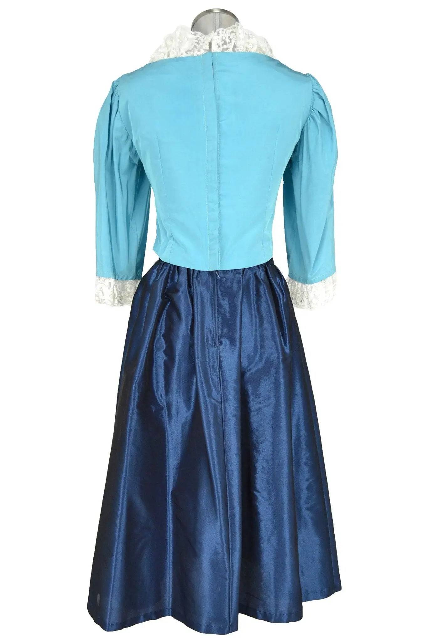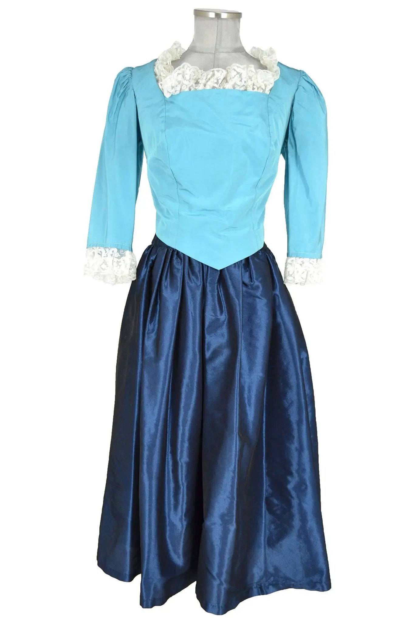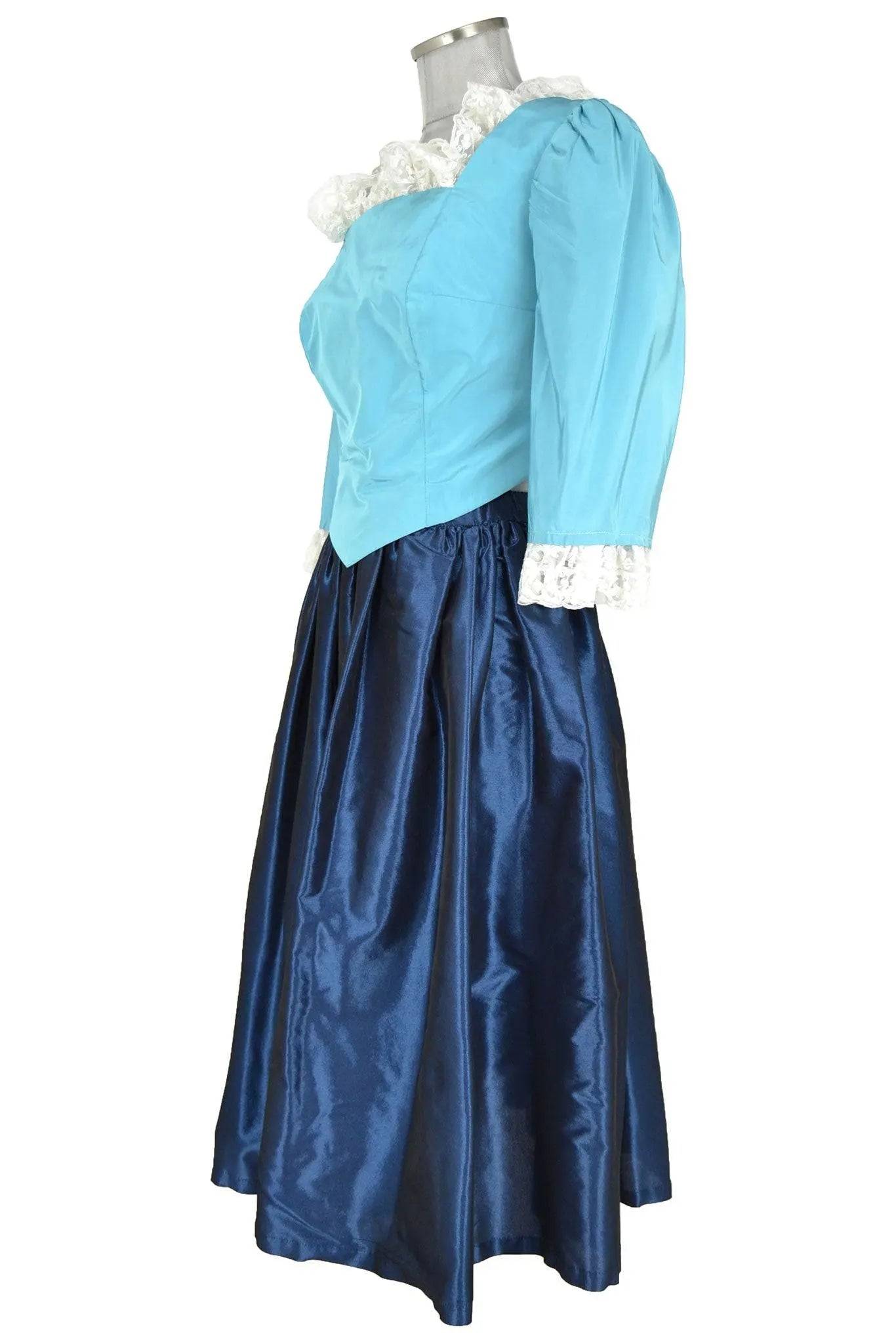 Noleggio abito donna molto grazioso in taffetà, lo stile è abbastanza neutro per cui si può adattare a personaggi di domestica o popolana dei secoli diciottesimo e diciannovesimo. La blusa con pinces ha scollo quadrato, bordure in pizzo, maniche tre quarti e vita a punta; la gonna ampia è liscia.