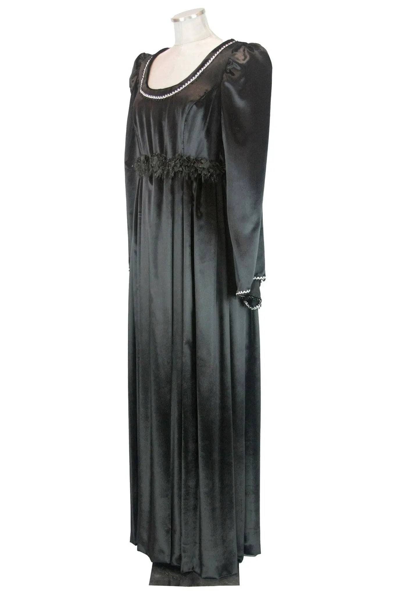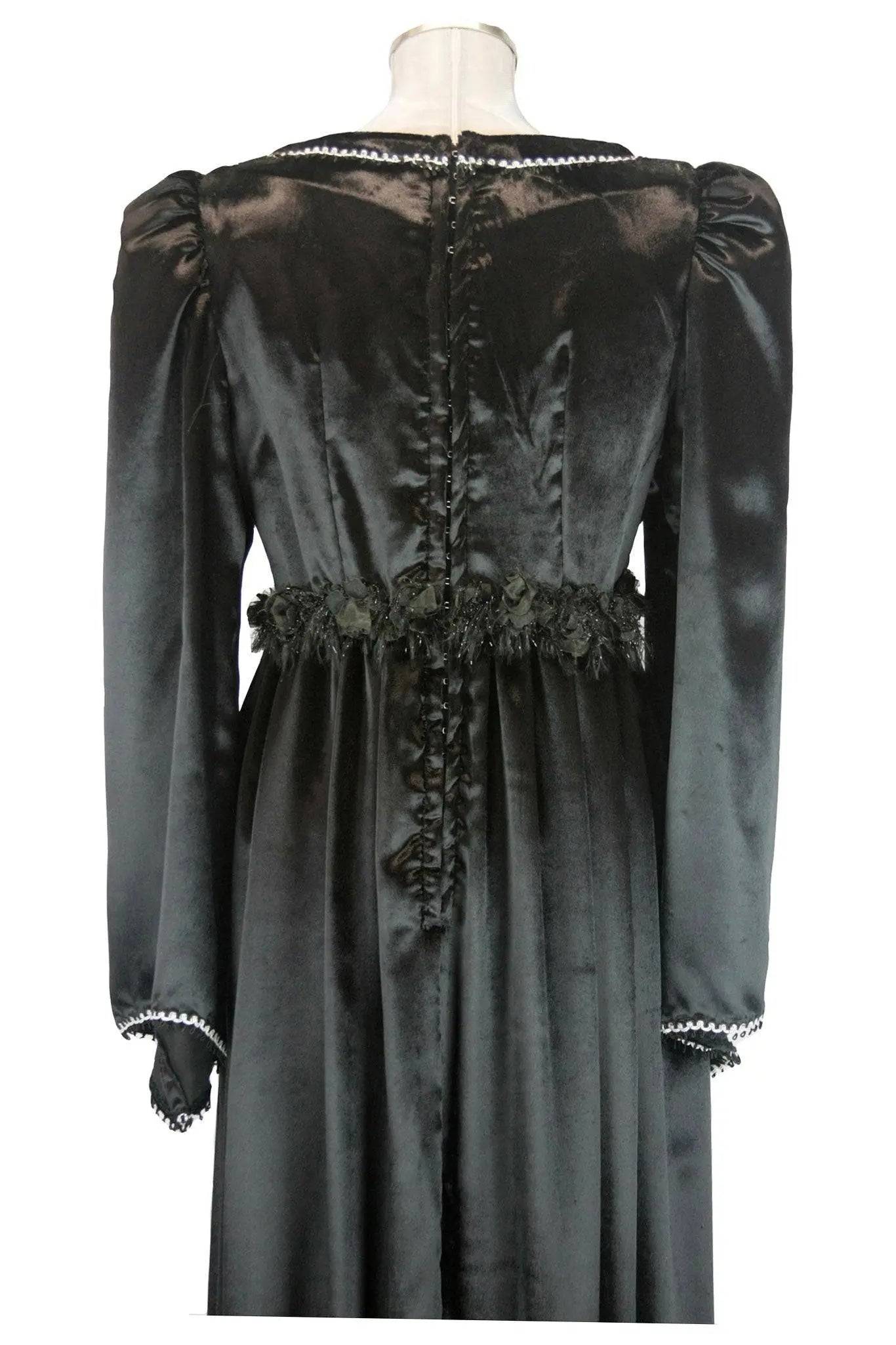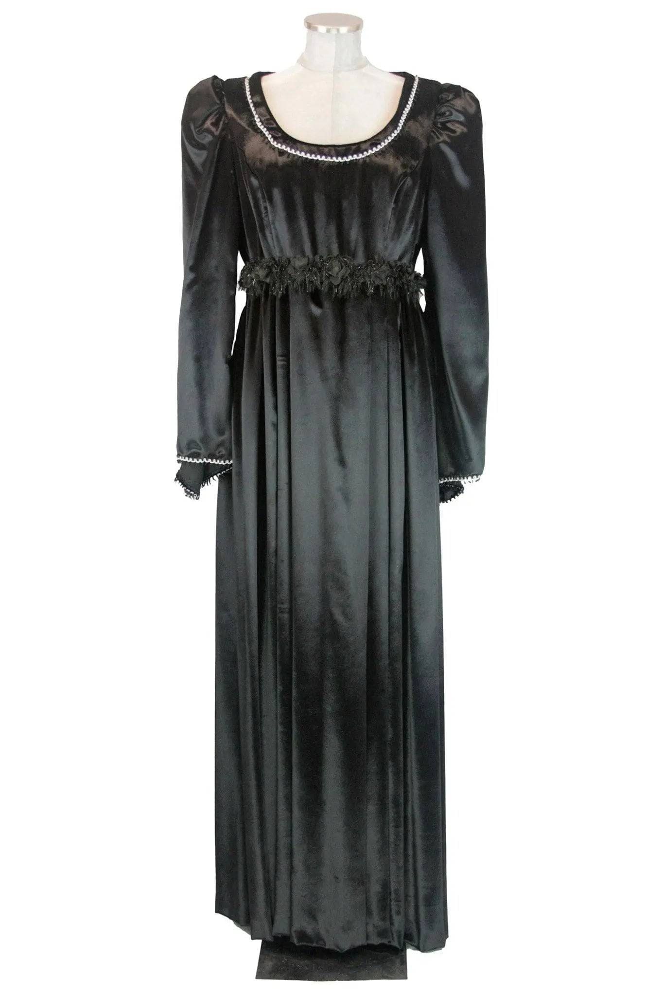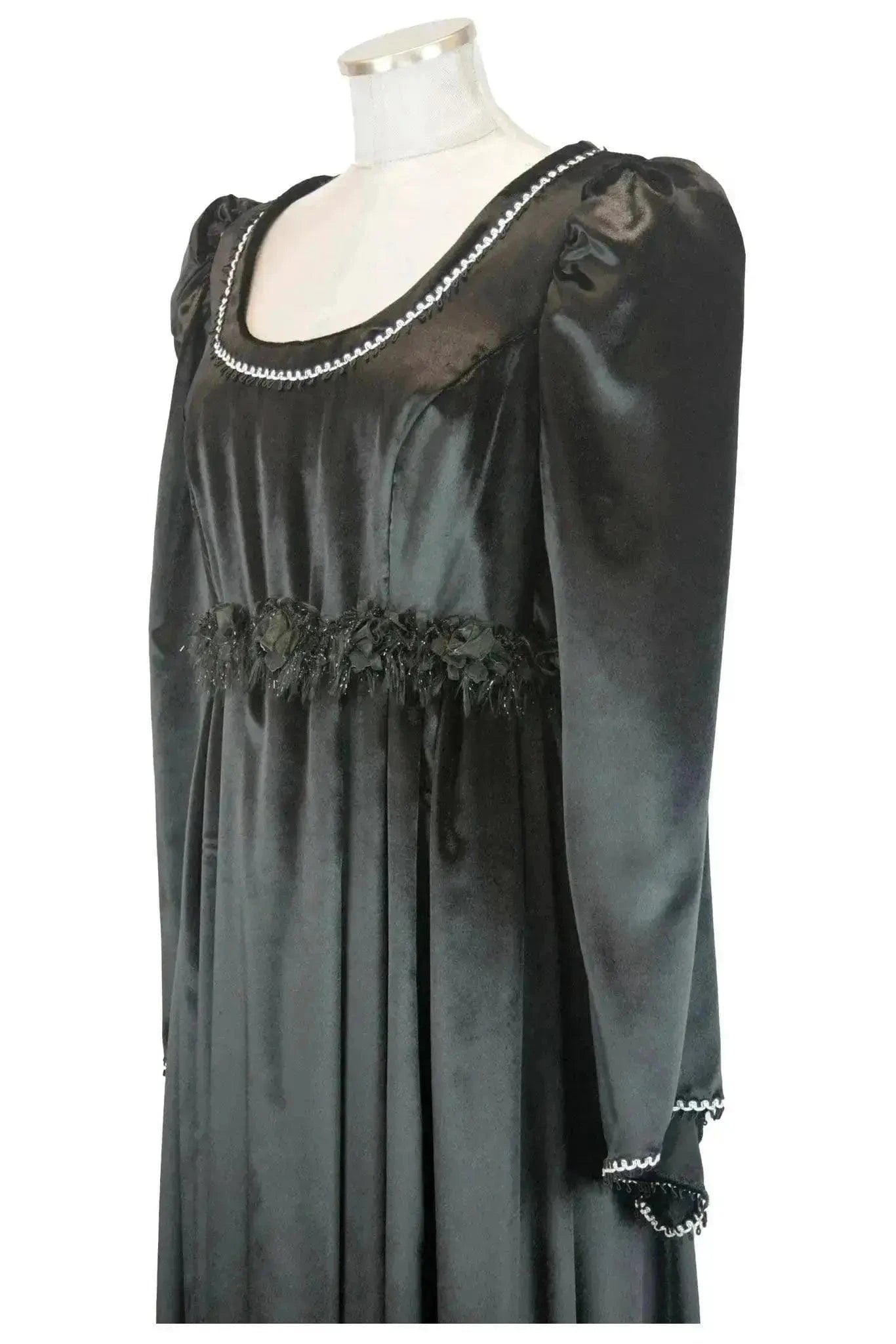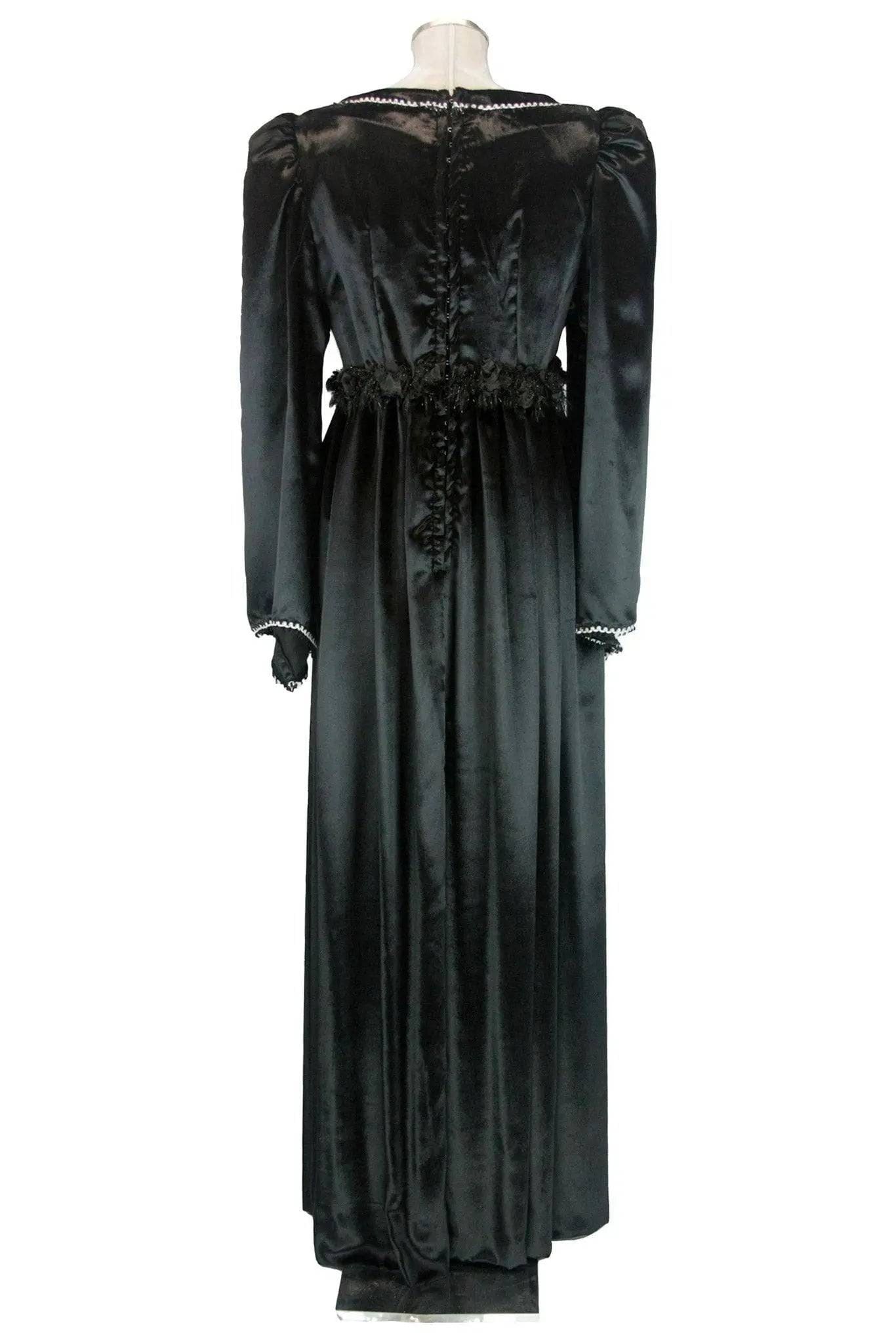 Il "Noleggio abito medievale nero in velluto per donna" è caratterizzato da un taglio lungo e fluente, con maniche lunghe che aggiungono un tocco di mistero e raffinatezza. Il busto è impreziosito da dettagli delicati che richiamano le decorazioni tipiche dell'abbigliamento medievale, conferendo all'abito un aspetto regale. La gonna ampia cade elegantemente fino ai piedi, creando un effetto scenografico ad ogni movimento.