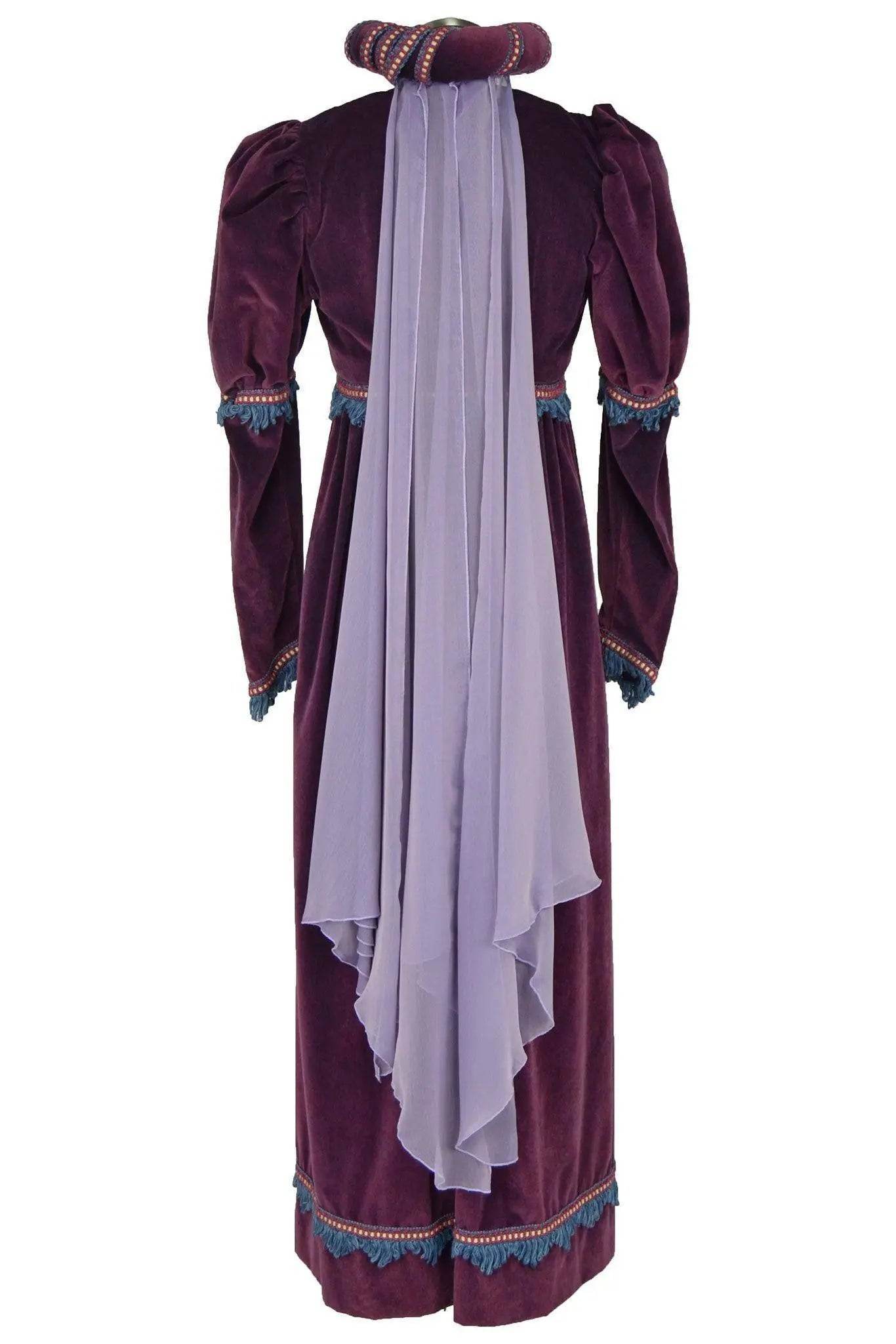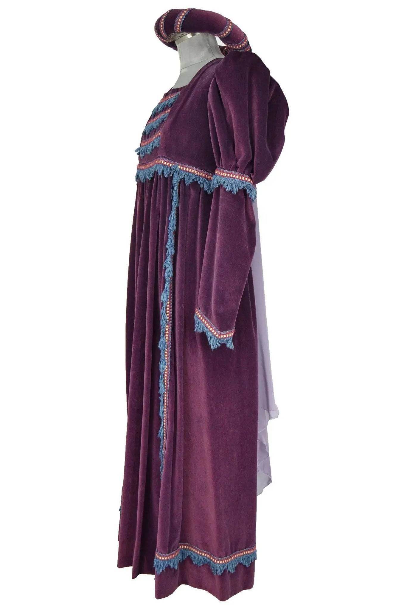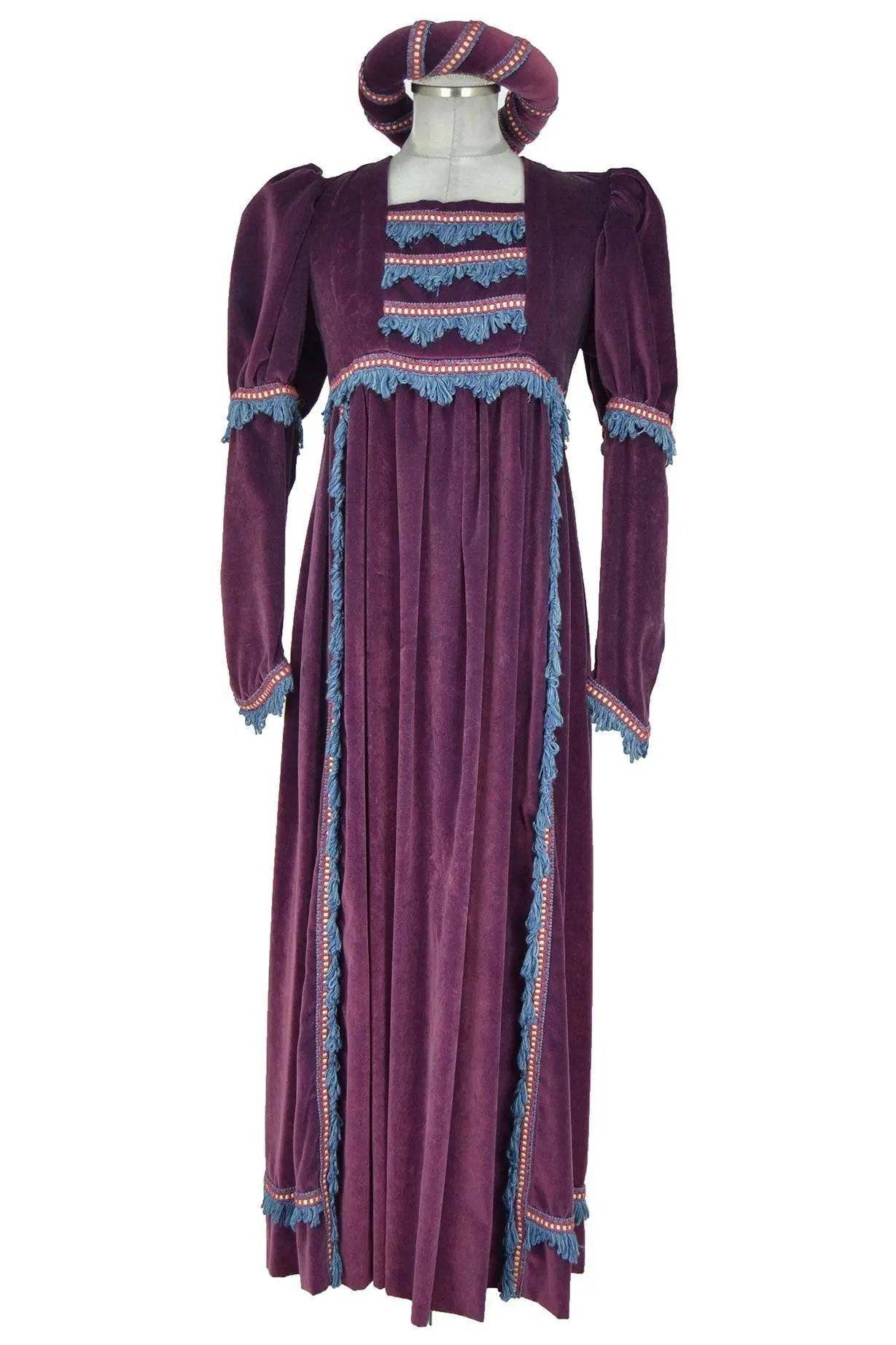 Noleggio Abito donna del rinascimento di linea sciolta in velluto liscio di una bellissima tonalità viola vino. Maniche, vita, orli e busto sono sottolineati da frange a smerlo in un azzurro polvere delicatamente a contrasto, abbinate a passamaneria che si ripete sull'acconciatura a ciambella tipica del periodo.