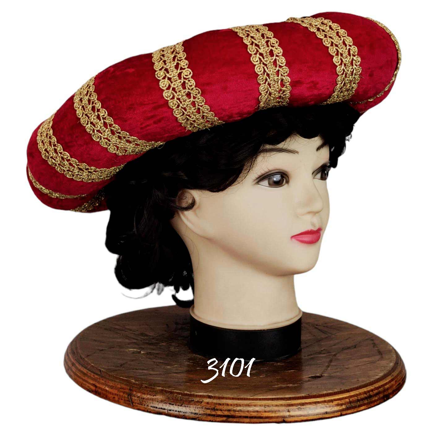 Questo noleggio copricapo storico in velluto rosso con decorazioni dorate è un pezzo di grande impatto visivo, ideale per eventi storici, rievocazioni, rappresentazioni teatrali o produzioni cinematografiche. Realizzato con materiali di alta qualità, il velluto rosso conferisce eleganza e maestosità al design, mentre i dettagli dorati aggiungono un tocco di raffinatezza. Questo copricapo storico in velluto rosso con decorazioni dorate è stato progettato per rievocare lo stile nobiliare di epoche passate, rendendolo perfetto per qualsiasi evento in cui si desidera catturare lo spirito della storia.