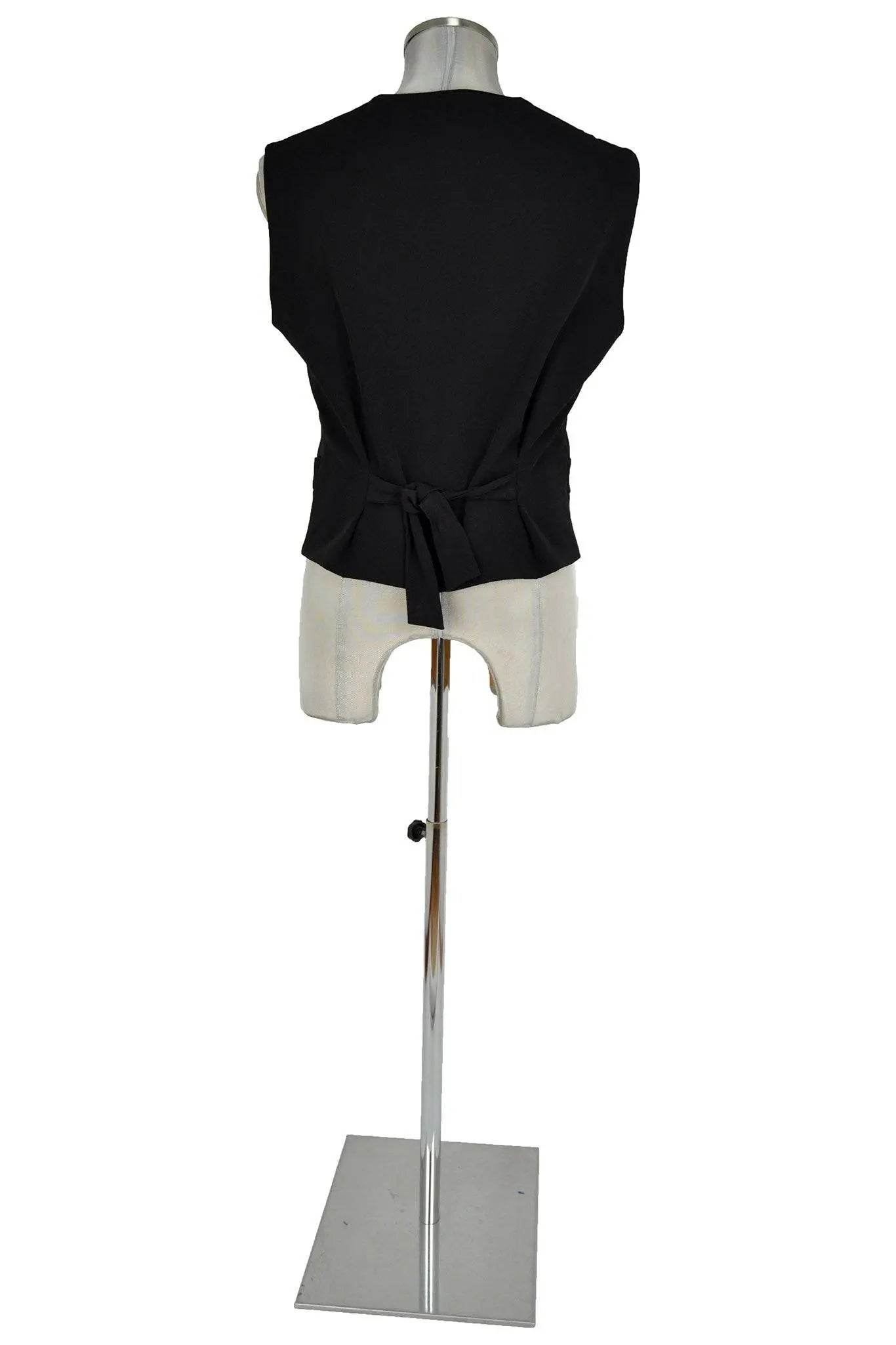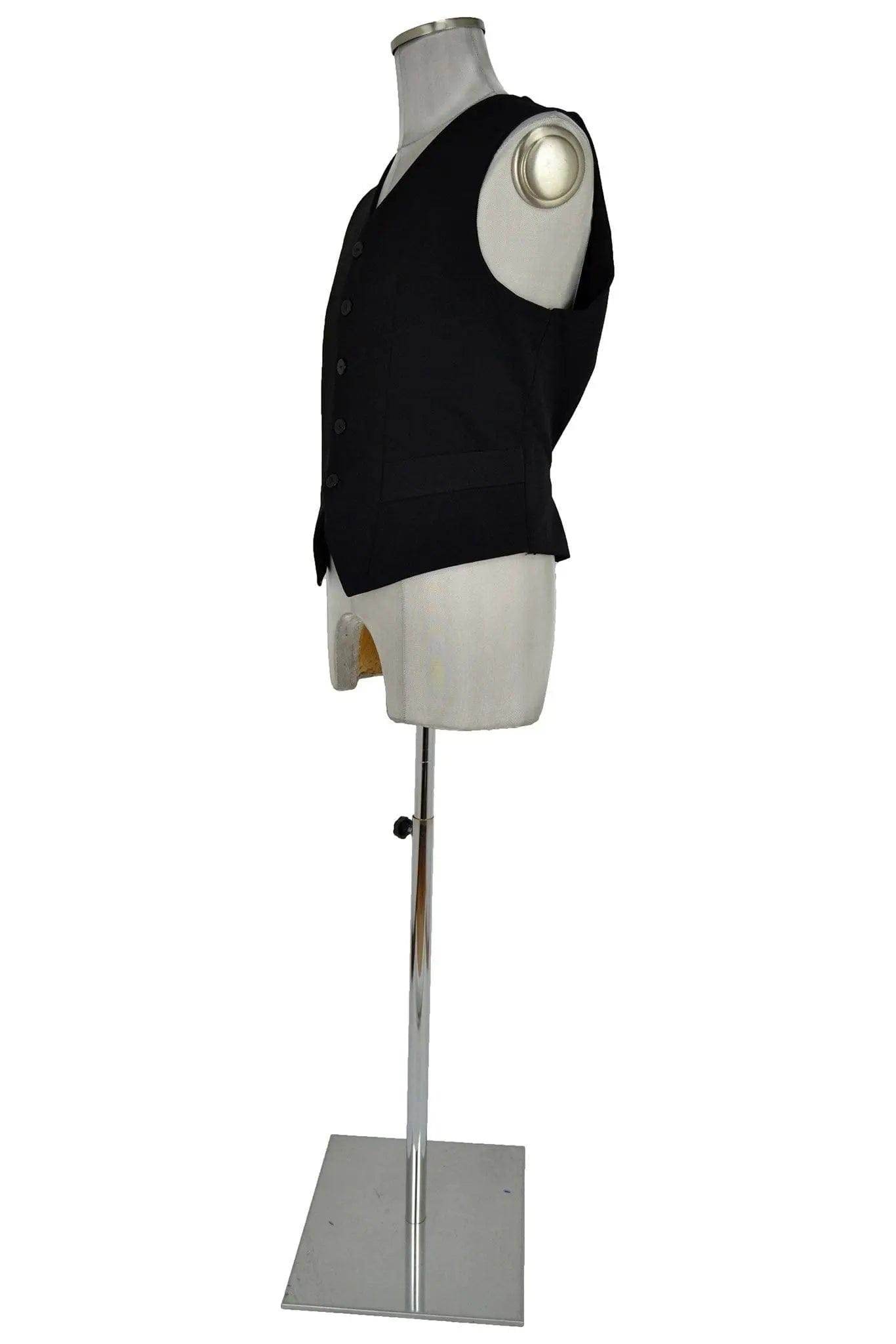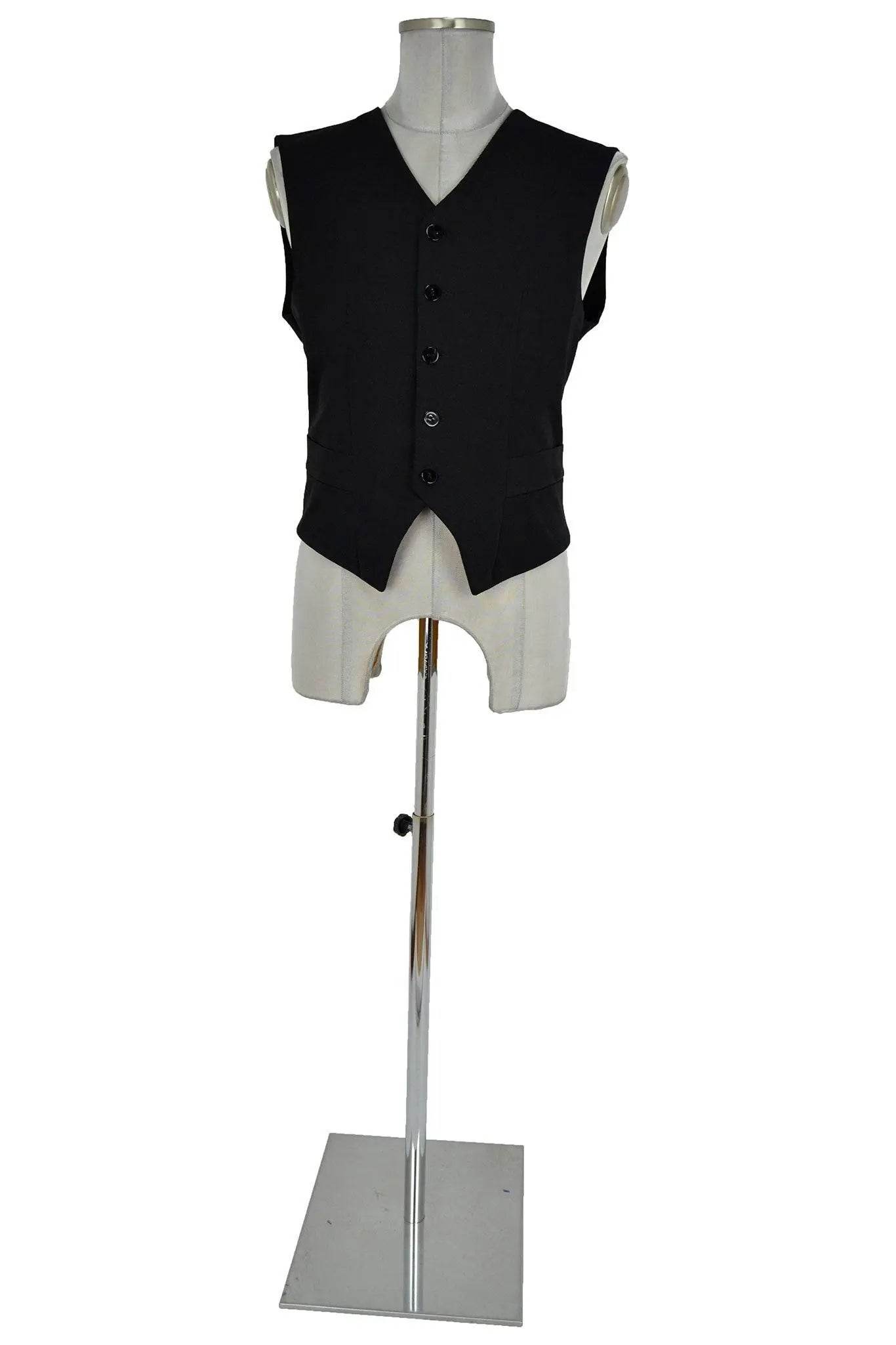 Gilet maschile in bel panno nero, monopetto accollato, con falde diagonali e cinque bottoni il cui numero già aumenta l'eleganza. Da indossare da solo o con giacca. Per cerimonie odierne o per intepretare personaggi soprattutto del XIX e XX secolo come nobili, medici, avvocati, ecclesiastici.