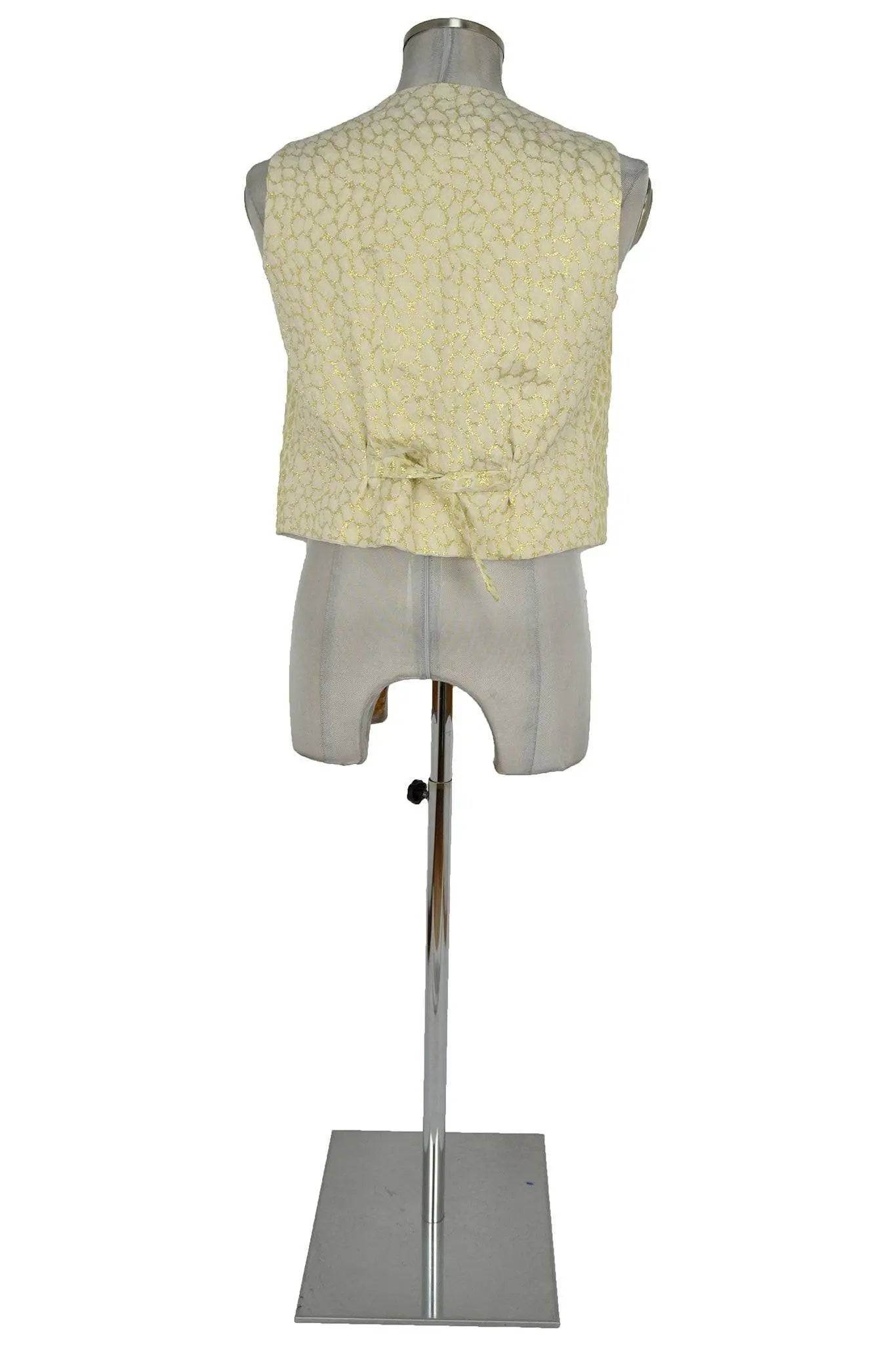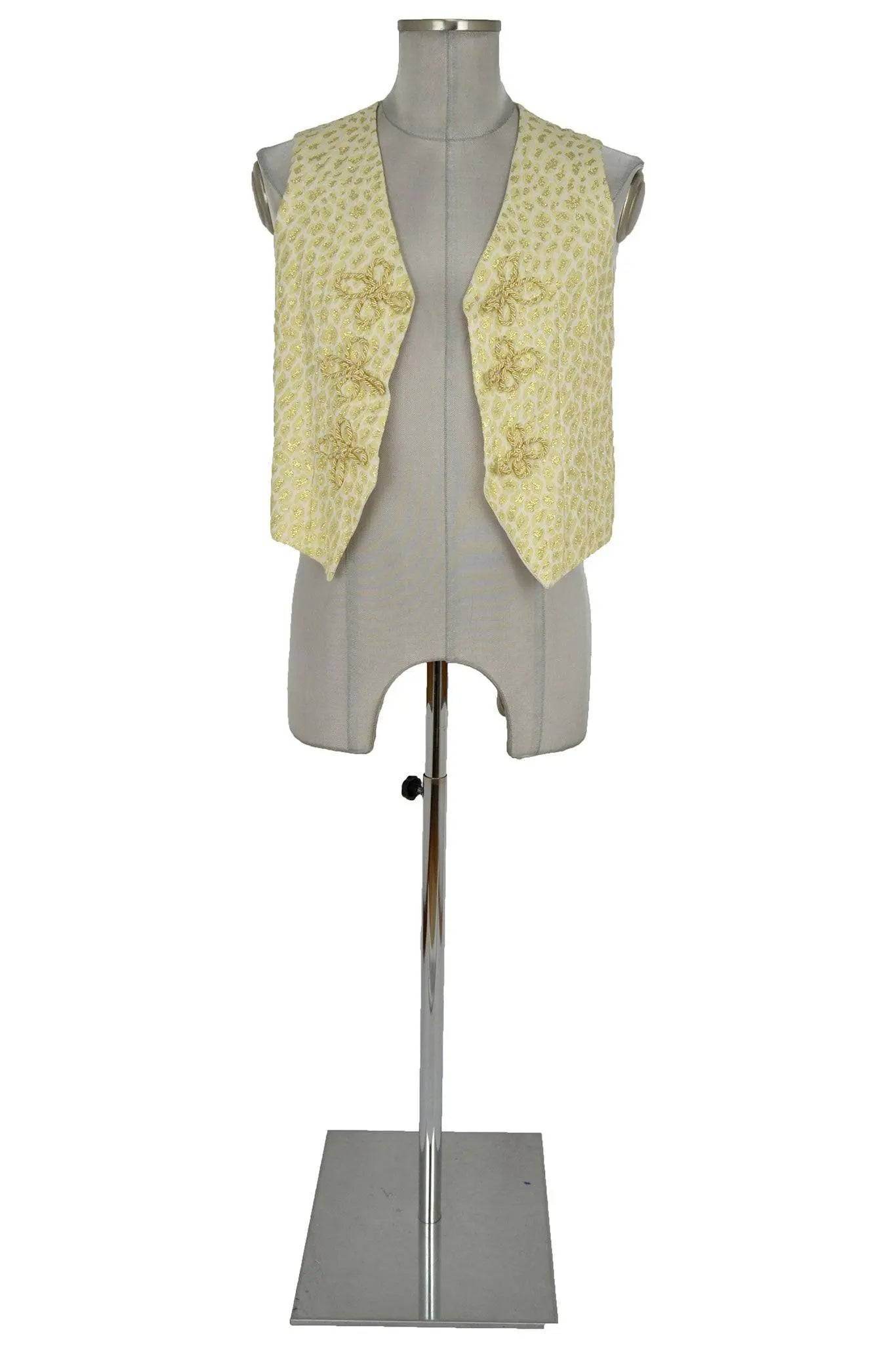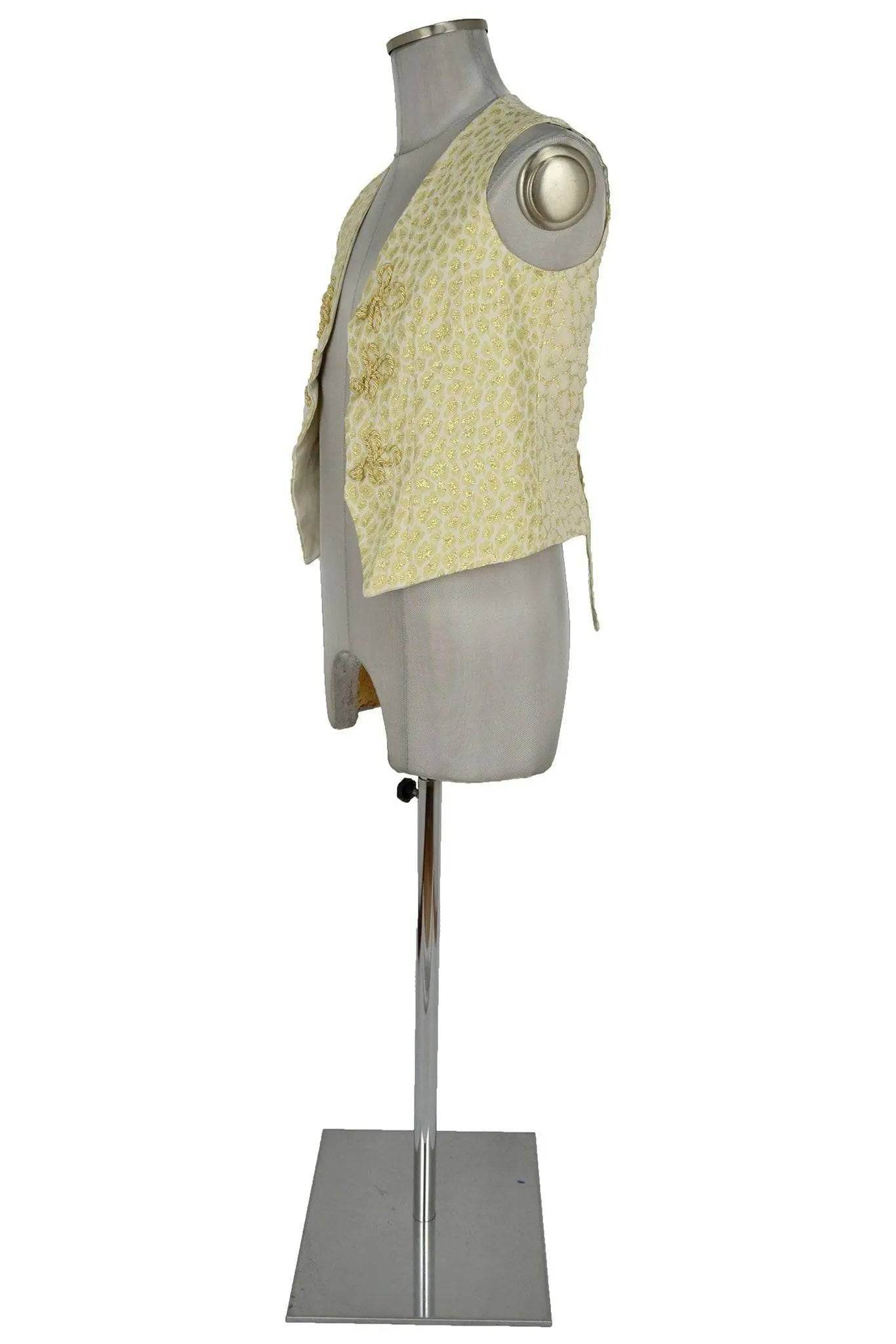 Gilet in tessuto dorato a piccoli motivi animalier, unisex ma di taglio diritto e quindi preferibilmente maschile; monopetto e senza revers, presenta tre coppie di alamari in cordone, a forma di fiore. Per personaggi arabi e orientali, domatori da circo, clown, mimi, presentatori di varietà, divi del rock.