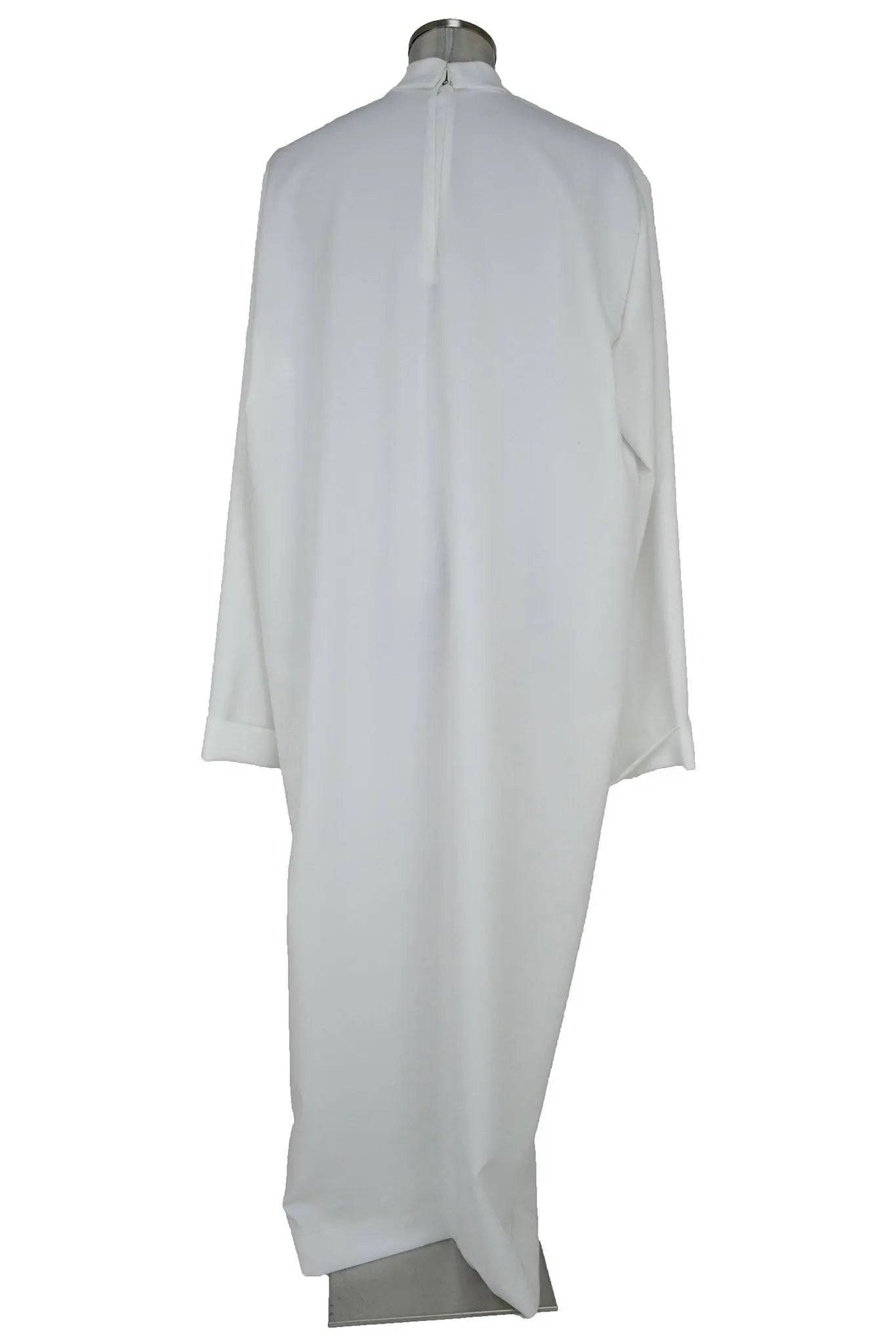 Tunica bianca unisex lunga fino ai piedi con maniche lunghe risvoltabili e collo a lupetto in stile ecclesiastico. Si presta come base per molteplici travestimenti: dall'angelo al cantore di chiesa, dal santo al personaggio fantascientifico, indossata da sola o con sopratunica colorata, ali, cinture.