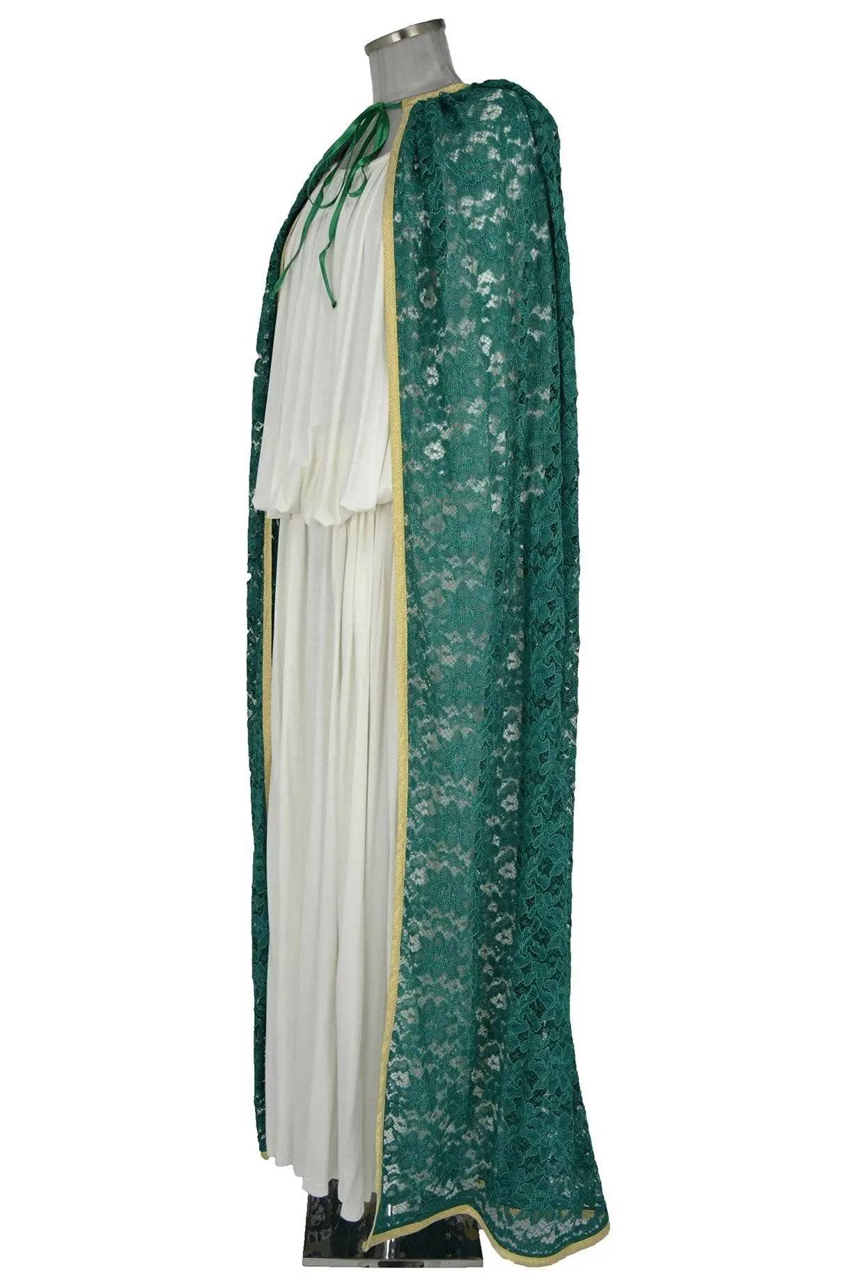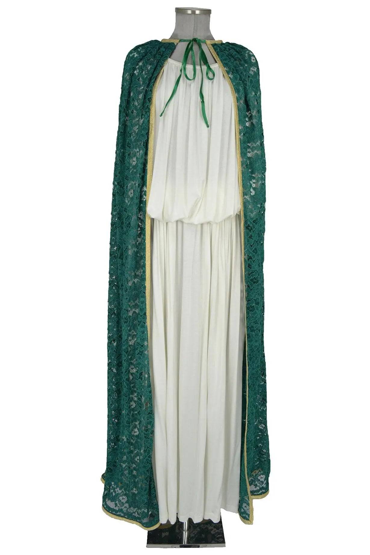 Noleggio abito uomo donna epoca bizantina o tardo Medioevo per rievocazioni storiche composto da una lunga tunica bianca con scollo tondo e arricciato, mantello in tessuto dévoré bordato da passamaneria oro e dotato di nastro da allacciare al collo. Con i giusti accessori può trasformarsi in costume per vari personaggi.
