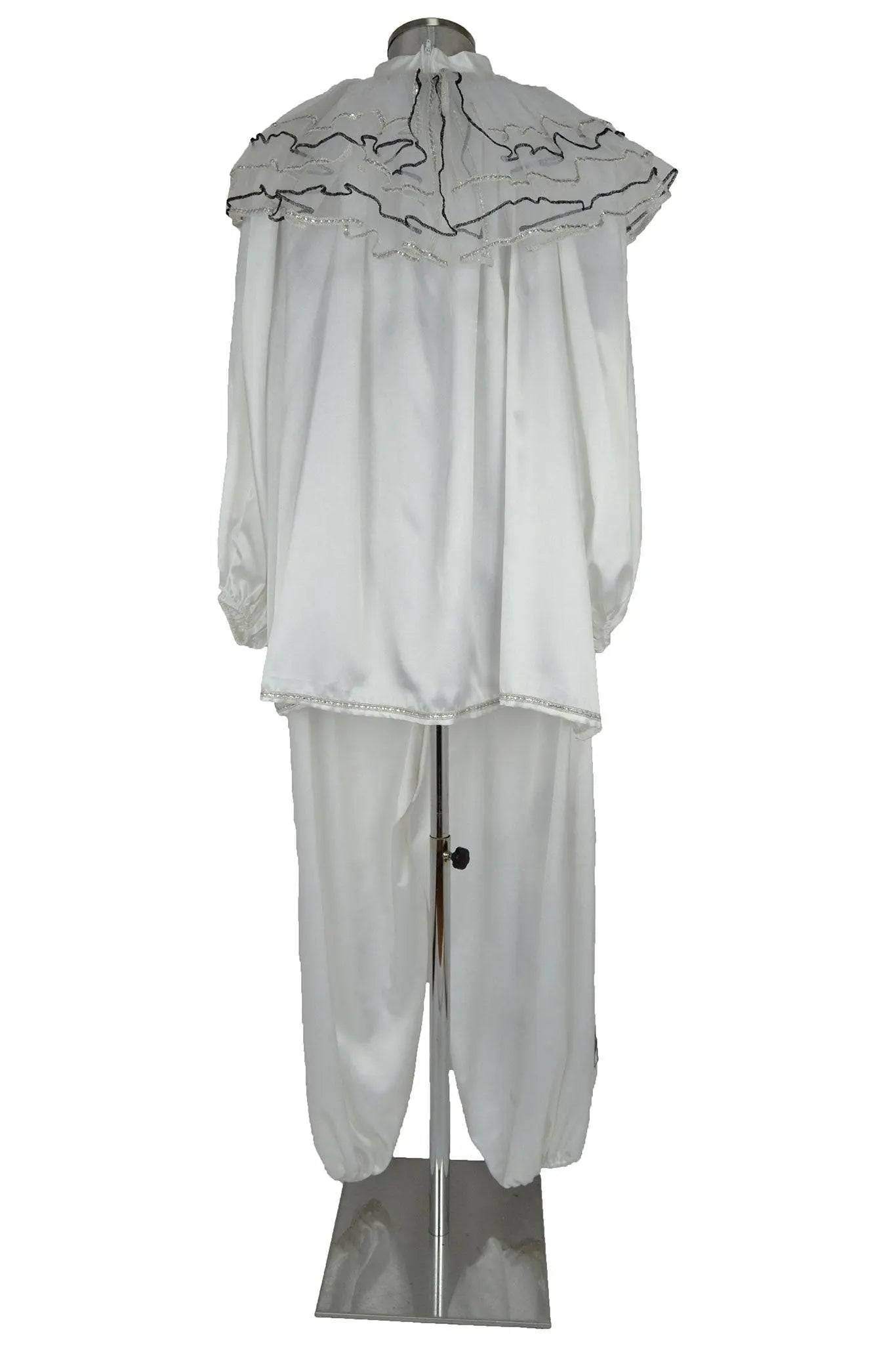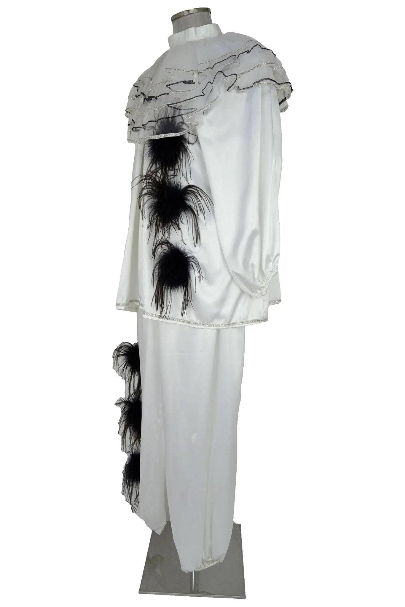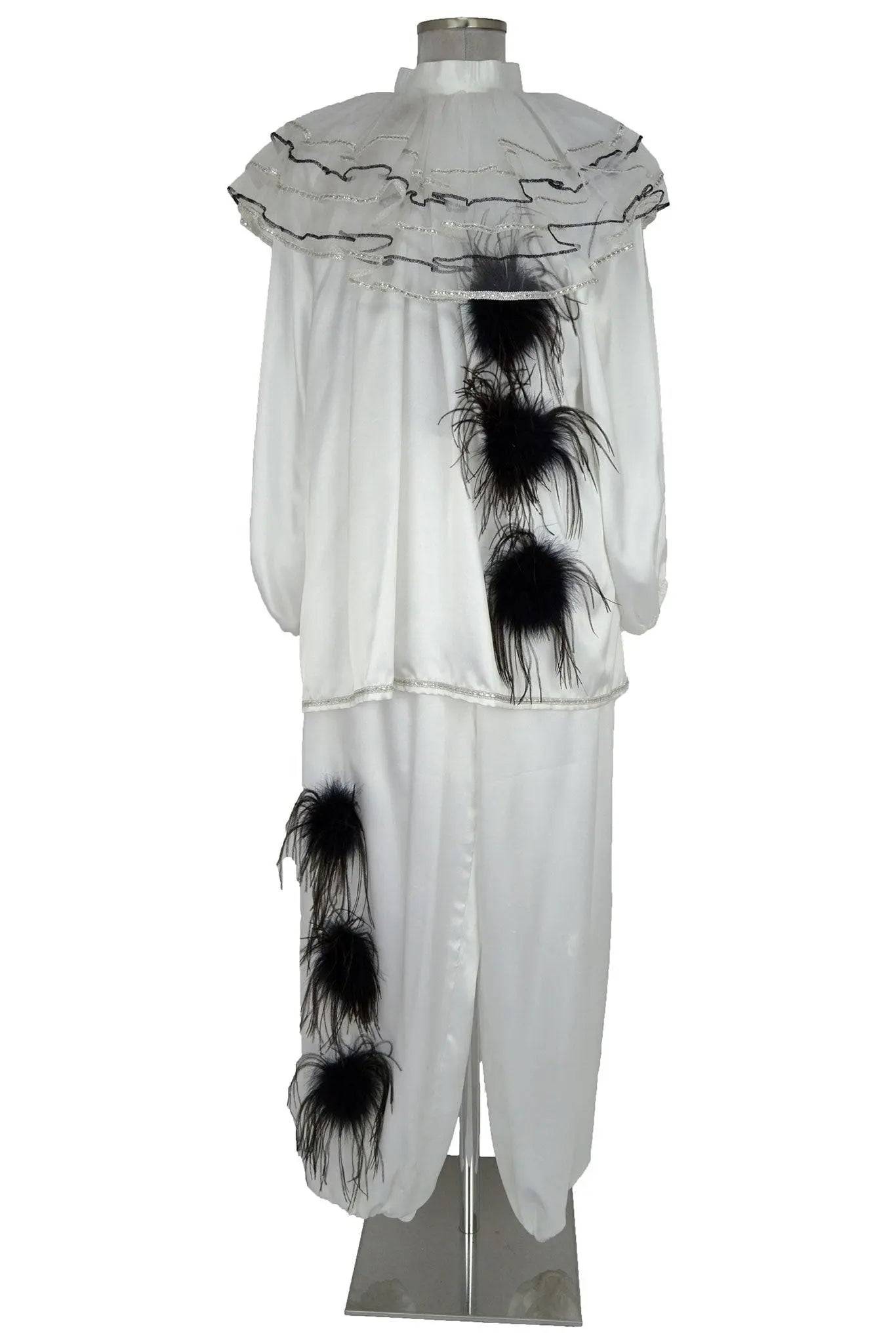 Noleggio costume uomo donna Pierrot o Pierrette, composto da calzoni e giubba molto ampi ma ripresi con elastici ai polsi e alle caviglie; la collaretta a più strati di tulle bianco è profilata in nero e argento, i tradizionali grandi bottoni-pompon qui sono rivisitati come sbuffi di pelliccia e di piume.