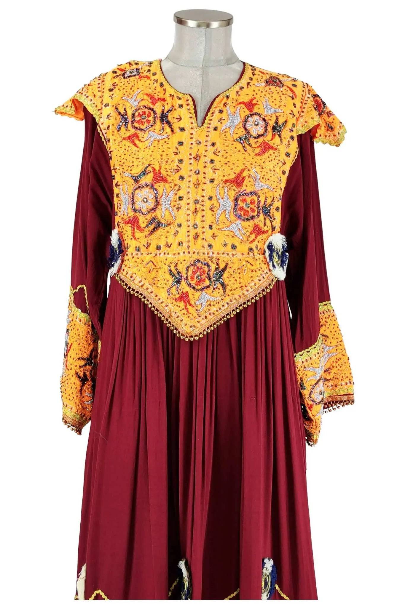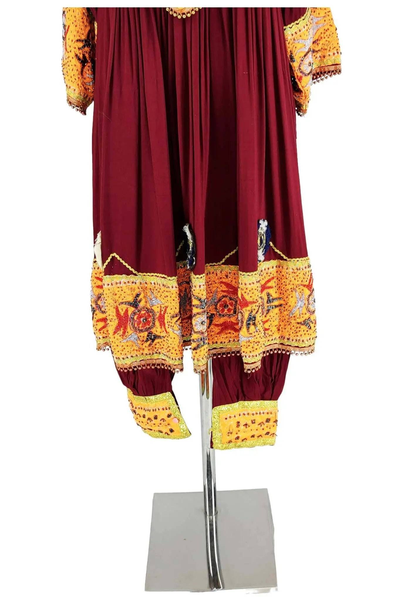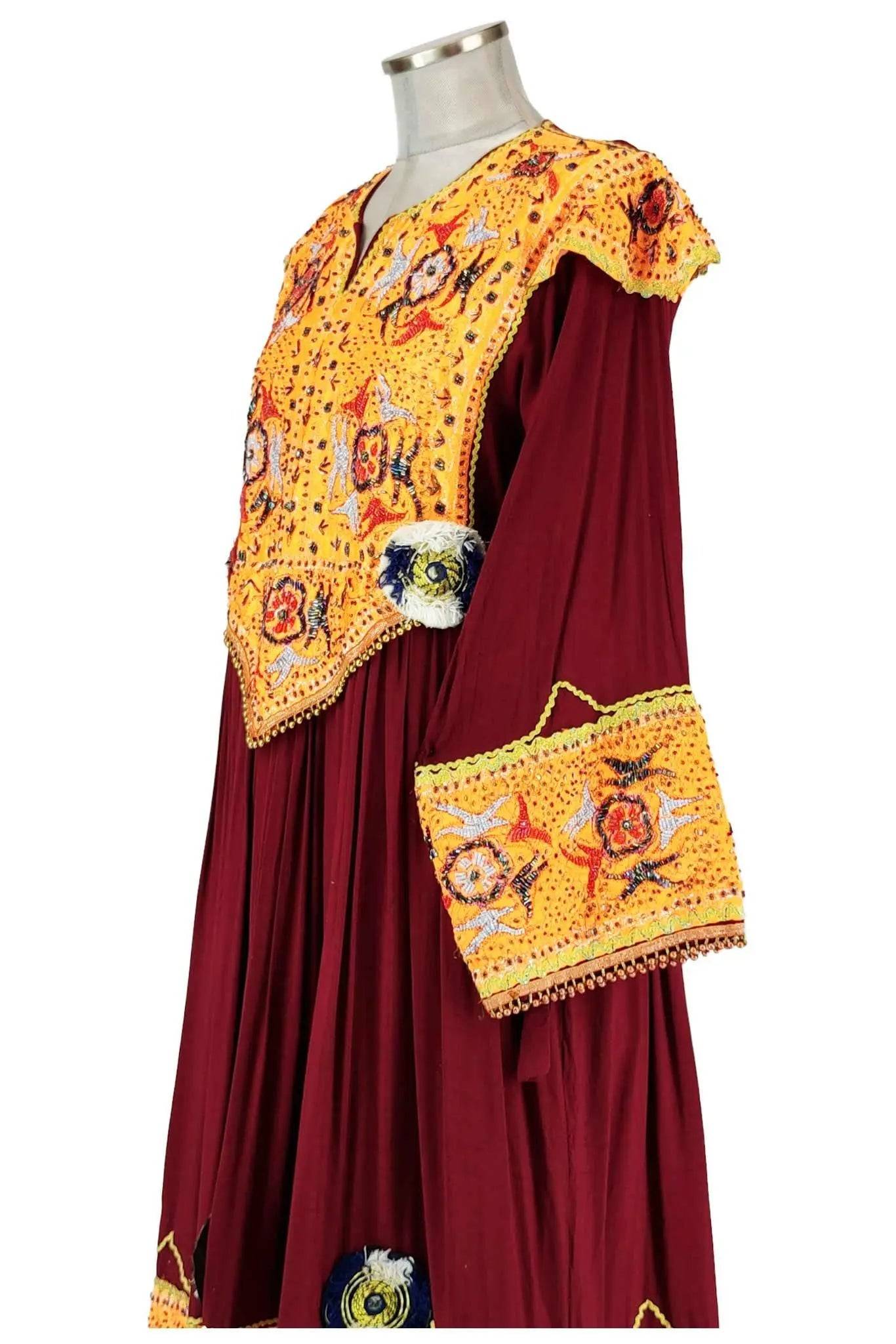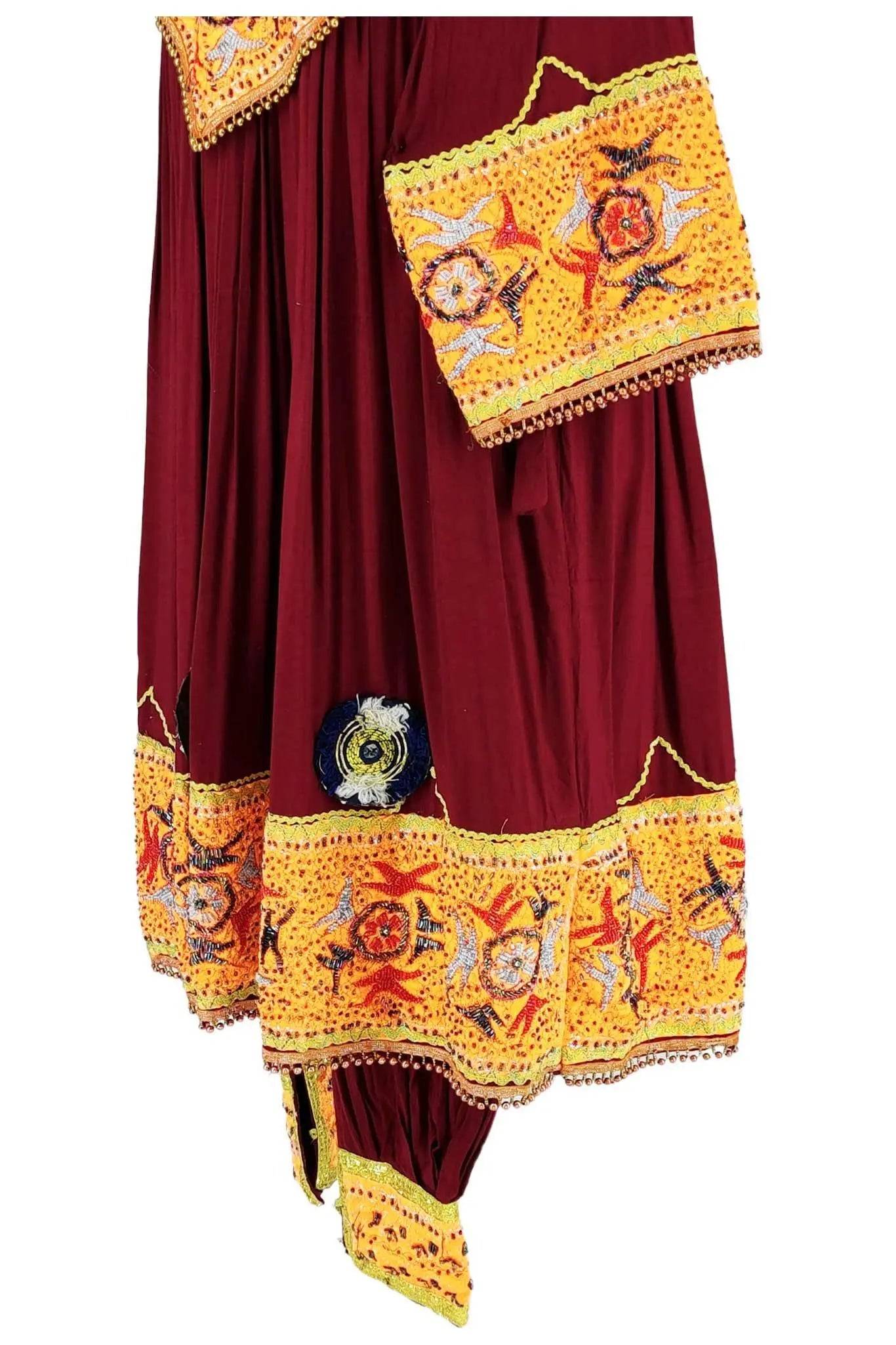 L'abito è realizzato in tessuto pregiato di colore rosso scuro, arricchito da ricami dettagliati in colori arancioni, gialli e bianchi. Il design ampio e fluido offre una vestibilità comoda e adatta a diverse fisicità. I ricami intricati e i dettagli decorativi aggiungono un tocco di eleganza e raffinatezza, rendendo questo abito perfetto per chi cerca un capo di abbigliamento che unisca tradizione e stile.