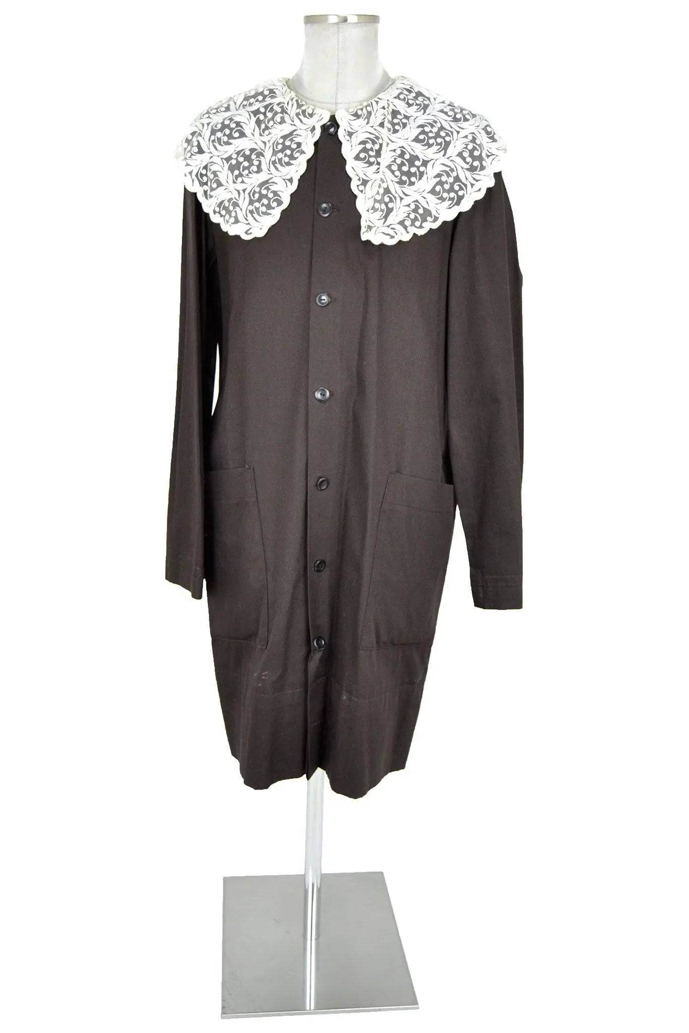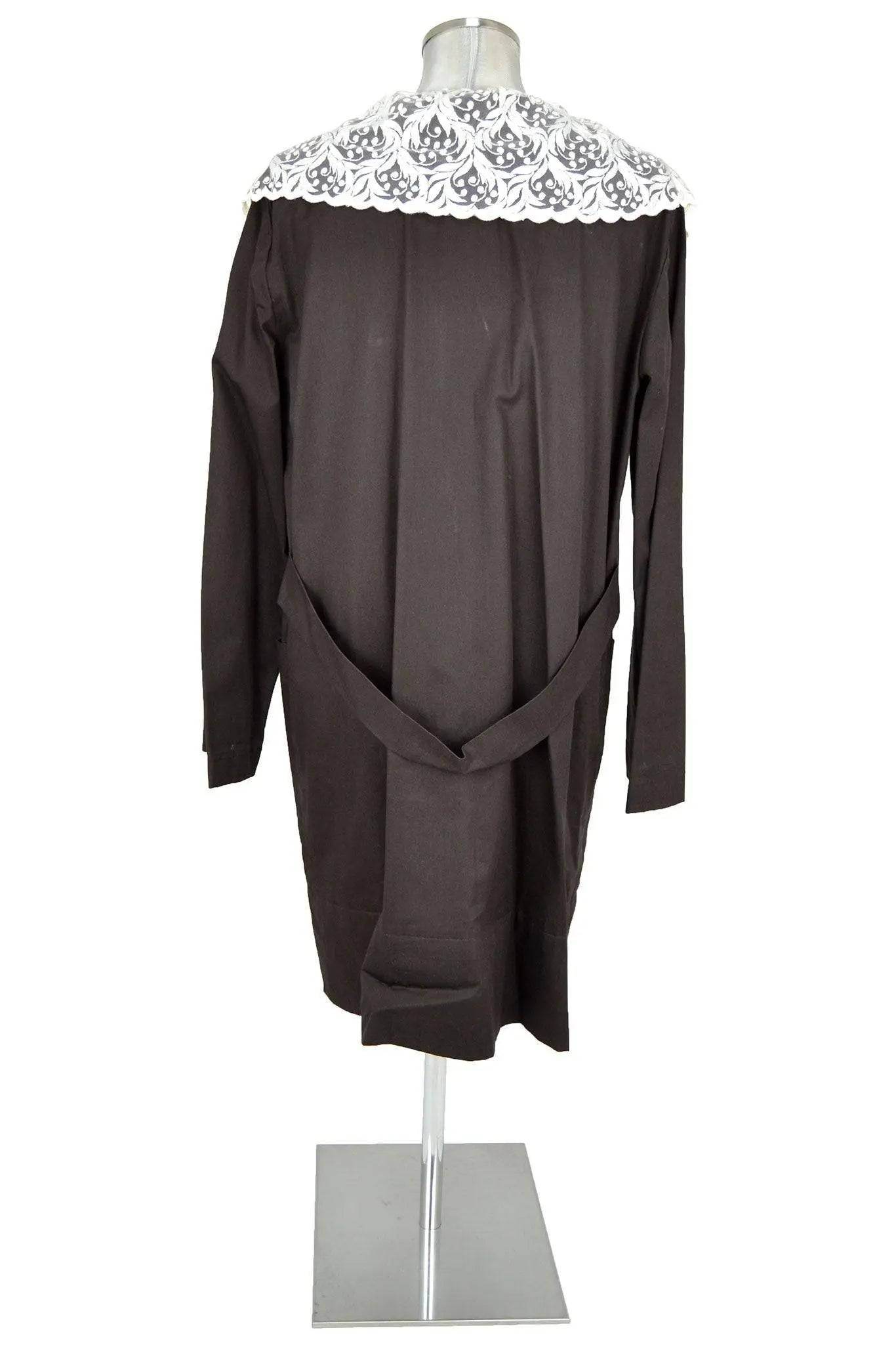 Riscopri il fascino senza tempo con il Noleggio grembiule marrone con colletto ricamato, un capo unisex dal sapore vintage che rievoca l’eleganza sobria degli abiti da lavoro dei primi del Novecento. Questo grembiule, realizzato in tessuto marrone scuro, è caratterizzato da linee semplici, maniche lunghe e una chiusura frontale a bottoni, che lo rendono comodo e funzionale per interpretazioni teatrali o rievocazioni storiche. Ma il dettaglio che lo distingue è l’ampio colletto bianco ricamato, decorato con motivi floreali dal gusto retrò, che dona raffinatezza e un tocco di originalità a un capo altrimenti essenziale.