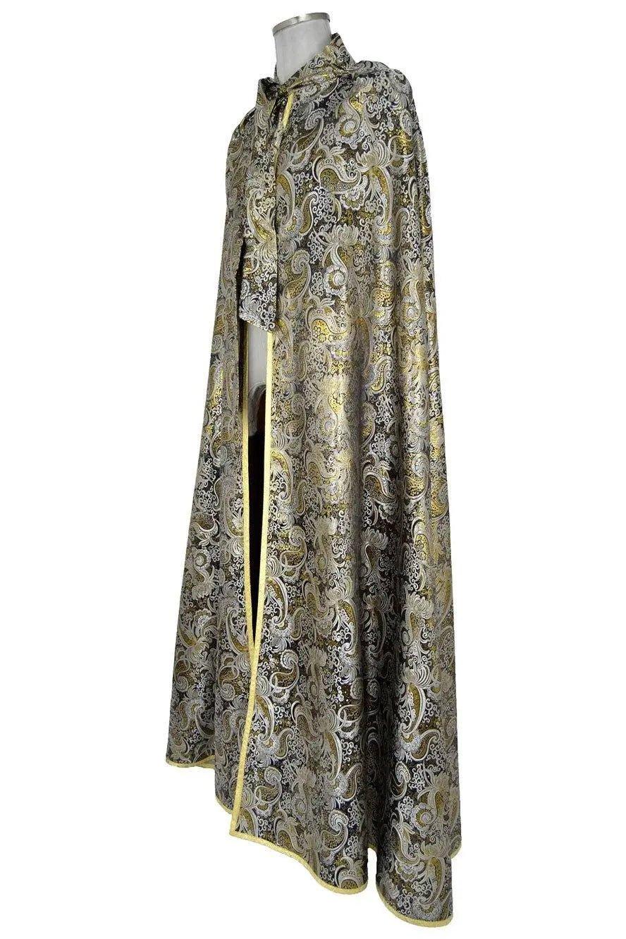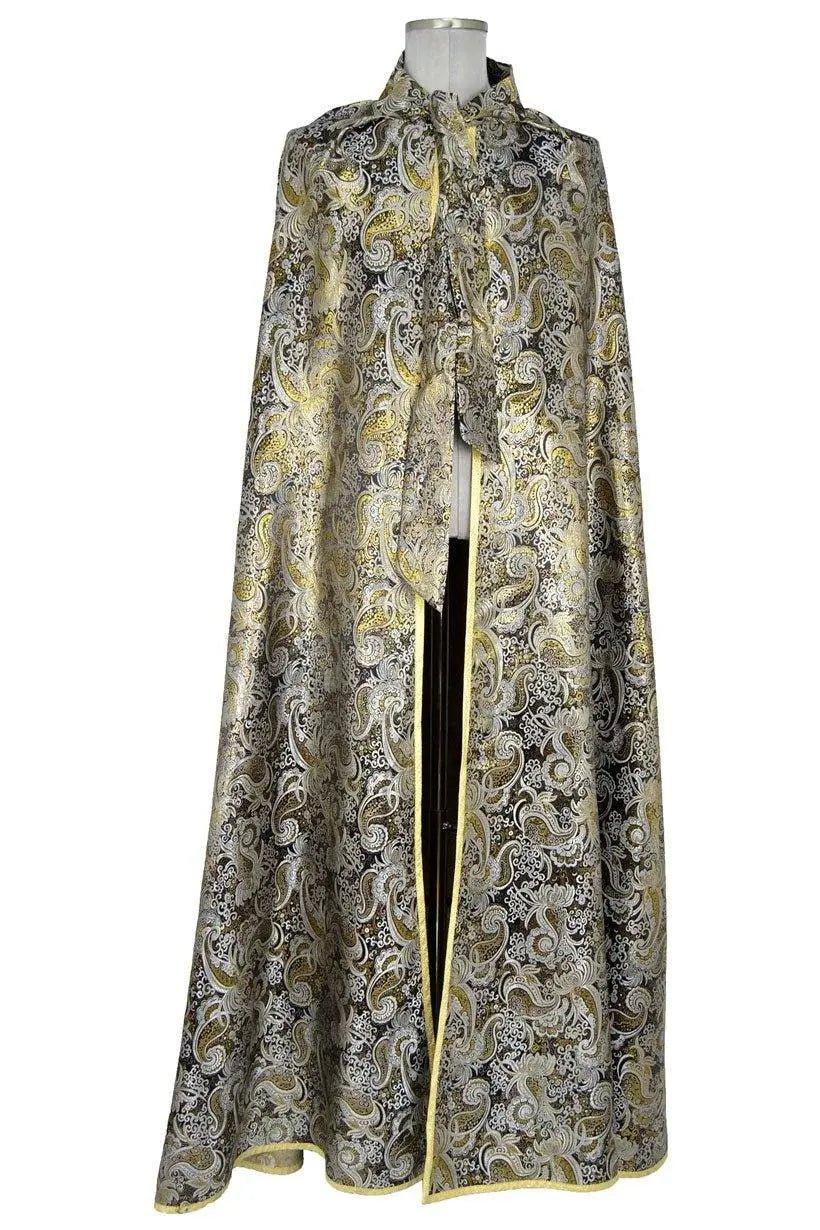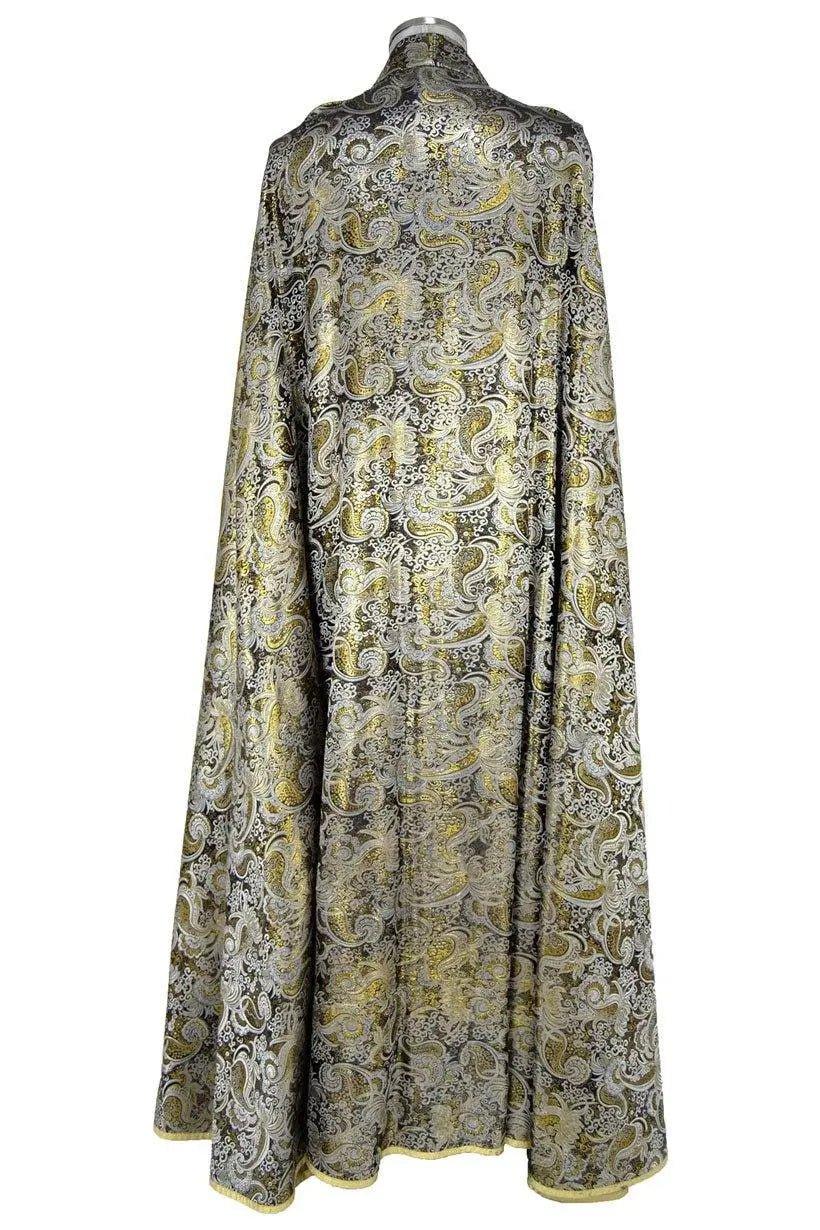Noleggio mantello uomo donna lungo fino alle caviglie in raffinato tessuto lucido a disegni paisley sui toni dell'argento, con bordura e fiocco; si presta a coprire un abito da dama come un kimono, un frac come una corazza, ed è specialmente indicato per personaggi orientali.