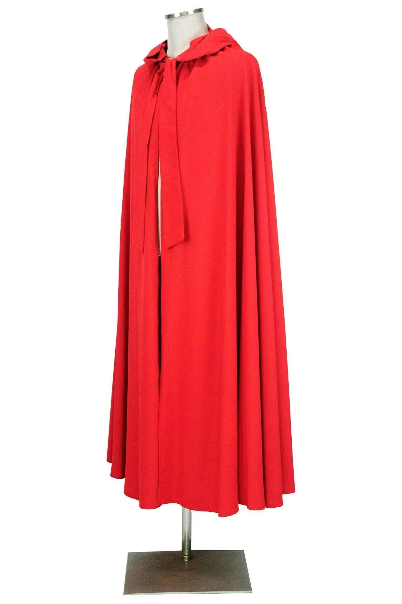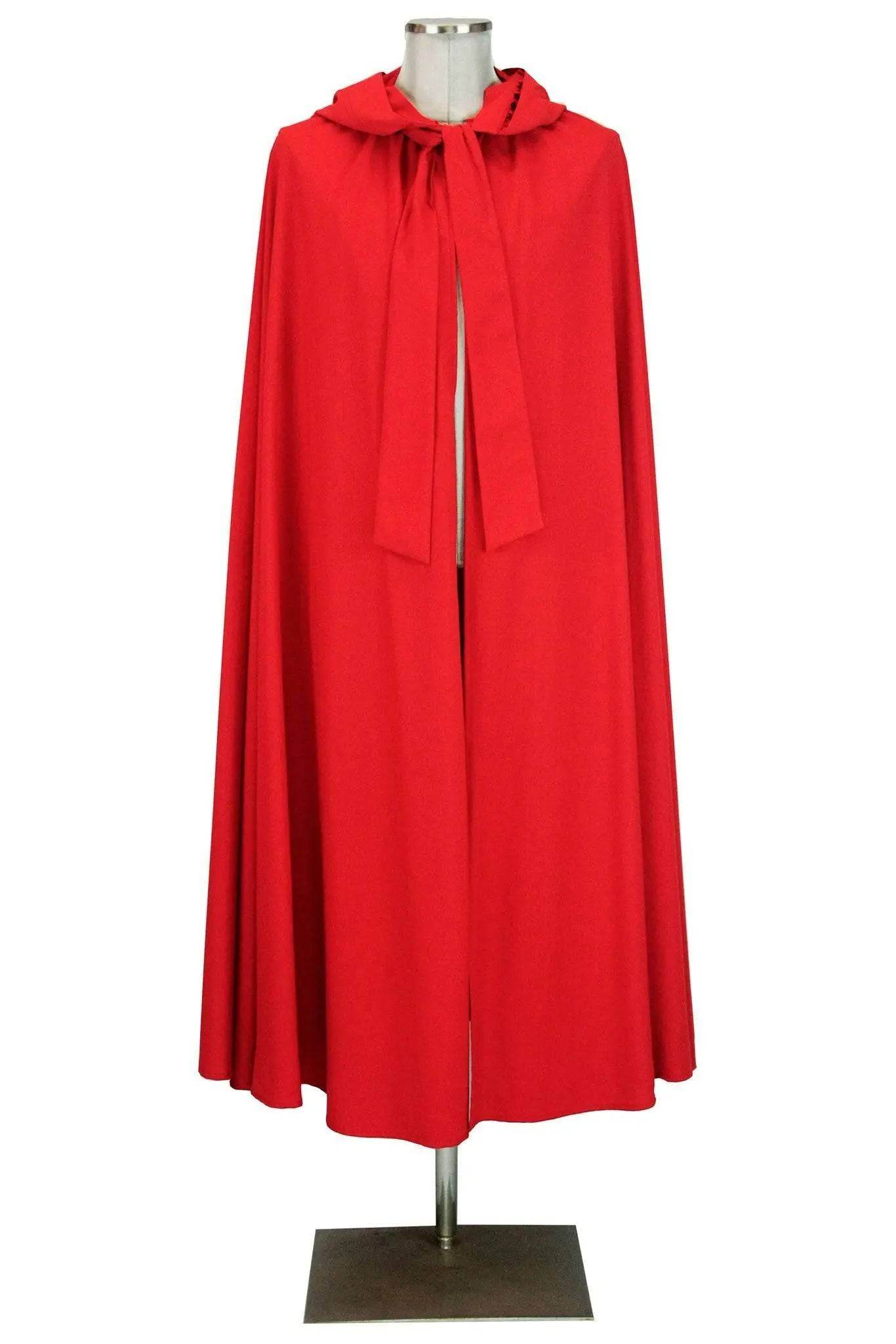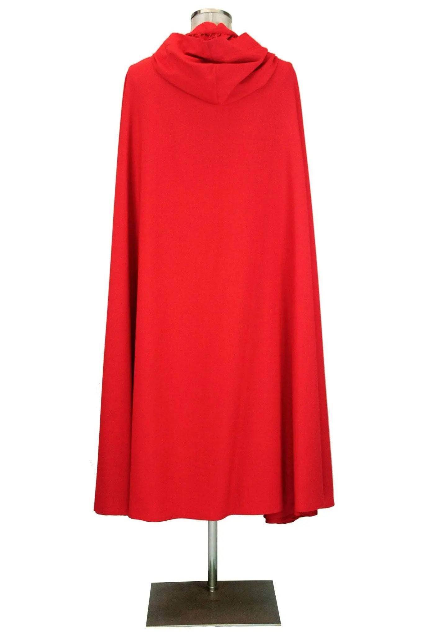 Noleggio mantello uomo donna di colore rosso smagliante che grazie all'ottima stoffa ricade in morbide e ricche pieghe. E' dotato di cappuccio e di un alto laccio dello stesso tessuto per allacciare al collo. Si presta per personaggi vari, dal mago alla principessa, da Casanova a Cappuccetto Rosso.
