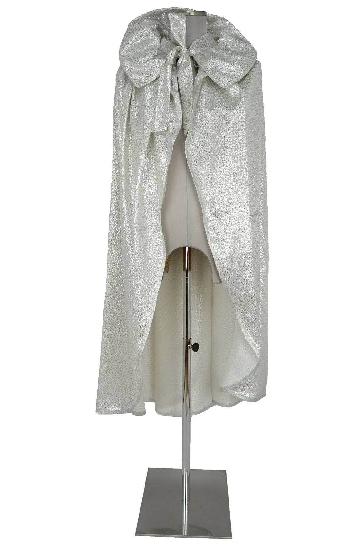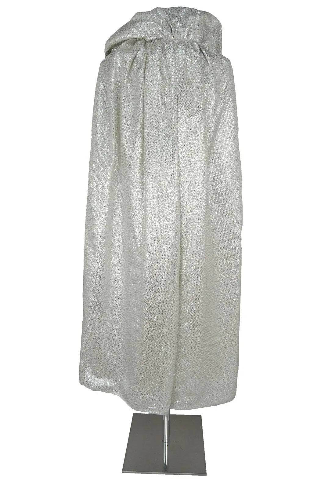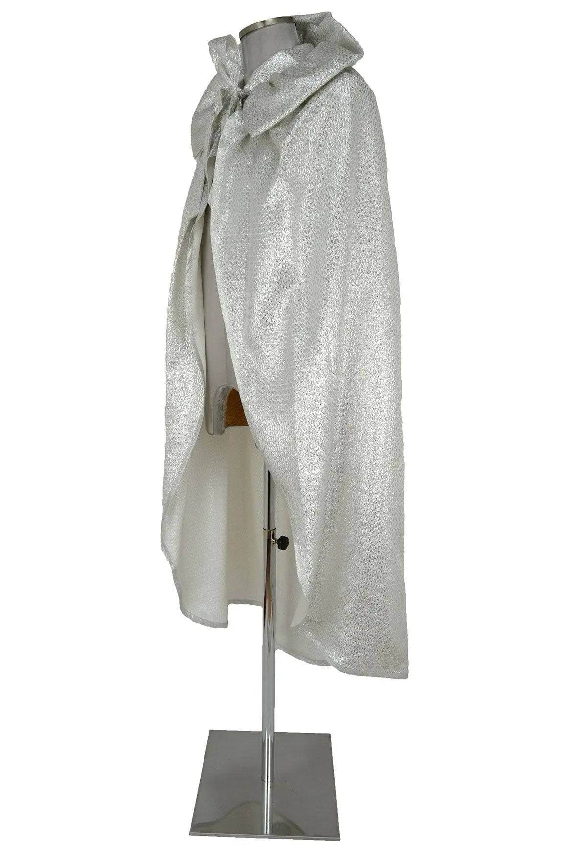 Mantello unisex in leggerissimo tessuto laminato, medio-lungo e leggermente arrotondato sul davanti; si lega al collo con un nastro del medesimo tessuto che emerge da un collettone arricciato in stile Pierrot Lunaire. Adatto a maschere moderne o legate alla magia o alla fantascienza.