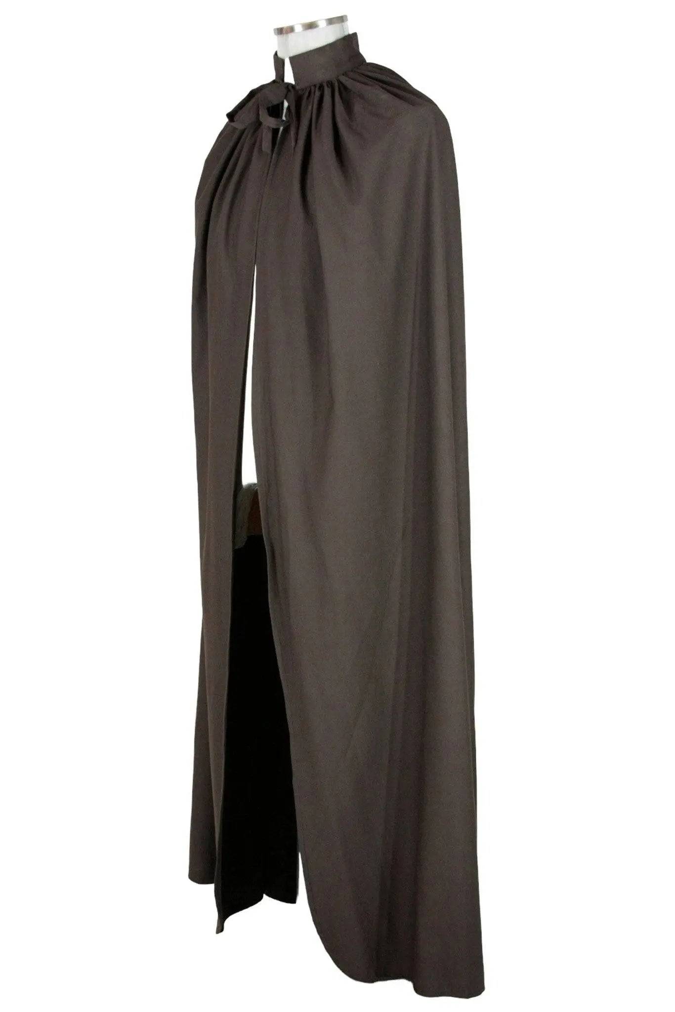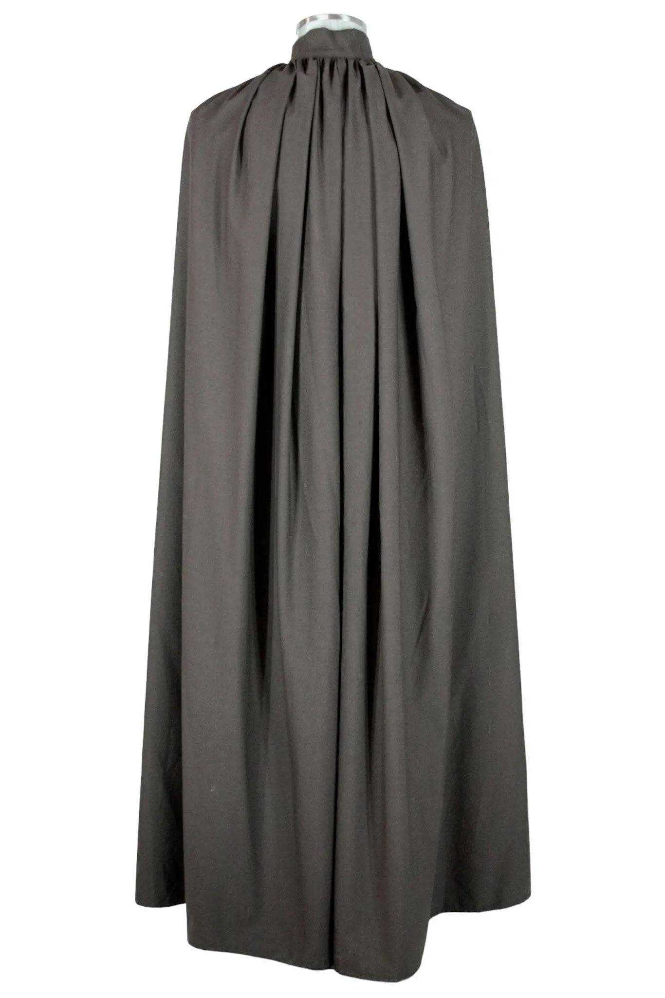 Noleggio mantello uomo donna lungo e ampio, con arricciatura sulla schiena, di color grigio tortora che può essere raffinato ma anche anonimo, a seconda del personaggio; davvero versatile, dal monaco al principe alla dama. Si caratterizza per il colletto alto e rigido e allacciatura annodata. Adatto anche a rievocazioni storiche.