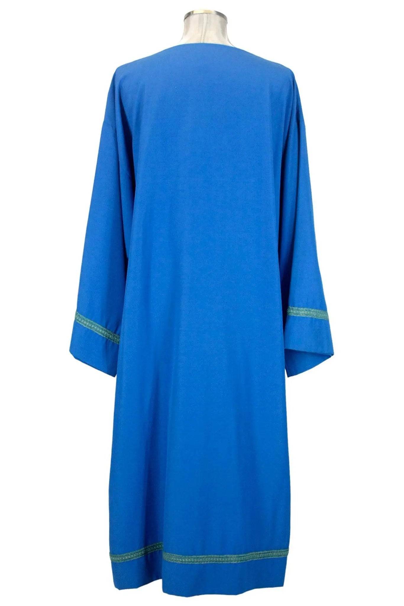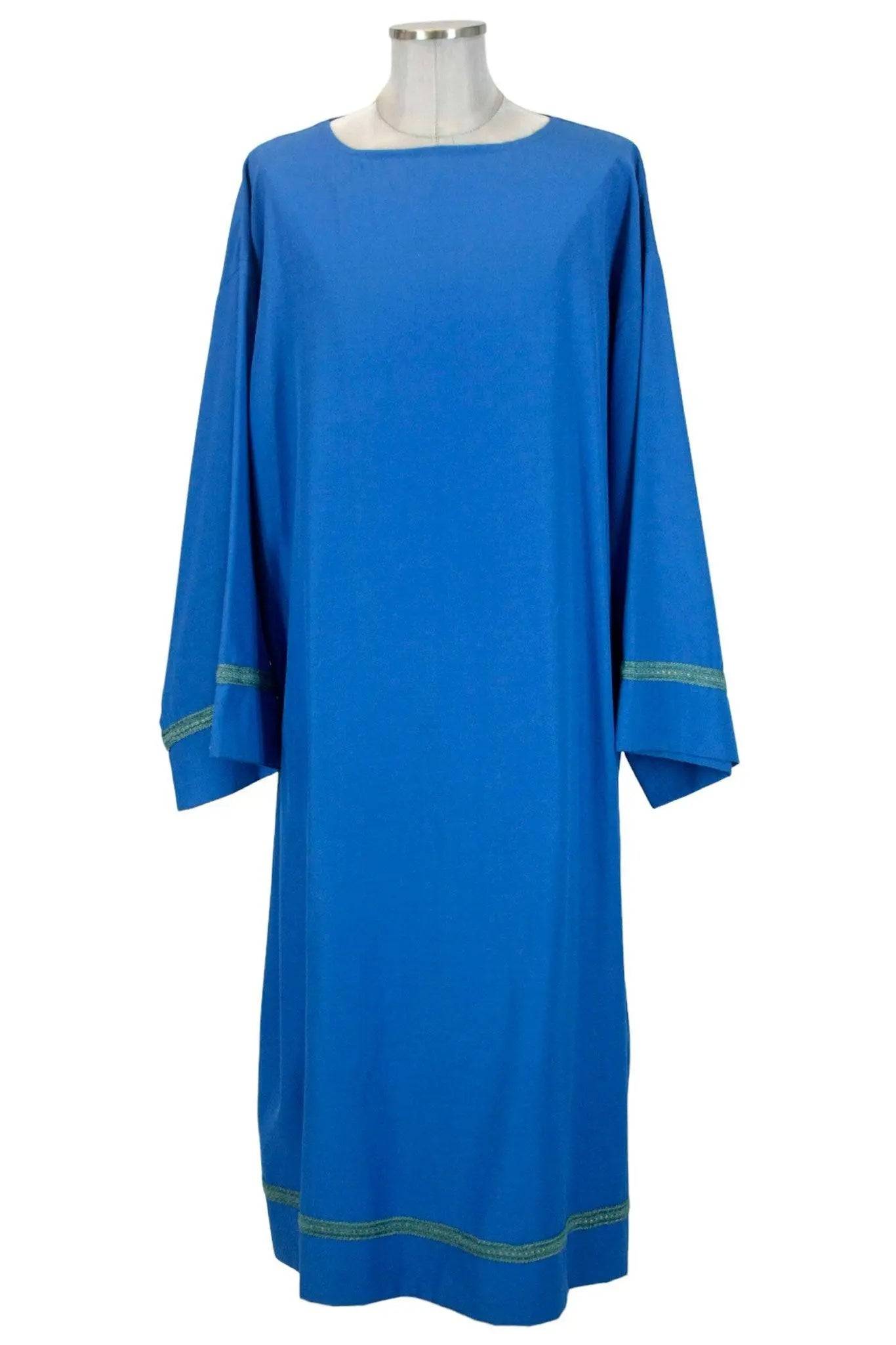 Noleggio tunica lunga fino alle caviglie, uomo donna, con scollo a barchetta e lunghe maniche, è profilata da una sottile passamaneria a contrasto. Di una gradevole tonalità azzurra, può essere un abito semplice oppure la sottotunica di un completo più ricco, per antichi dignitari, angeli, sacerdoti, popolani.