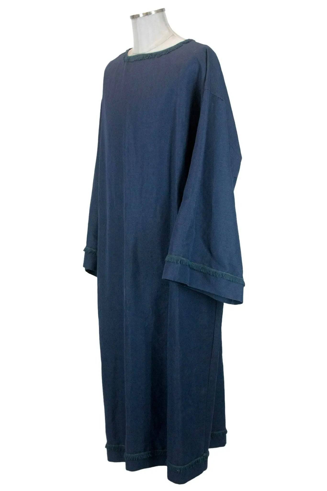 Noleggio tunica blu uomo donna adatto per recite, presepe vivente, rappresentazioni della Passione, carri mascherati e simili. La lunga tunica blu carta da zucchero presenta maniche lunghe leggermente scampanate e scollo a barchetta, sottilineati come l'orlo da passamaneria in tinta a piccole frange.