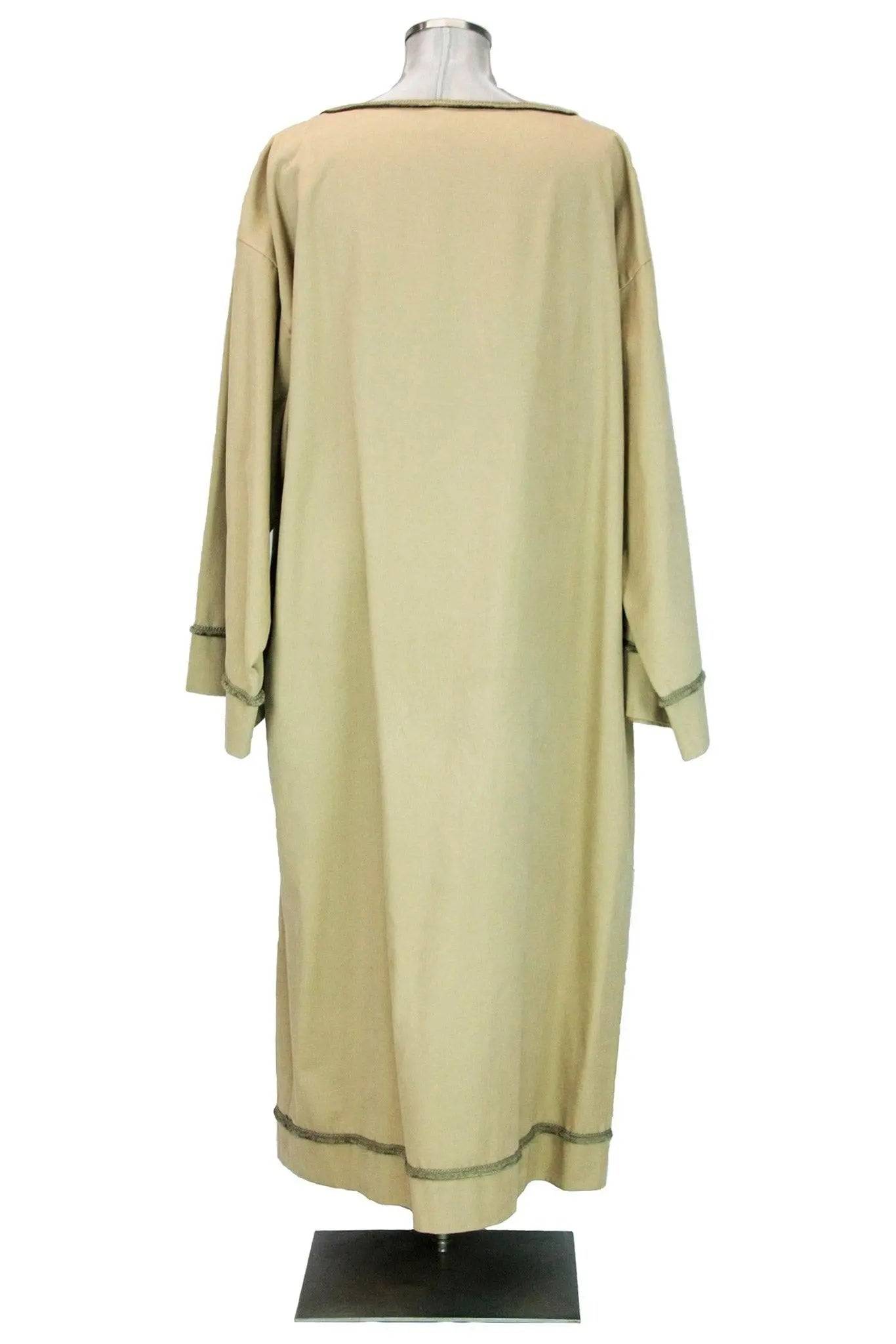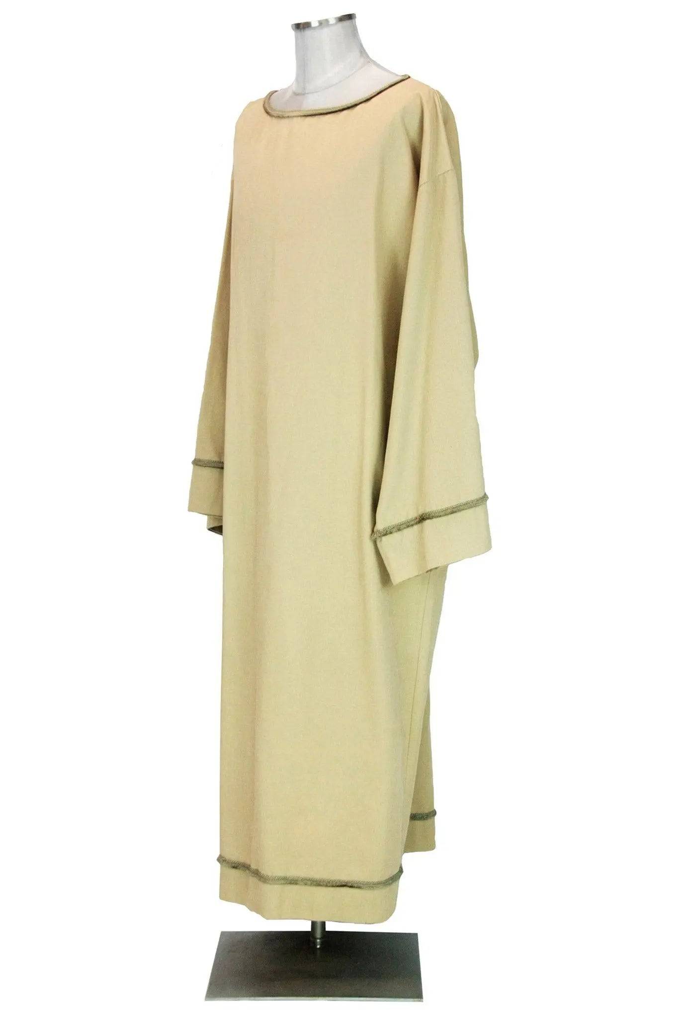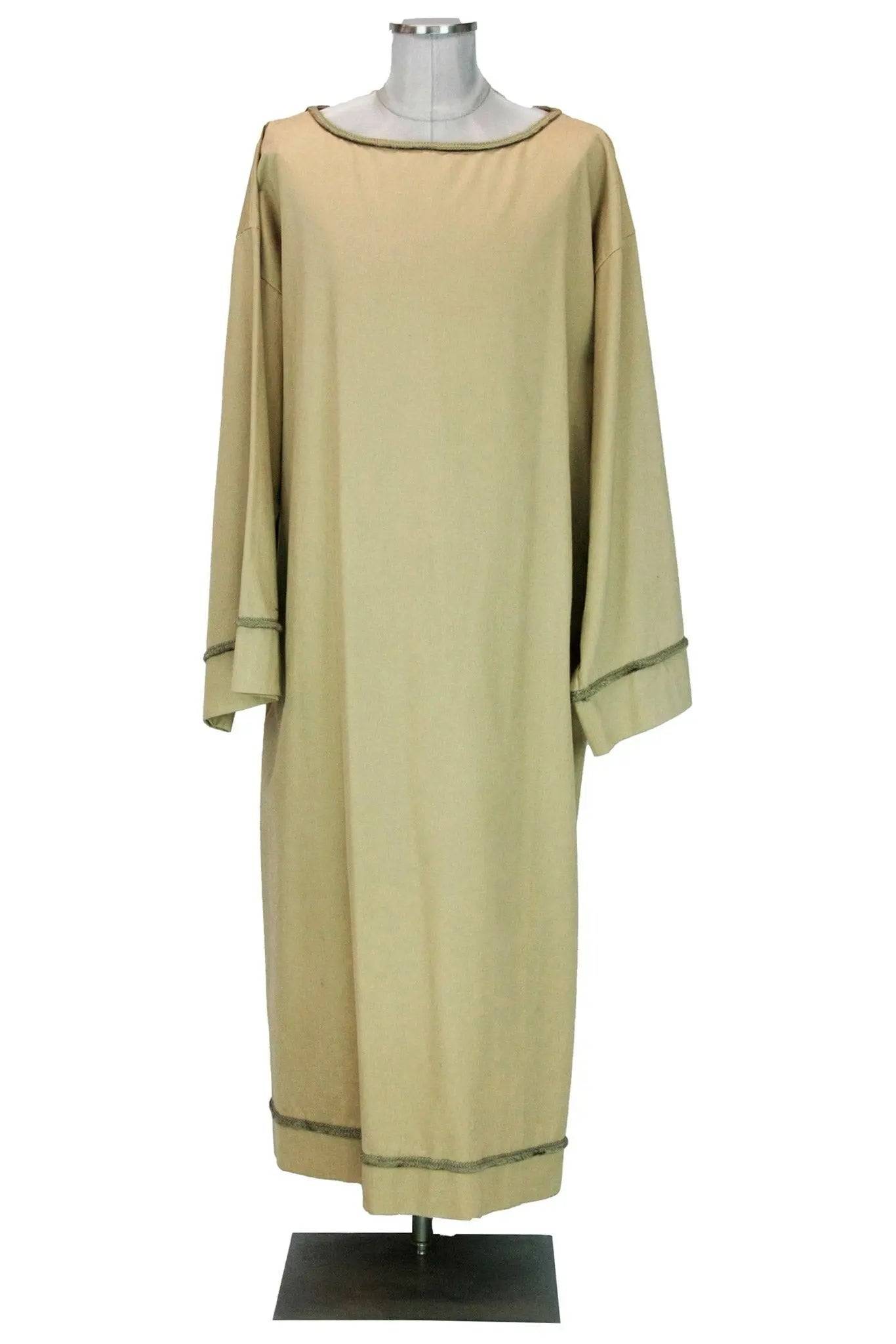 Noleggio tunica lunga uomo donna in tessuto color crema-nocciola con scollo, polsi e orlo sottolineati da sottili passamanerie verde ocra, questa tunica a lunghe maniche si presta sia per persone del popolo (Palestina, Bisanzio, Roma Antica) sia per personaggi altolocati se usata come sottabito con un ricco mantello o scapolare.