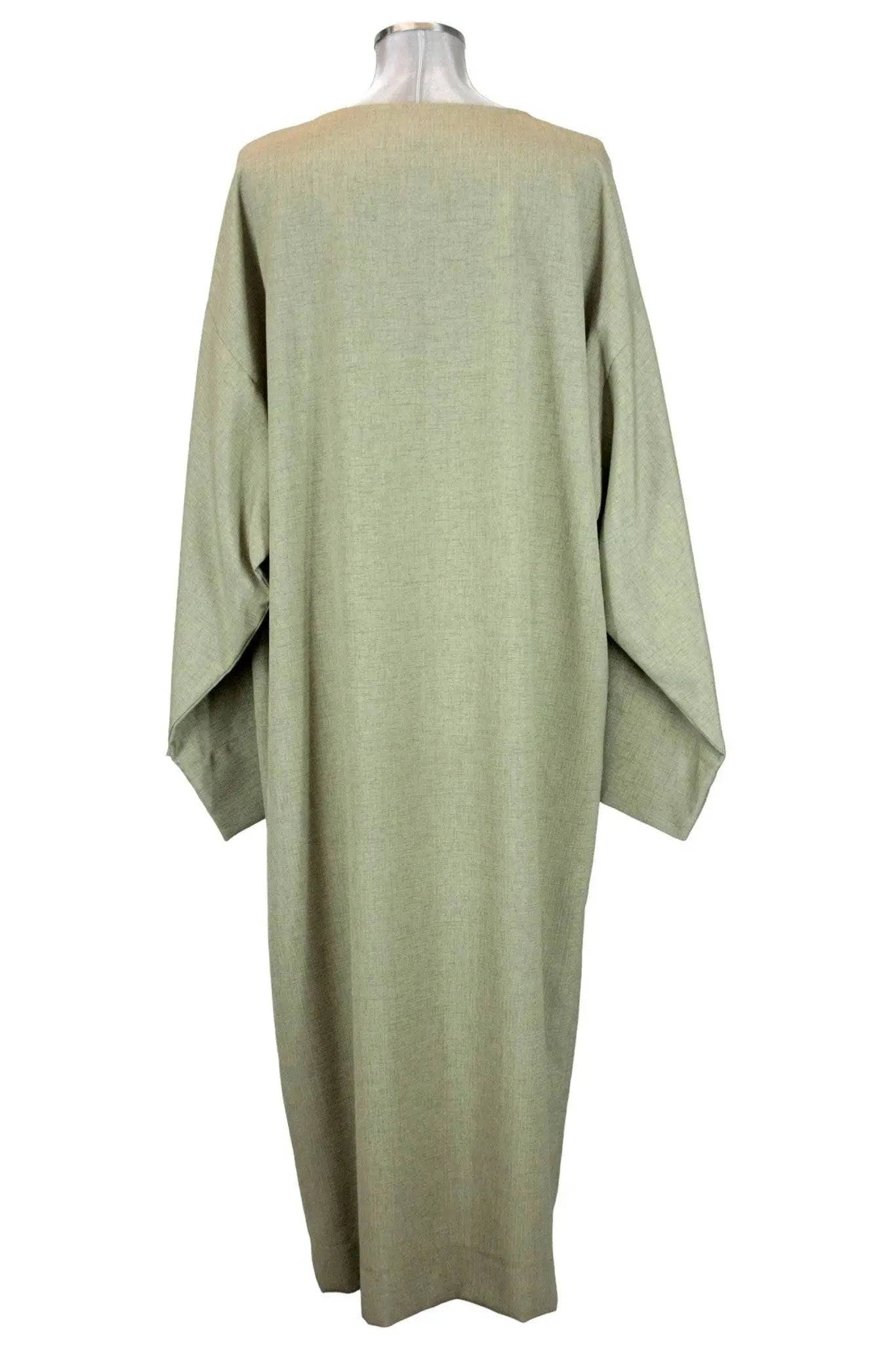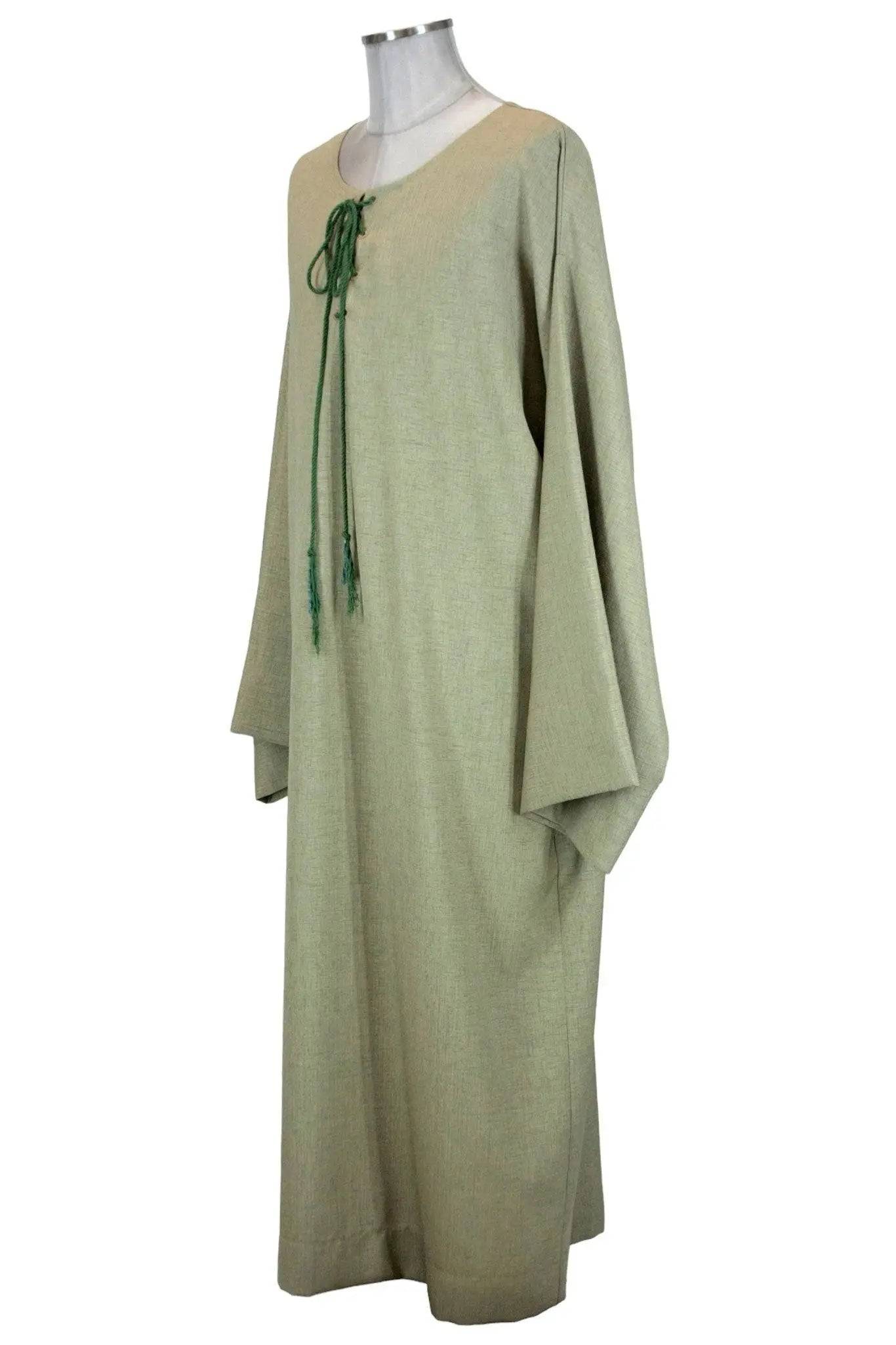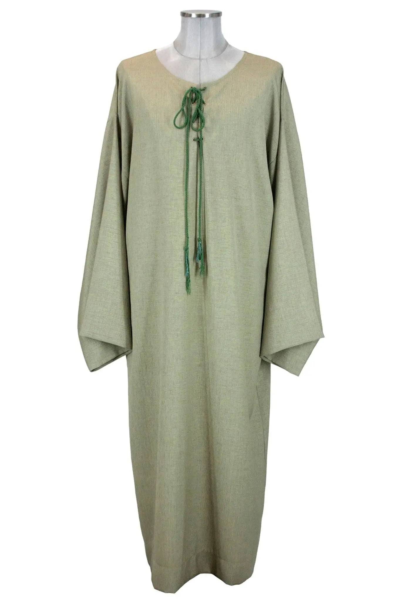 Noleggio lunga tunica realizzata in tessuto a grana visibile, tipo lino grezzo, tendente al verdino, ha maniche larghe e scollo tondo e si allaccia sul petto con una stringatura in cordoncino verde. Adatto a popolani di vari secoli, poveri, penitenti, streghe ed eretici sotto processo o condotti al supplizio.