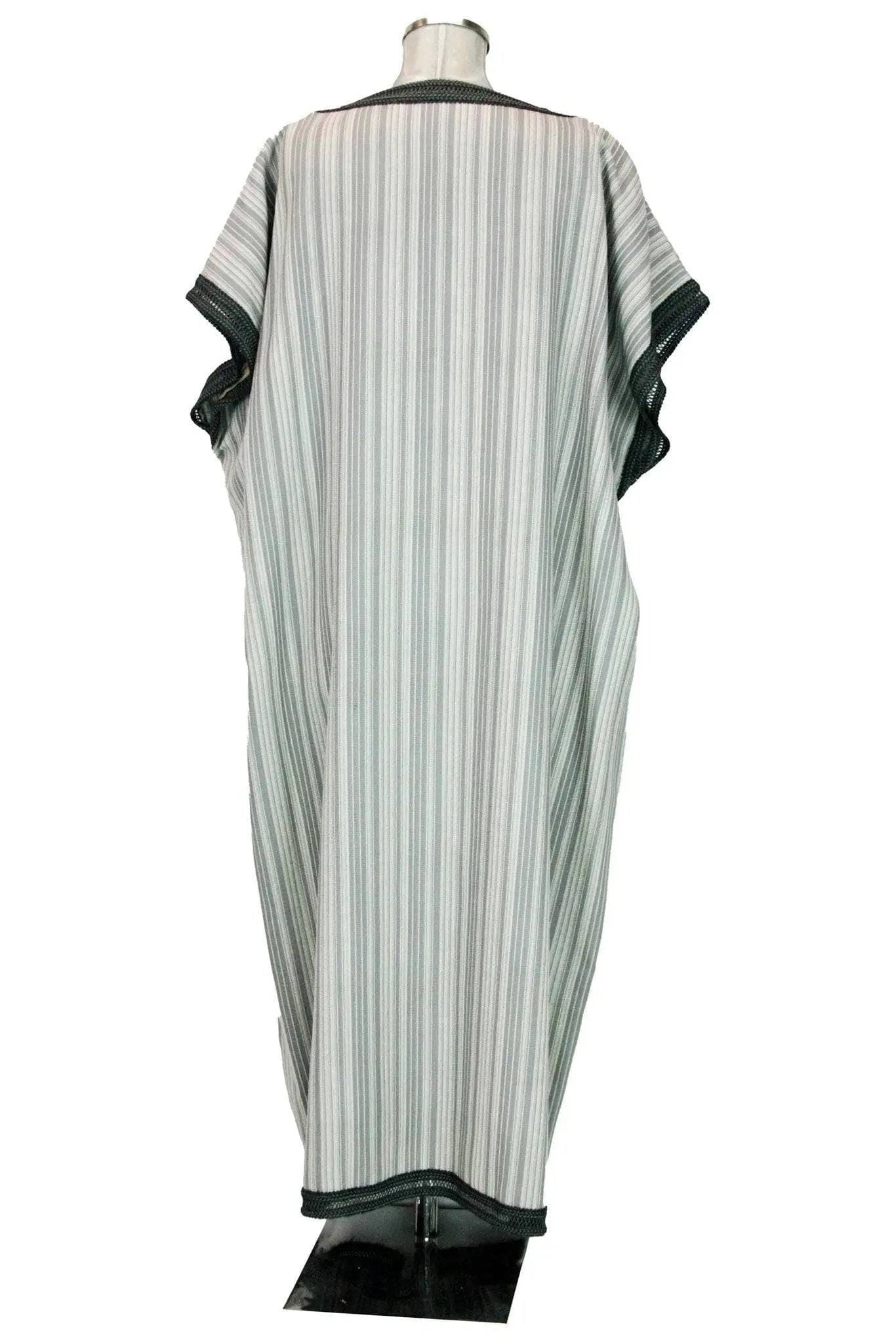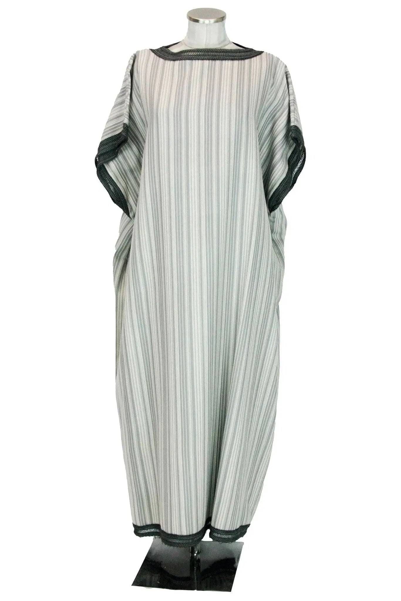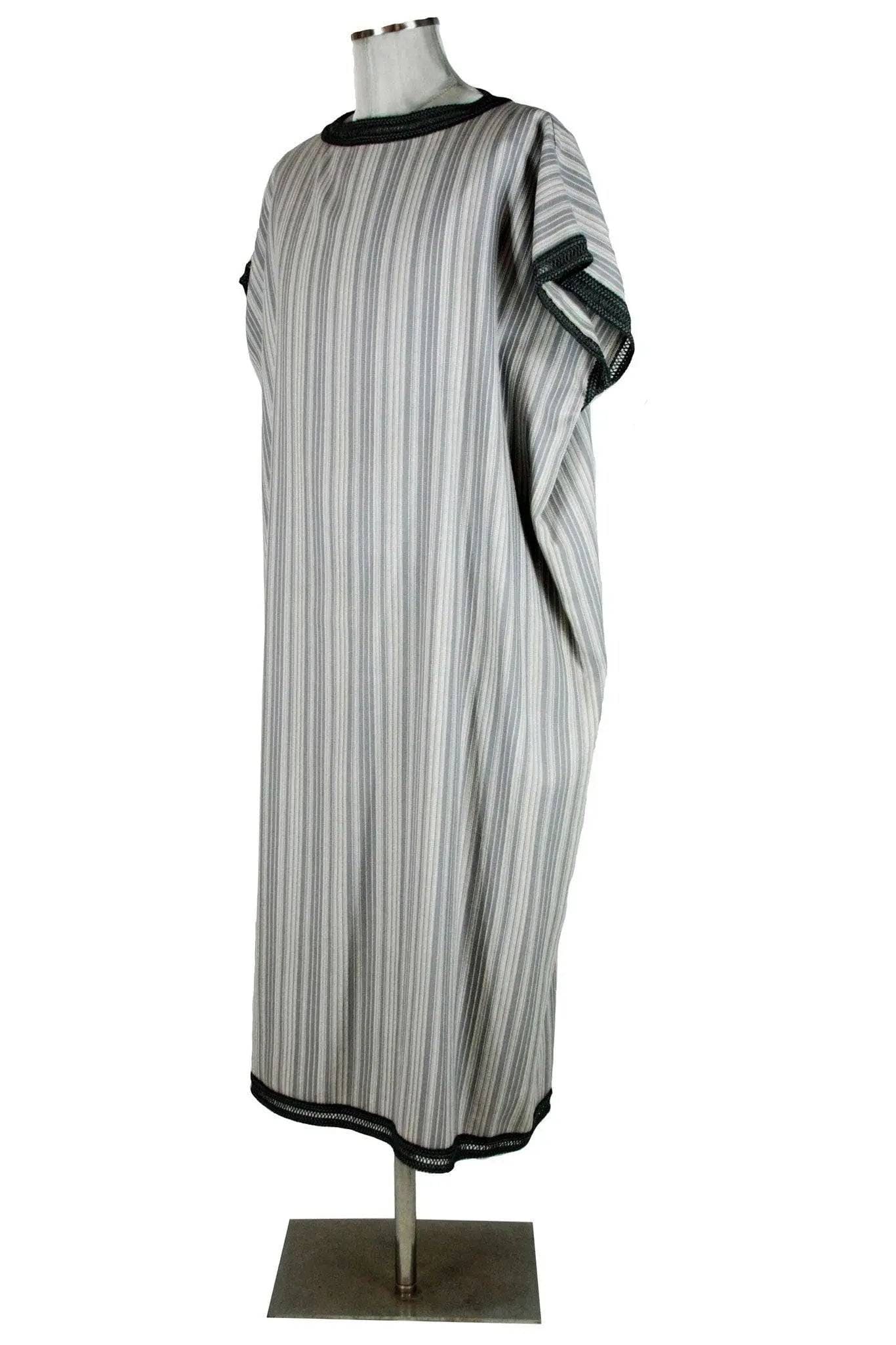 Noleggio Tunica uomo o donna molto versatile per presepe vivente, rappresentazioni della Passione, carri mascherati o spettacoli; di taglio semplice e sciolto, con spalla larga che forma una breve manica, è a righine sui toni del bianco e grigio con bordure di passamaneria più scura. Si porta anche con cintura a fascia.