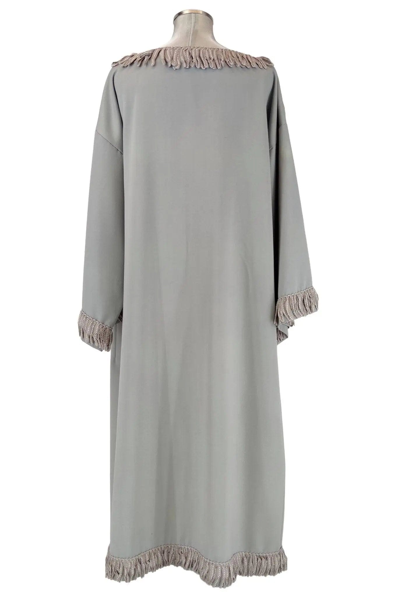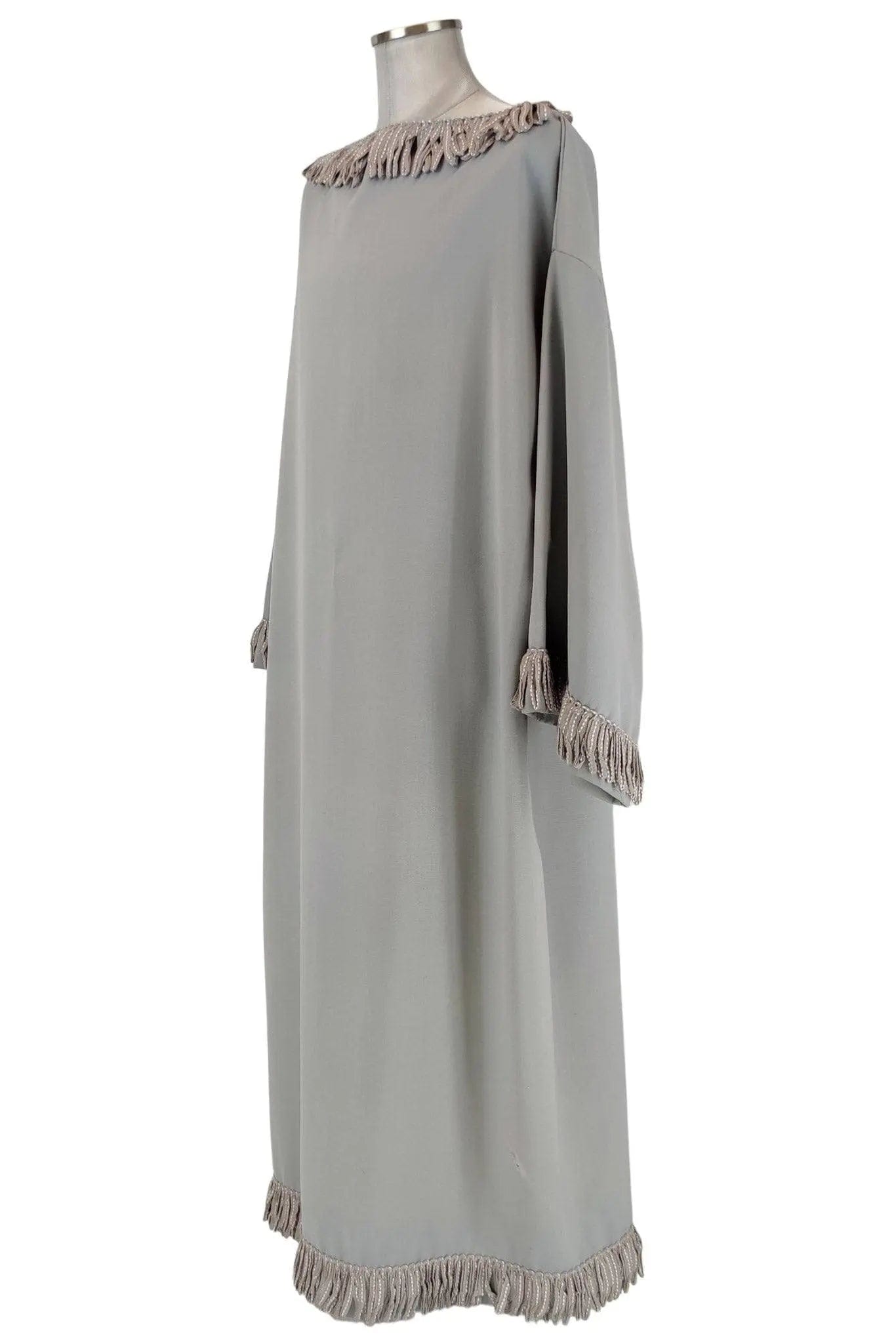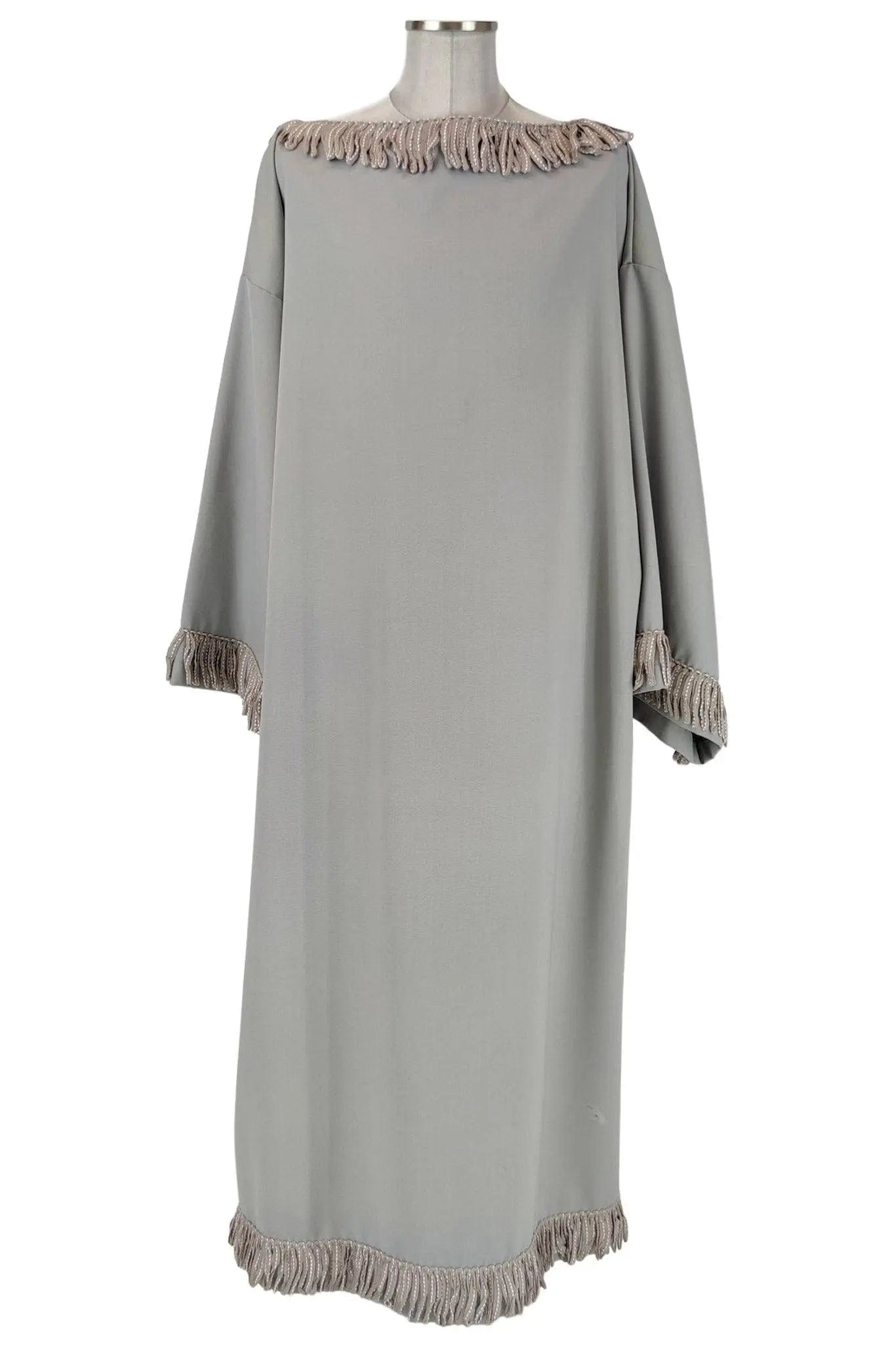 L'abito è realizzato in un tessuto grigio di alta qualità, con frange decorative sullo scollo, sui polsini e sull'orlo. Il design ampio e lineare offre una vestibilità comoda e fluida, adatta a diverse fisicità. Le frange aggiungono un tocco di eleganza e movimento, rendendo questo abito perfetto per chi cerca un capo di abbigliamento che unisca comfort e stile.