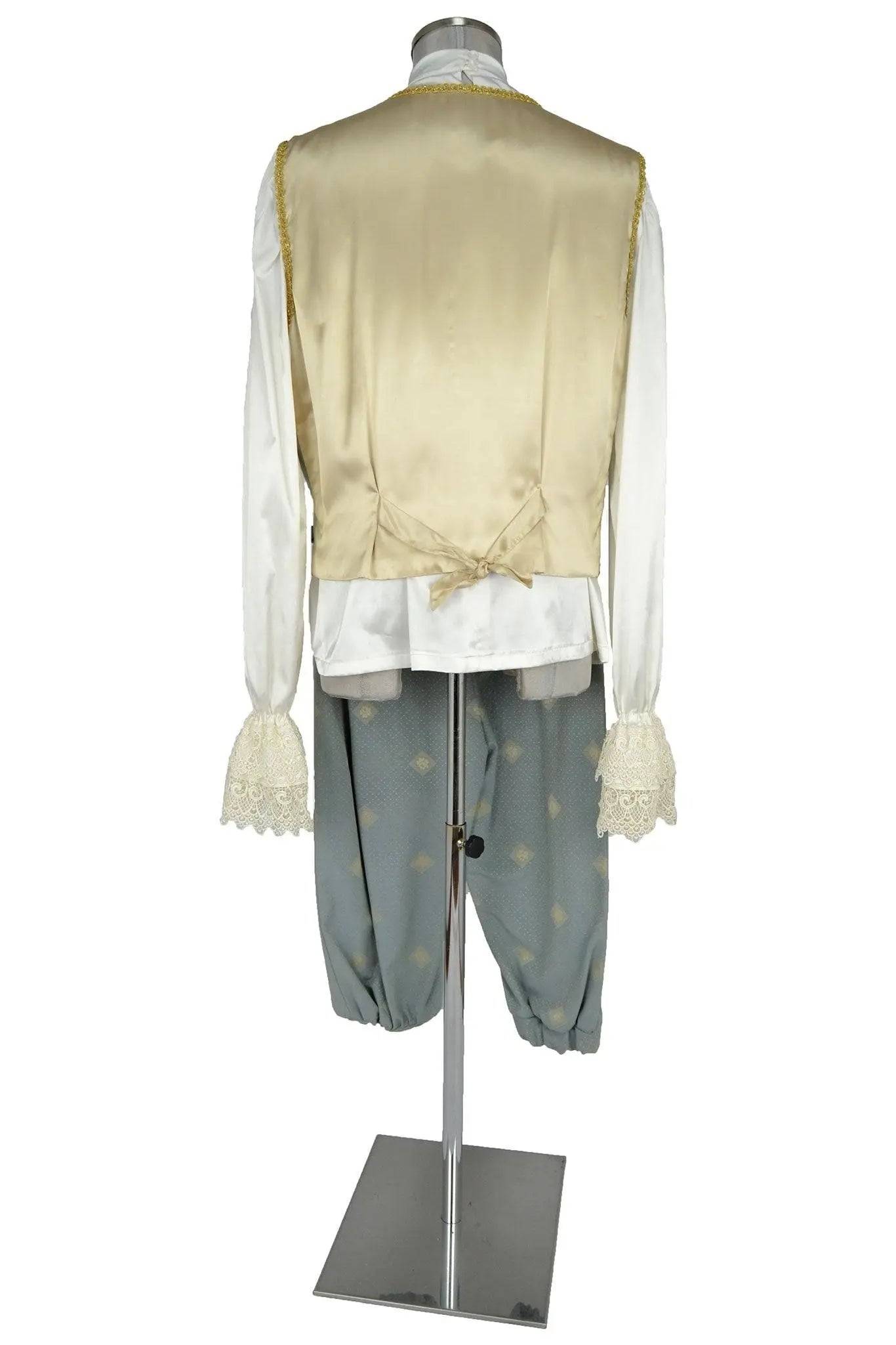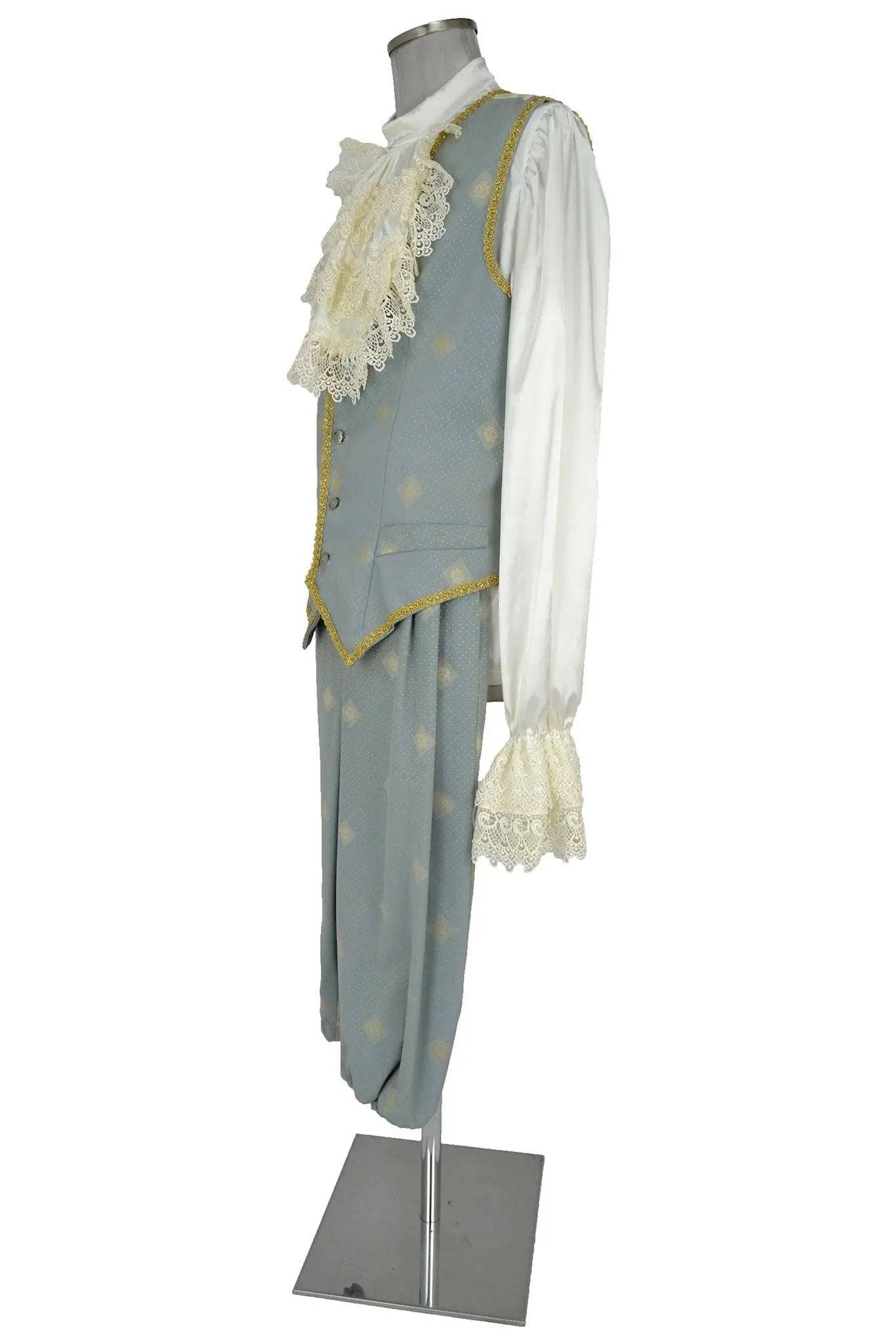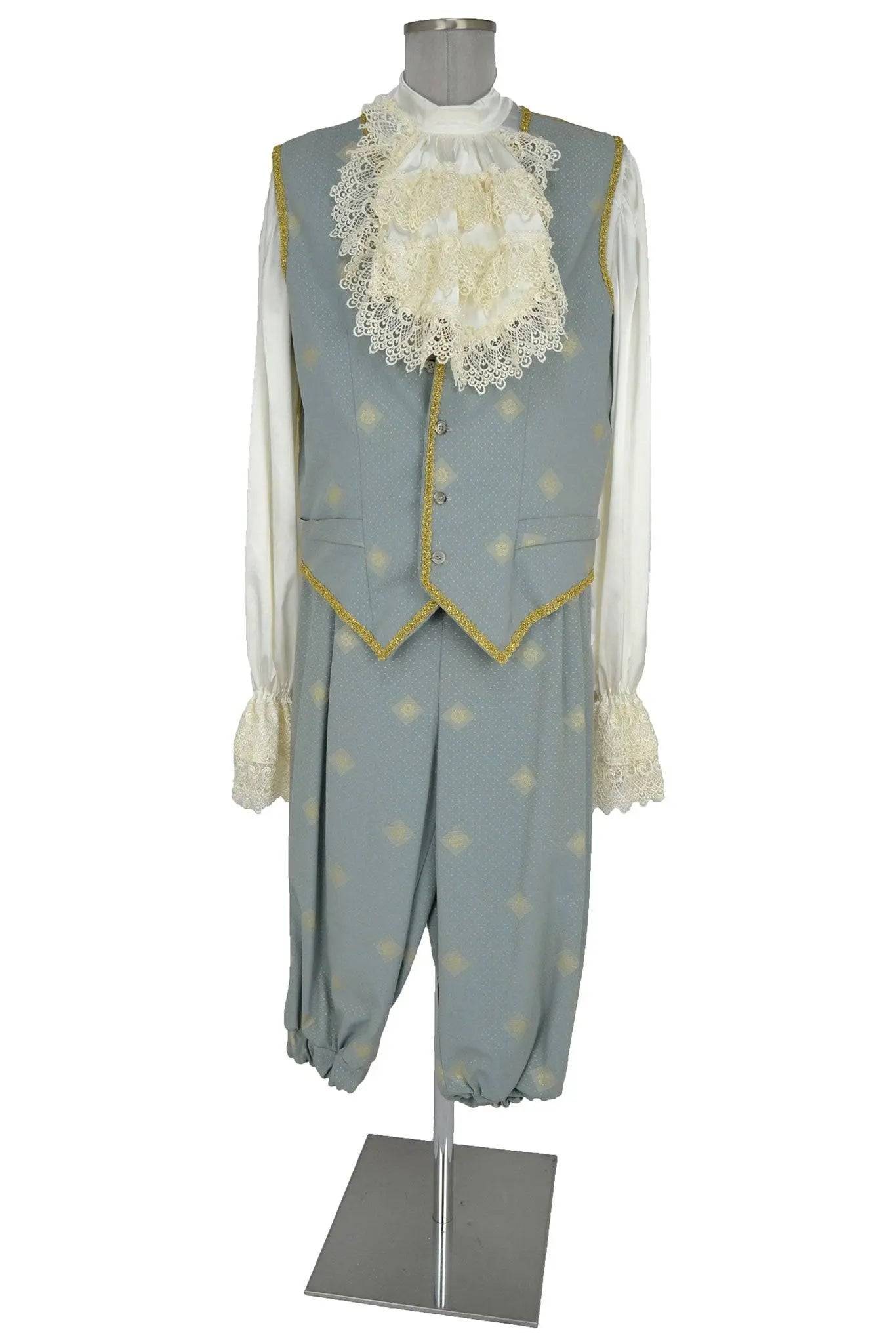 Noleggio Abito uomo altoborghese stile '700 per politici e militari. In pregevole tessuto azzurro operato a motivi geometrici, I calzoni sono arricciati sotto il ginocchio, la camicia bianca ha polsi in pizzo e un ricco jabot che ricade sul gilet corto profilato in oro e dotato di bottoncini.