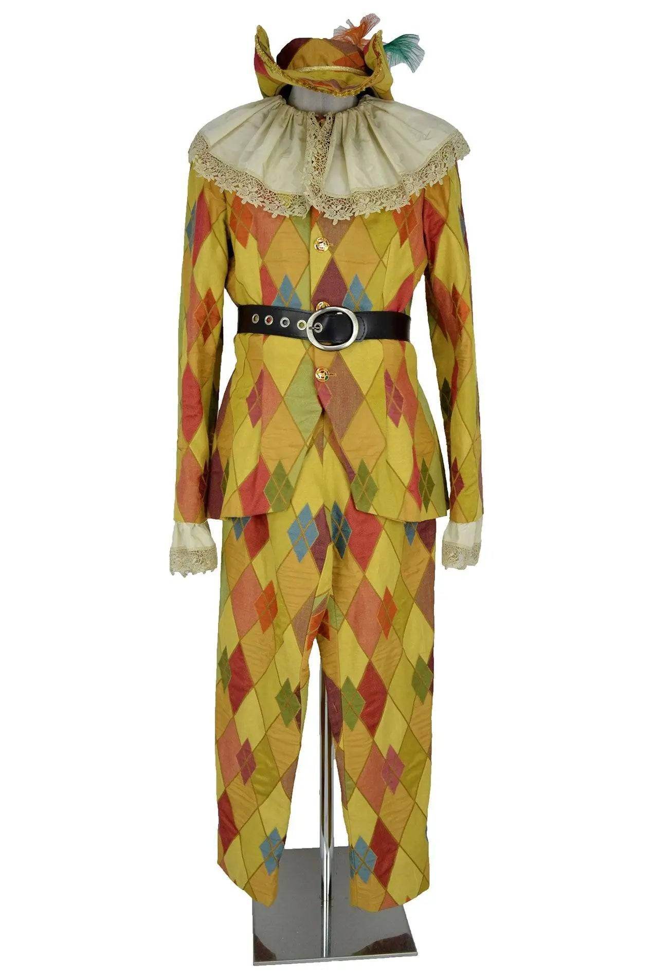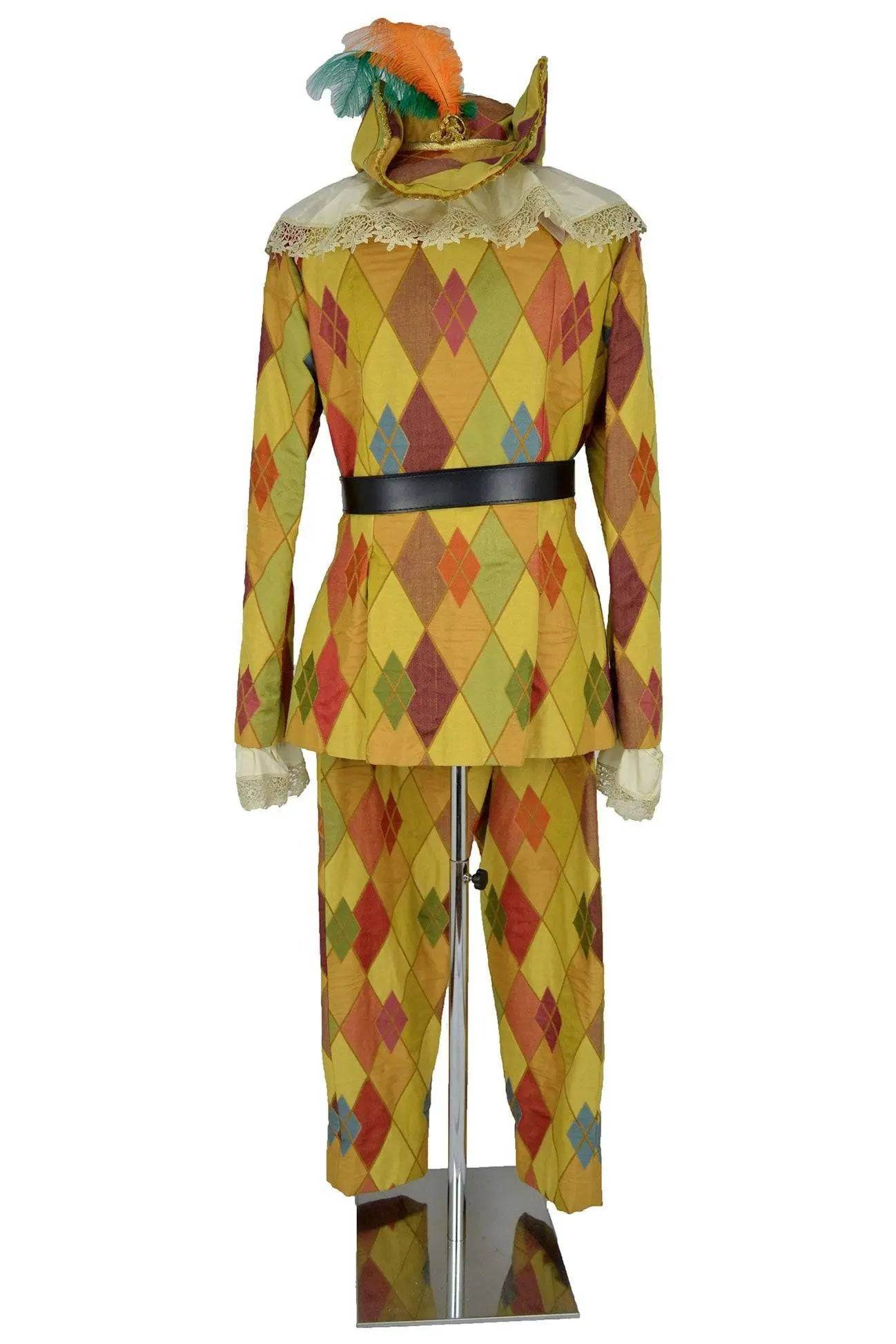 Costume di carnevale uomo da Arlecchino per recite e sfilate. Utilizza una raffinata rivisitazione del classico tessuto; comprende calzoni lunghi, giacca, cappello a tesa nel medesimo tessuto, cintura tipo pelle, e bellissima camicia dal collettone orlato di pizzo come i polsi.