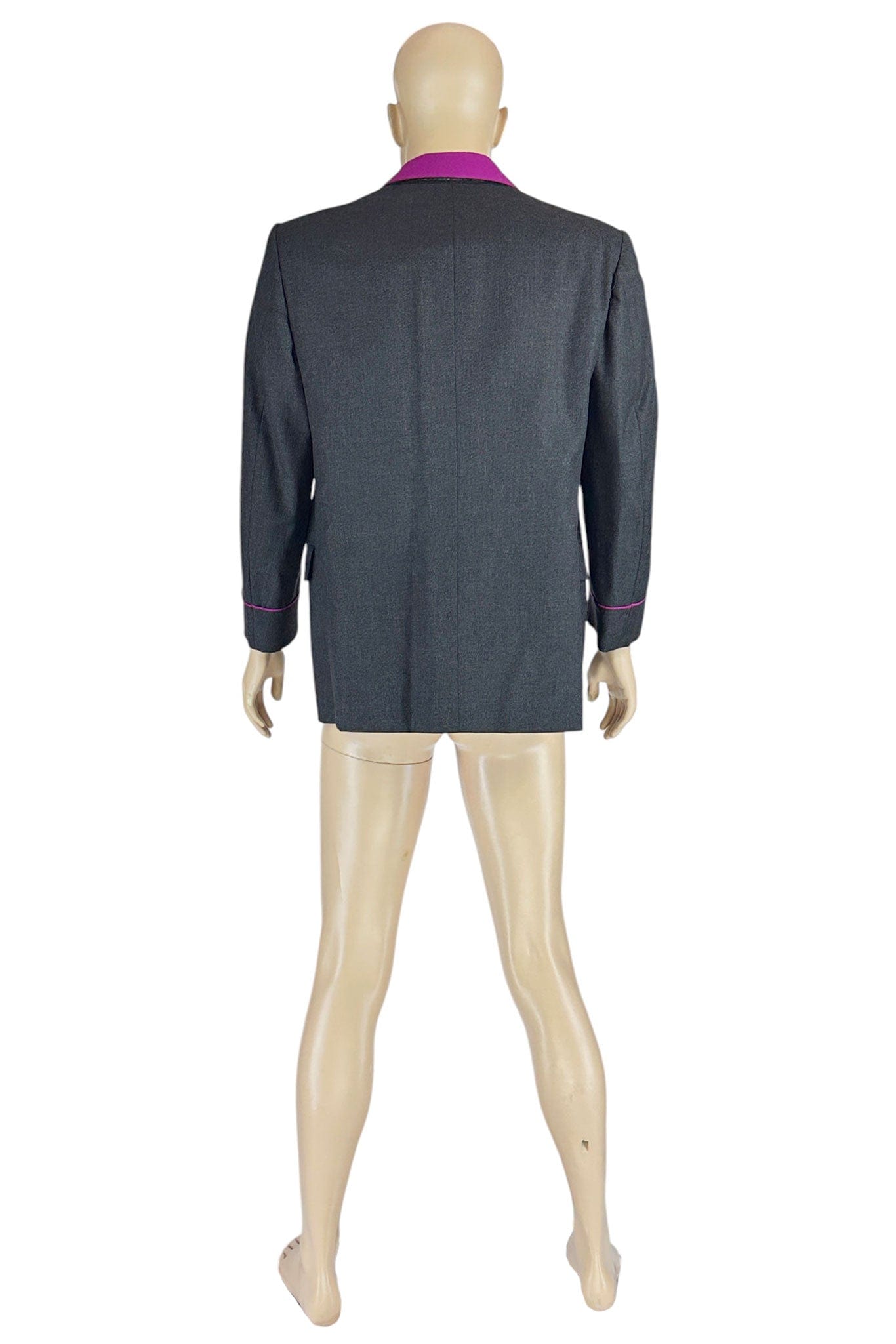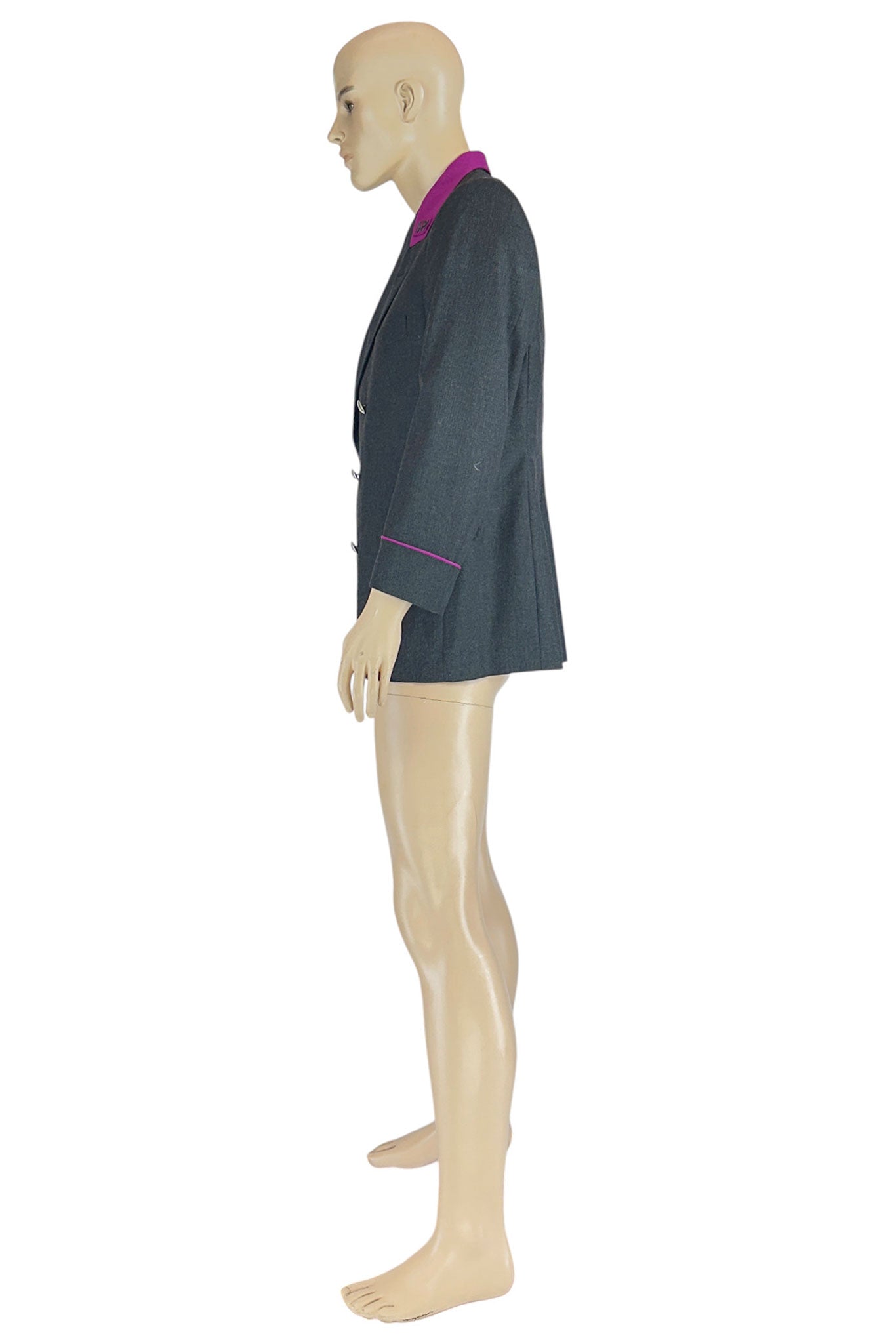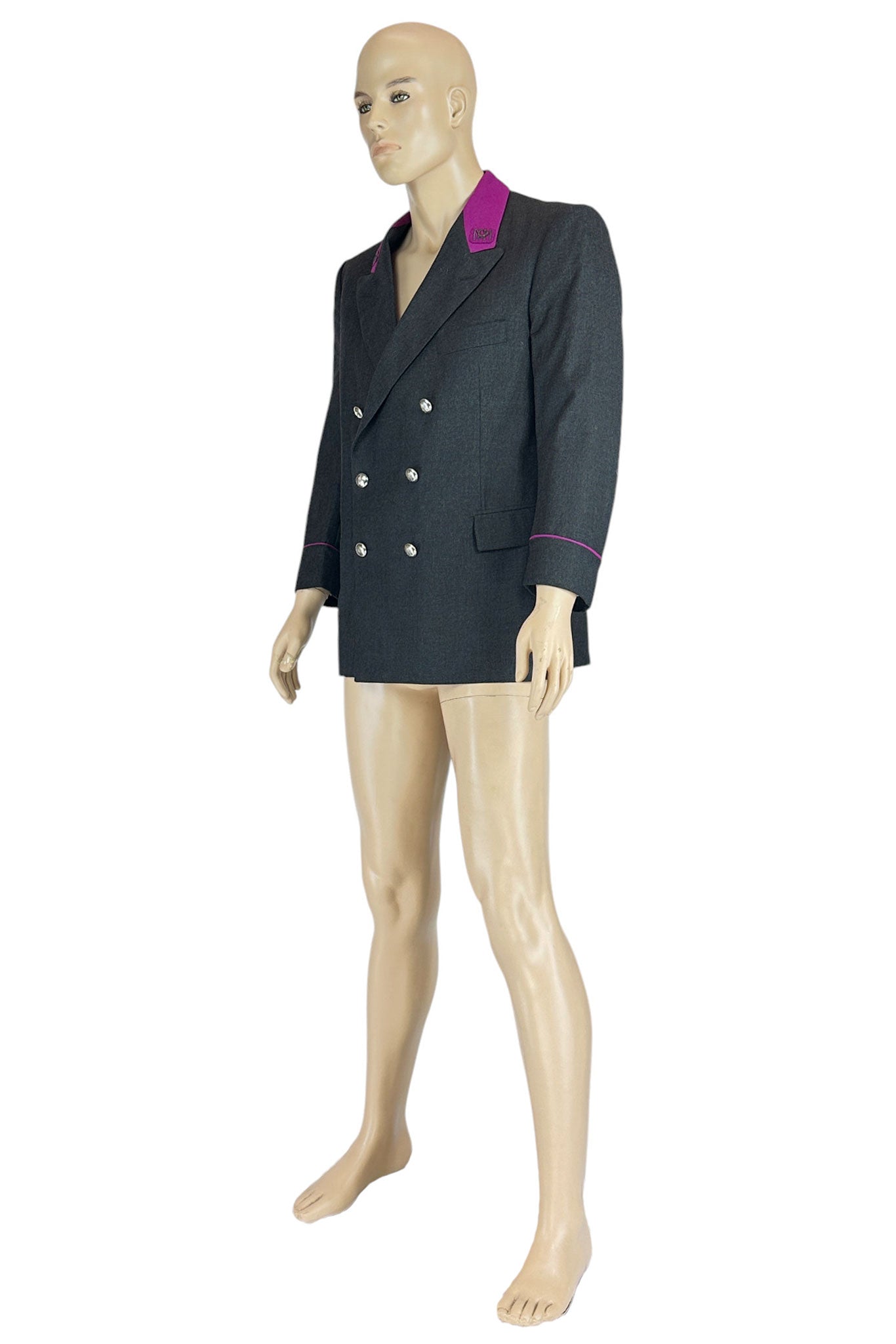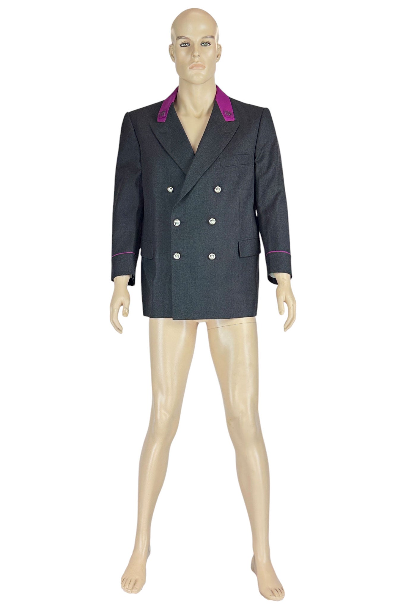 Il taglio sartoriale conferisce una vestibilità strutturata, ideale per valorizzare la figura maschile, mentre il colore grigio antracite dona sobrietà e versatilità. Il colletto ampio in contrasto viola con ricami aggiunge una nota di classe inaspettata, rendendo questo capo un protagonista perfetto per il palcoscenico o per feste a tema ispirate al mondo militare, nobiliare o persino futurista.