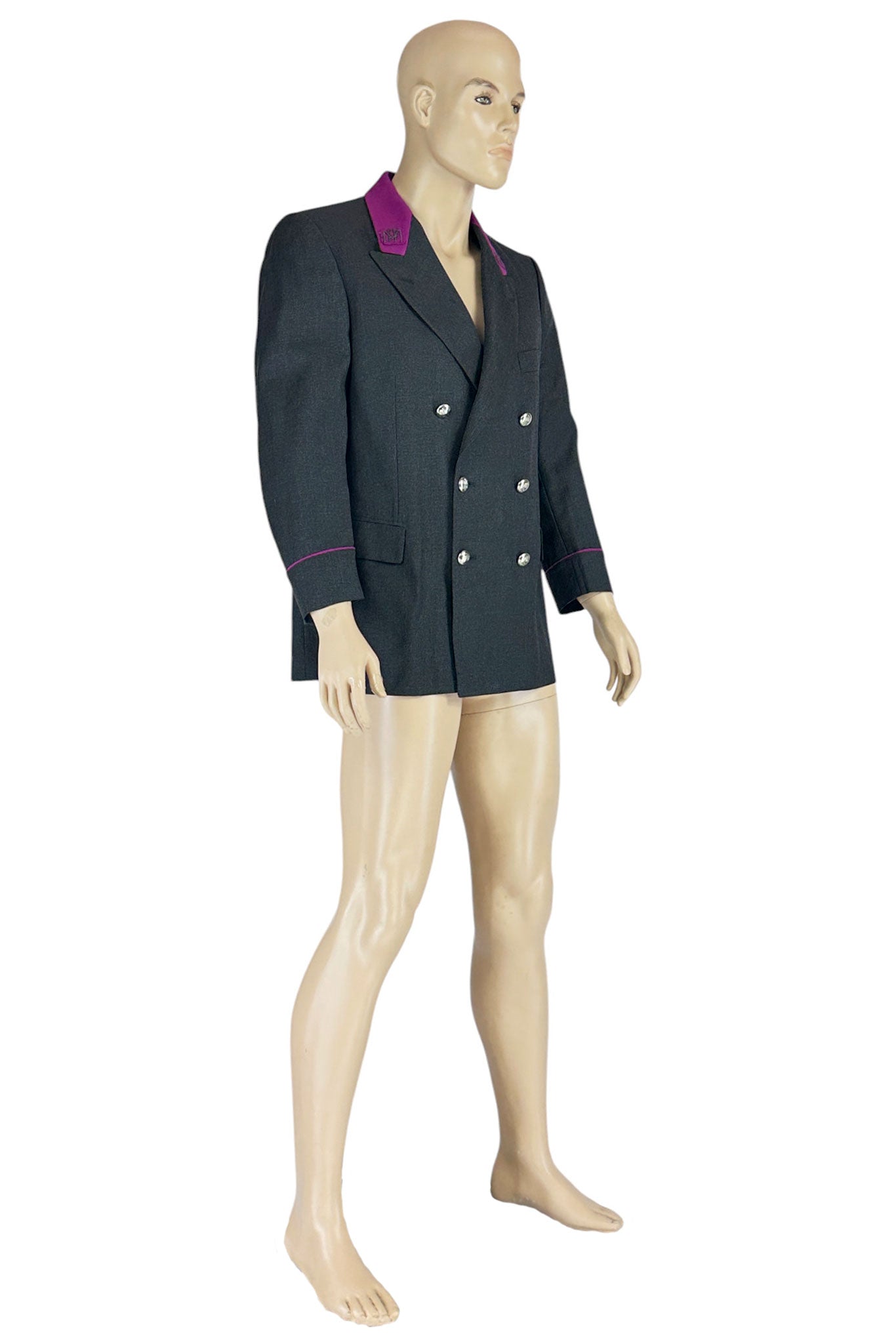 Nel corso della storia della moda, la giacca doppiopetto ha avuto numerosi ritorni, spesso associata a figure di potere, uniformi cerimoniali o divise d’élite. Questa noleggio giacca doppiopetto grigia profili viola uomo richiama proprio quei codici estetici, reinterpretandoli in chiave teatrale e scenografica, perfetta per chi desidera un capo che non passi inosservato.