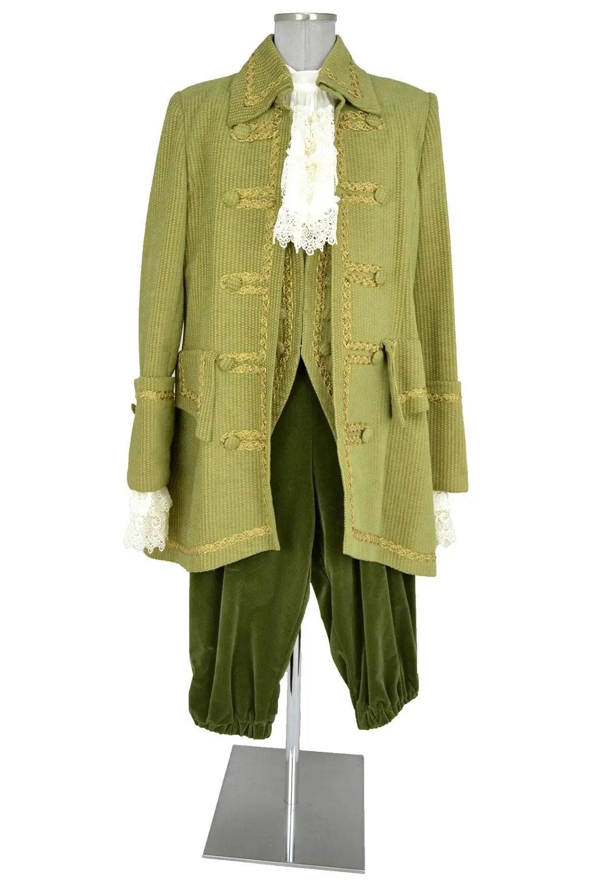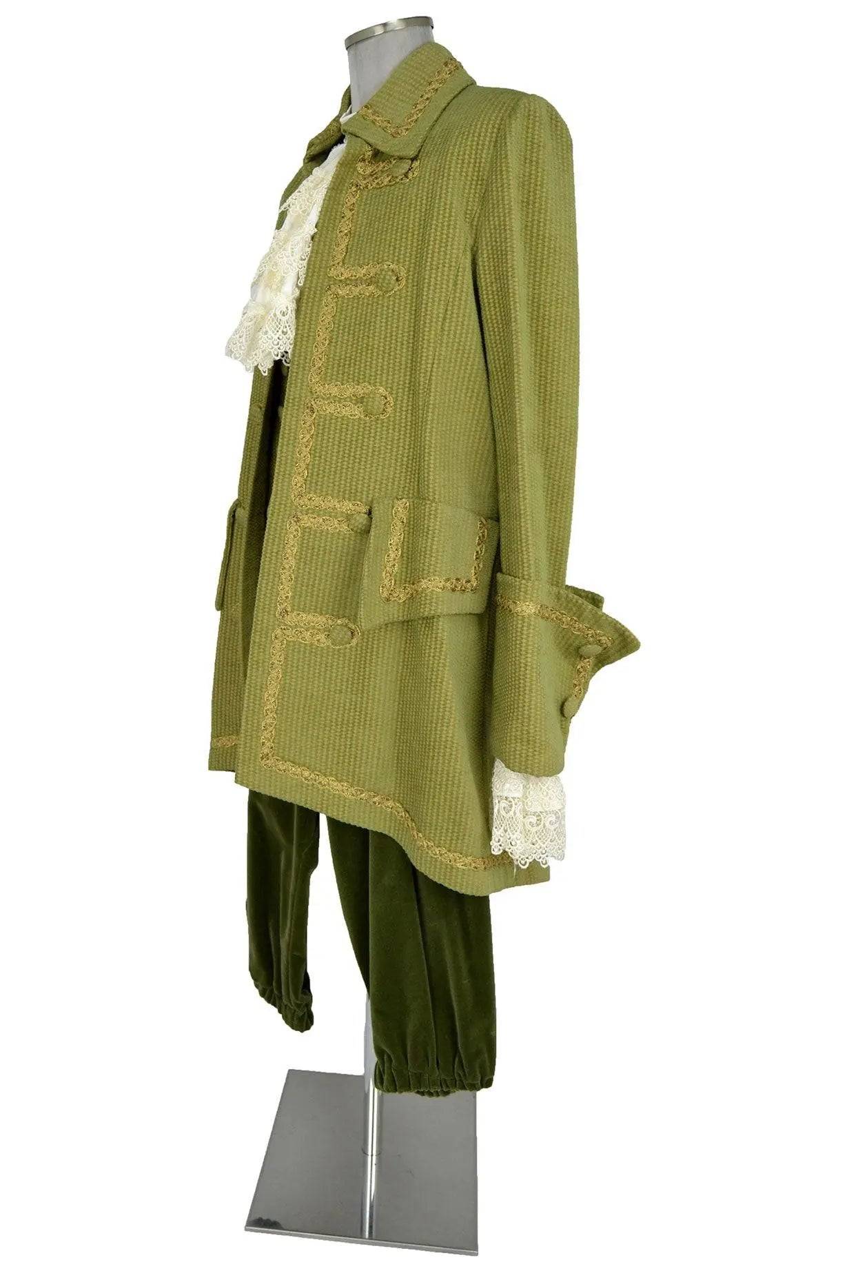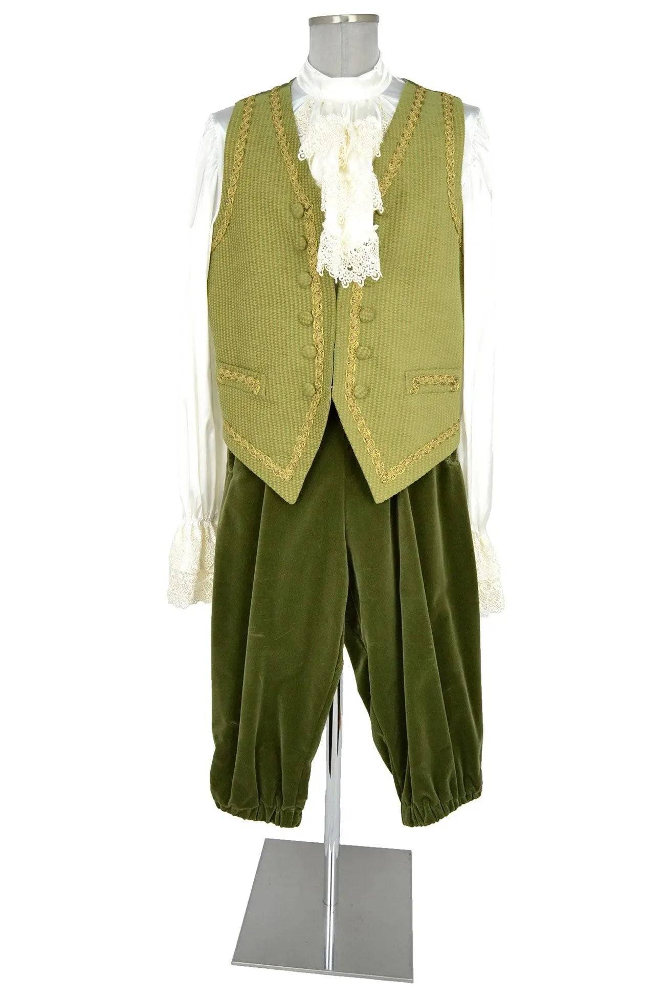 Noleggio abito uomo stile '700 per borghesi, domestici, ma anche personaggi importanti colti al lavoro in casa o in ufficio; i calzoni arricciati sotto il ginocchio sono in velluto liscio, il gilet in tessuto operato con doppi bottoni e passamanerie, d'obbligo jabot e polsi di merletto sulla camicia.