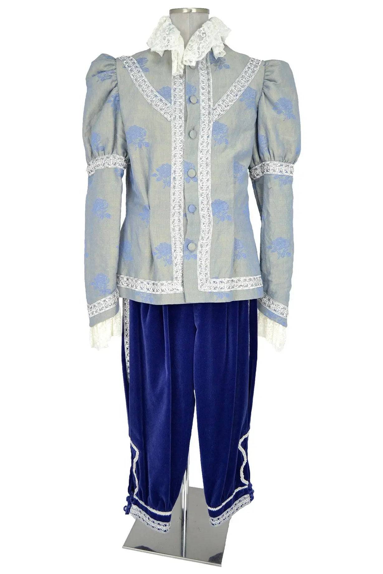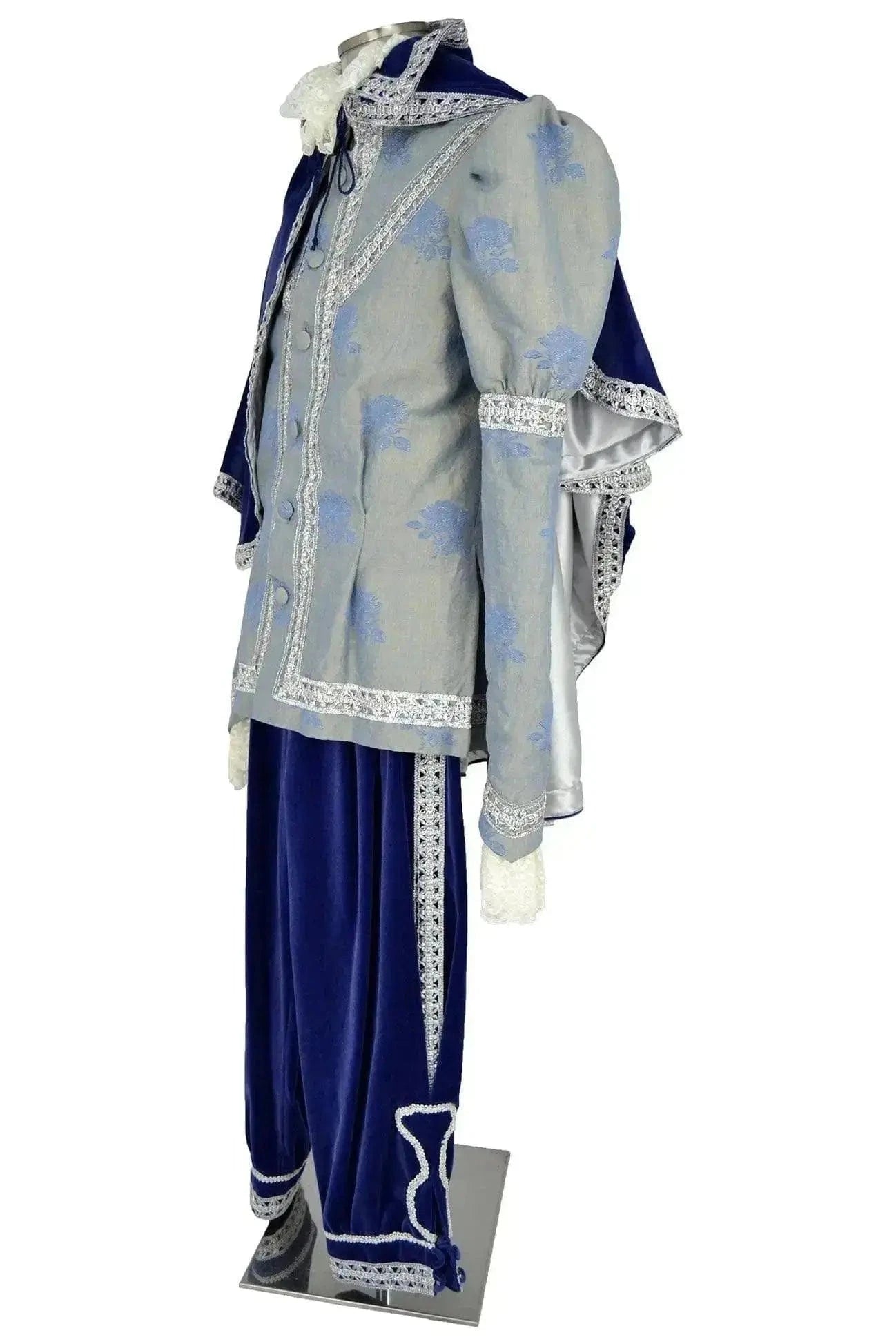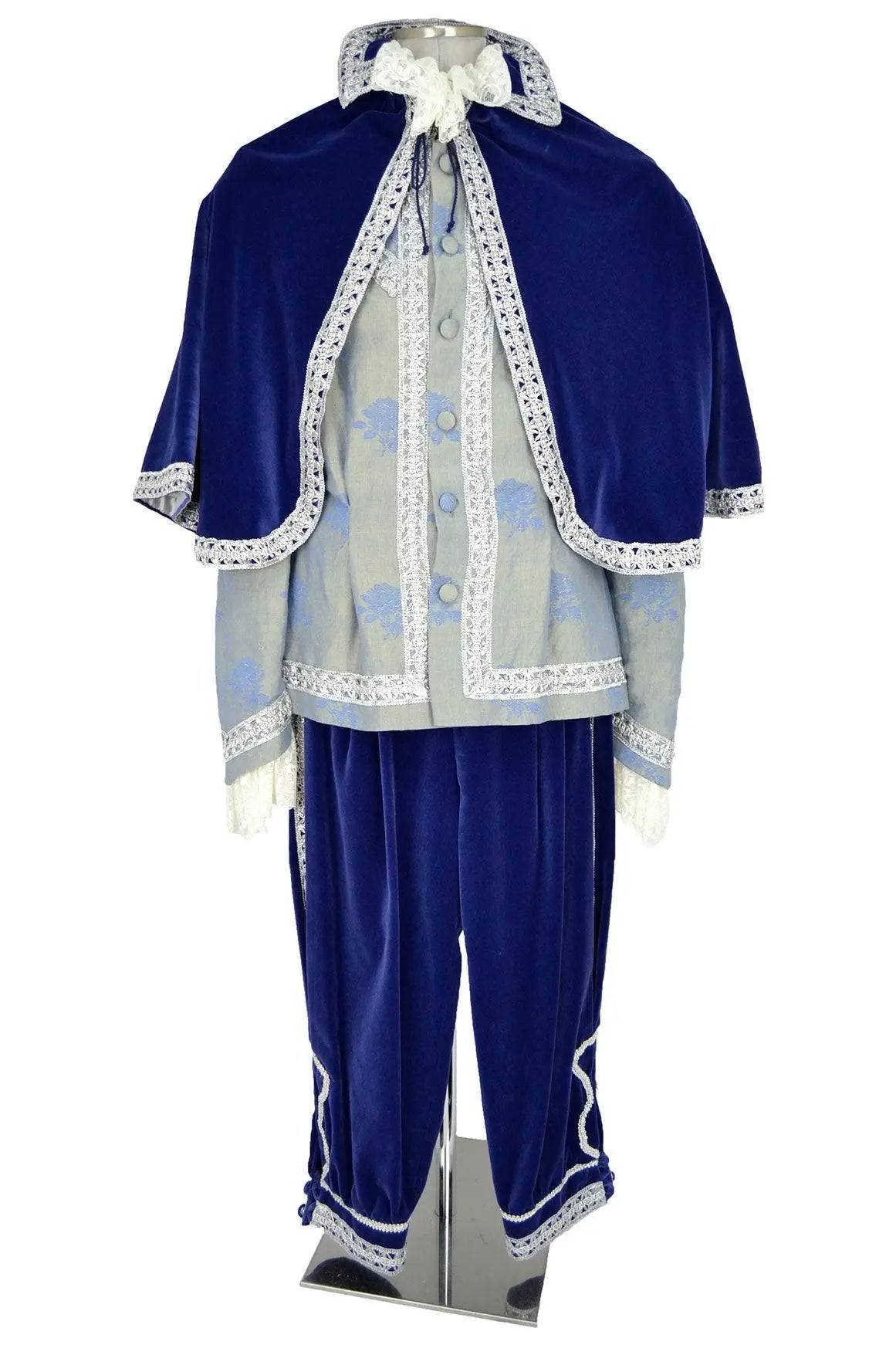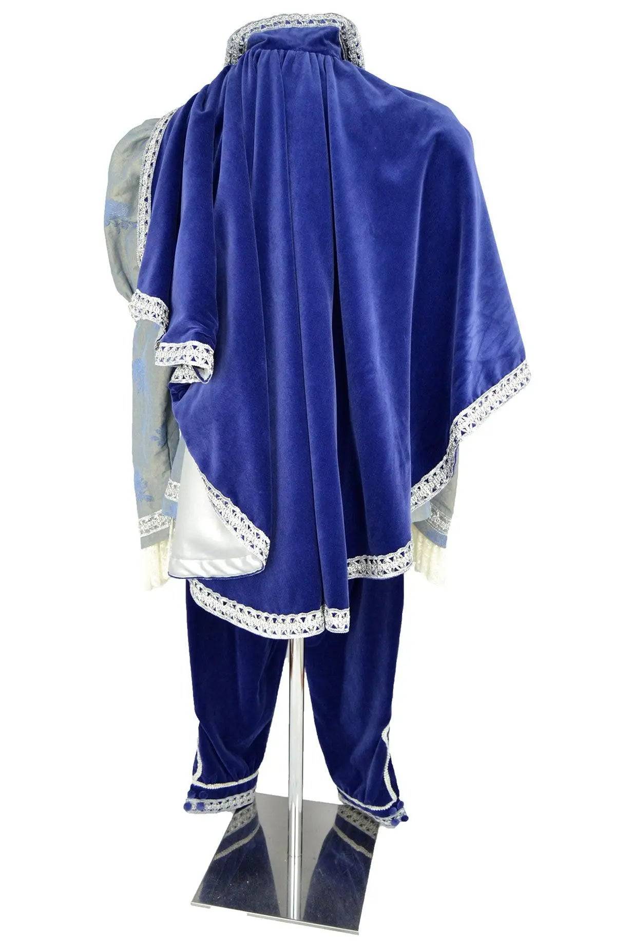 L'abito storico uomo blu velluto con mantello è arricchito da dettagli ricamati in pizzo bianco, che evidenziano le rifiniture del gilet e dei polsini, donando un contrasto sofisticato all'intero outfit. Il pantalone in velluto blu completa il look, conferendo un aspetto regale che ben si adatta a spettacoli teatrali, rappresentazioni o rievocazioni d'epoca.