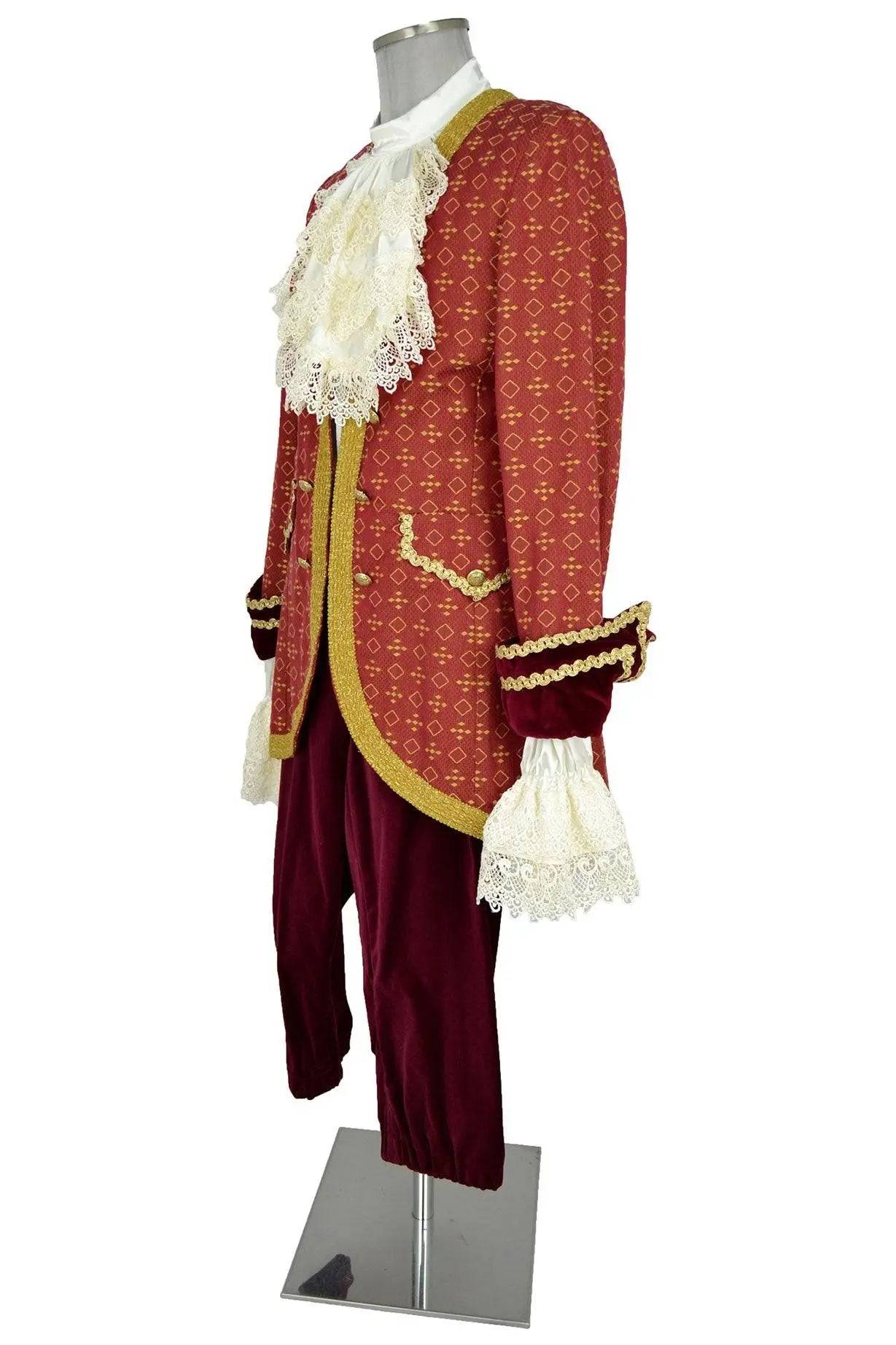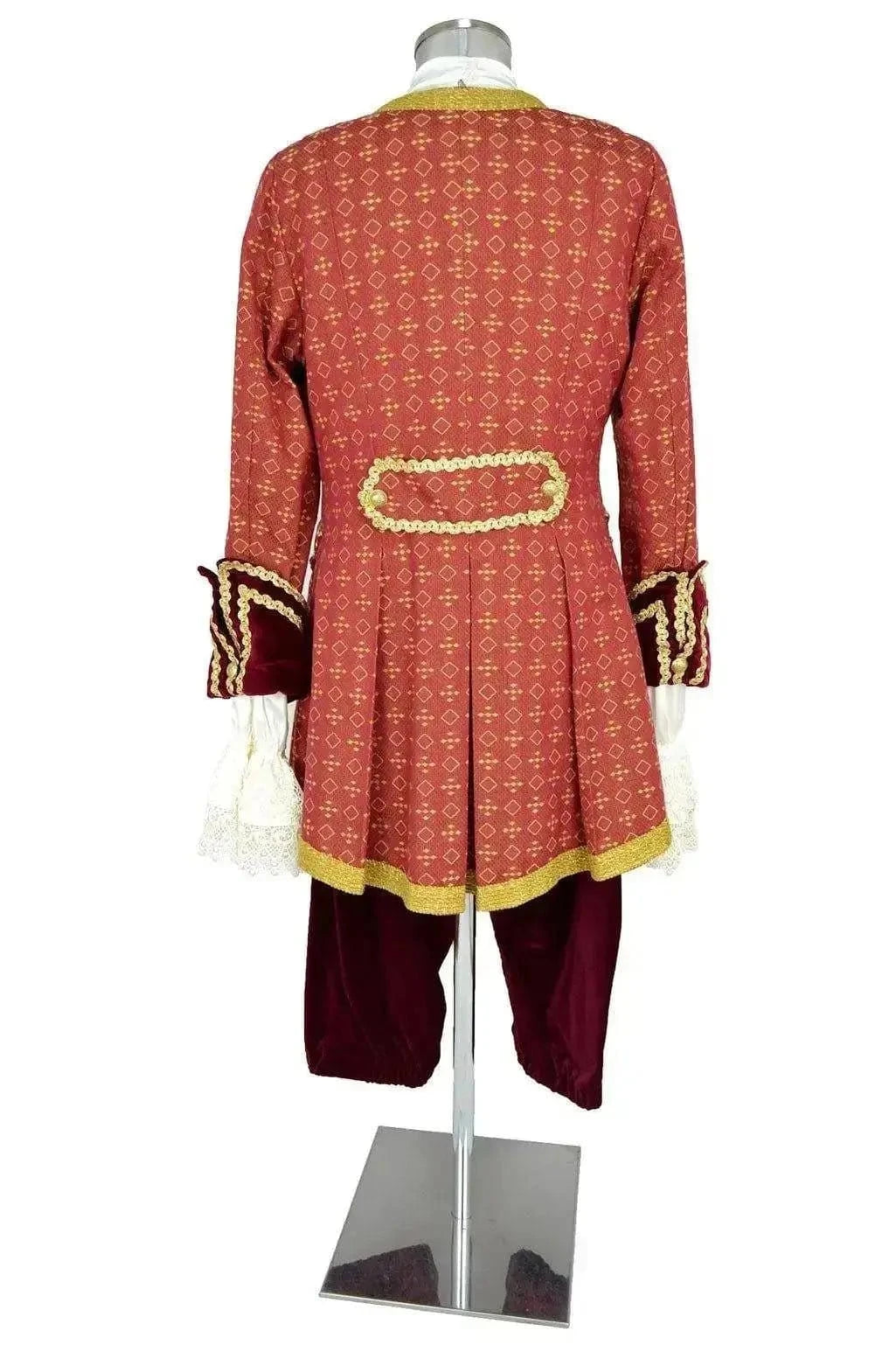 Realizzato con materiali di alta qualità, il noleggio abito da uomo in stile settecentesco ti offre la possibilità di indossare un costume che non solo è fedele allo stile storico, ma che garantisce anche il massimo comfort. La giacca in velluto rosso e oro, abbinata a un pantalone ricercato, è completata da una camicia con jabot in pizzo, che aggiunge un tocco di classe all'intero ensemble.