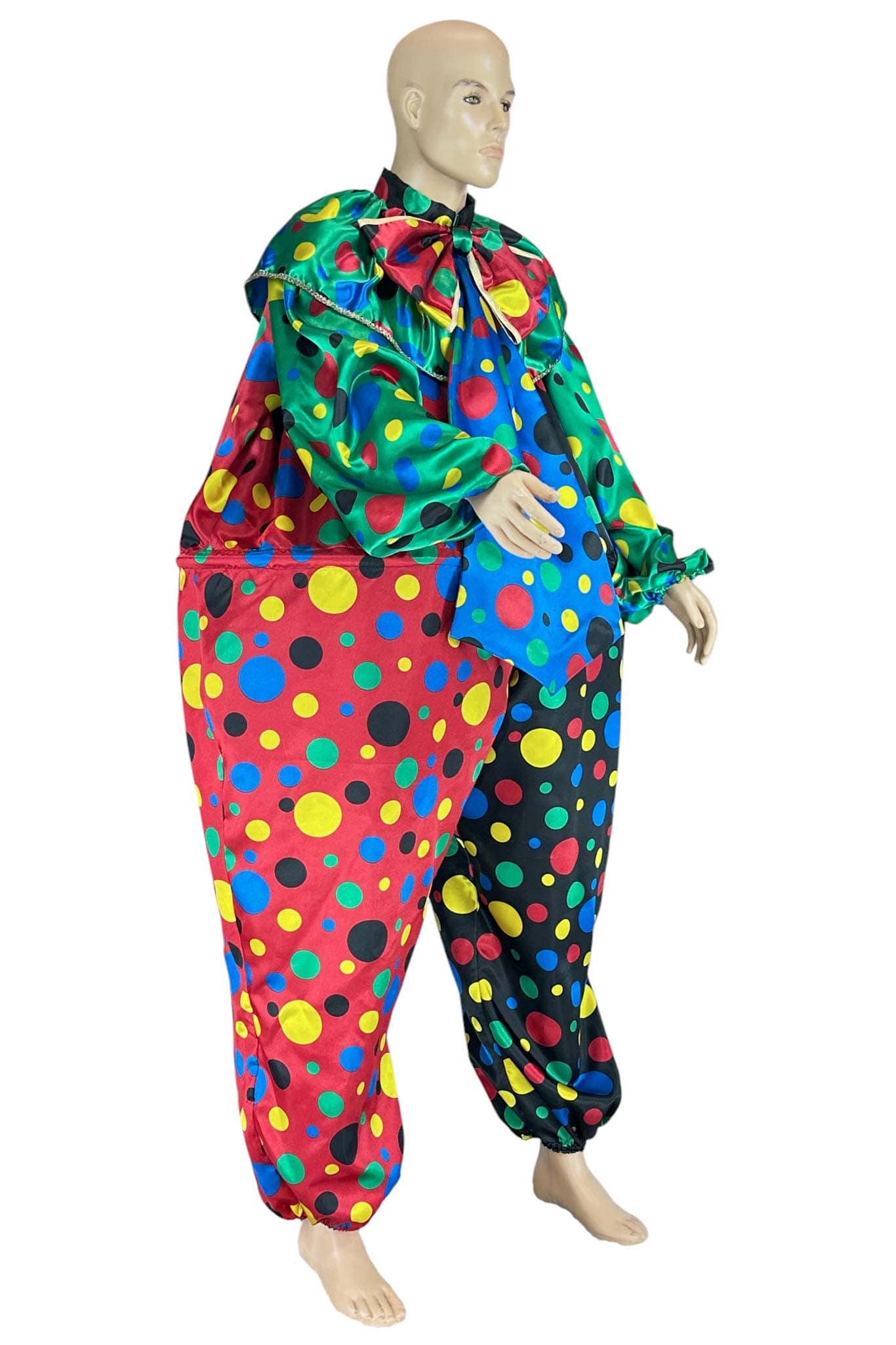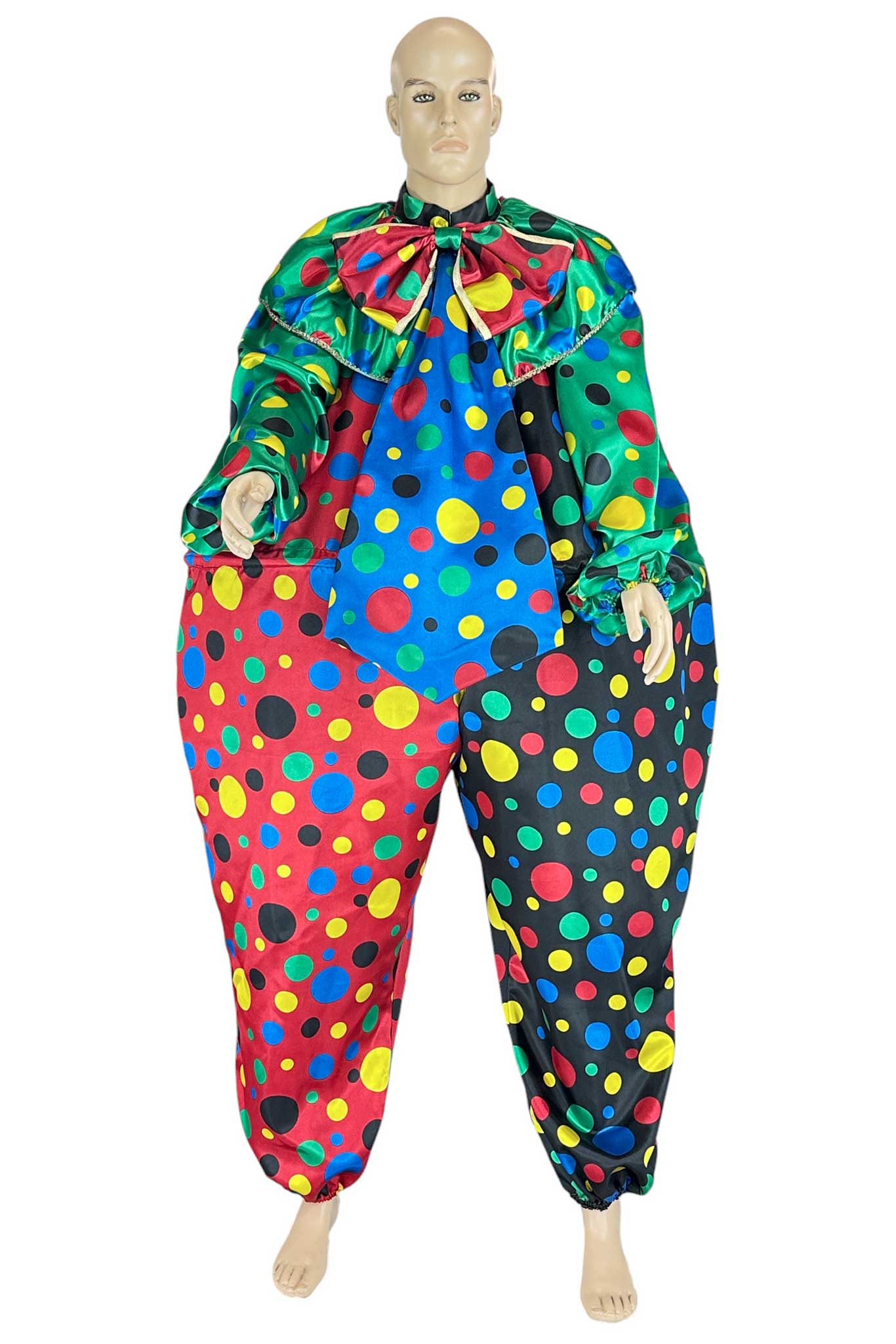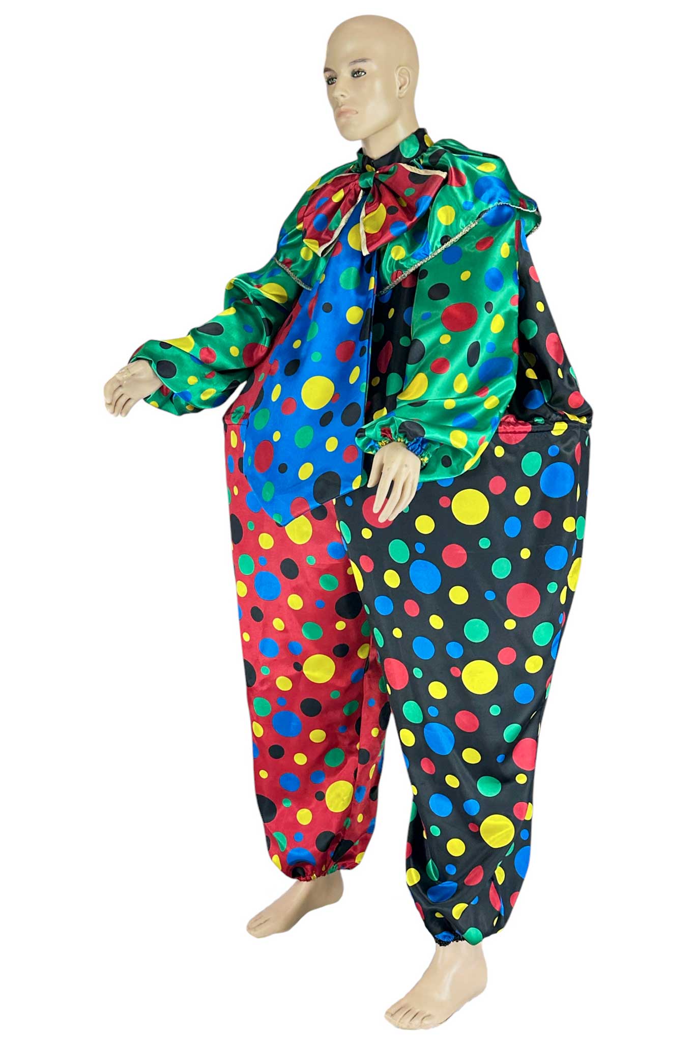 Il completo comprende una tunica ampia con maniche lunghe e un maxi papillon decorativo in tinta, che aggiunge un tocco ironico e teatrale al look. I pantaloni oversize, con elastico alla caviglia, completano la mise e rendono il movimento dinamico e coinvolgente, perfetto per spettacoli di clownerie, teatro per bambini, feste di compleanno e animazioni. Il tessuto lucido e la finitura brillante sono pensati per catturare la luce in scena, valorizzando ogni espressione corporea dell’attore o dell’animatore.