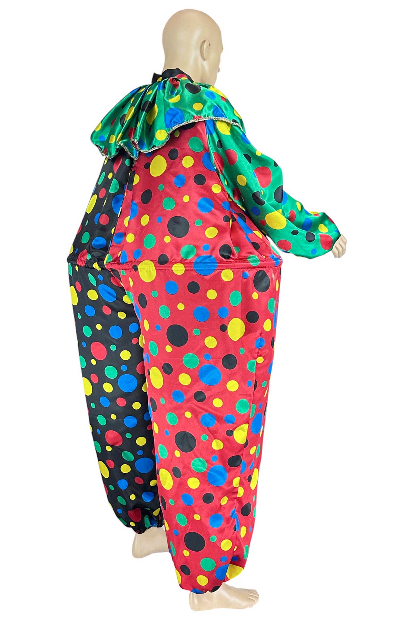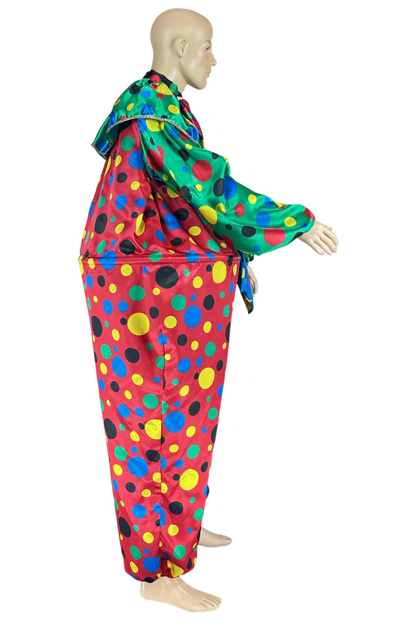 Porta il sorriso in scena con il nostro esclusivo Noleggio costume da clown uomo a pois multicolore, un abito che incarna tutta l’energia del teatro comico e la gioia del carnevale. Realizzato in tessuto satinato dai colori vivaci, questo costume presenta un’esplosione di pois rossi, gialli, verdi e blu su fondo nero, rosso, verde e blu. L’abbigliamento è caratterizzato da una silhouette ampia e voluminosa che ricorda le iconiche figure circensi del XIX e XX secolo.