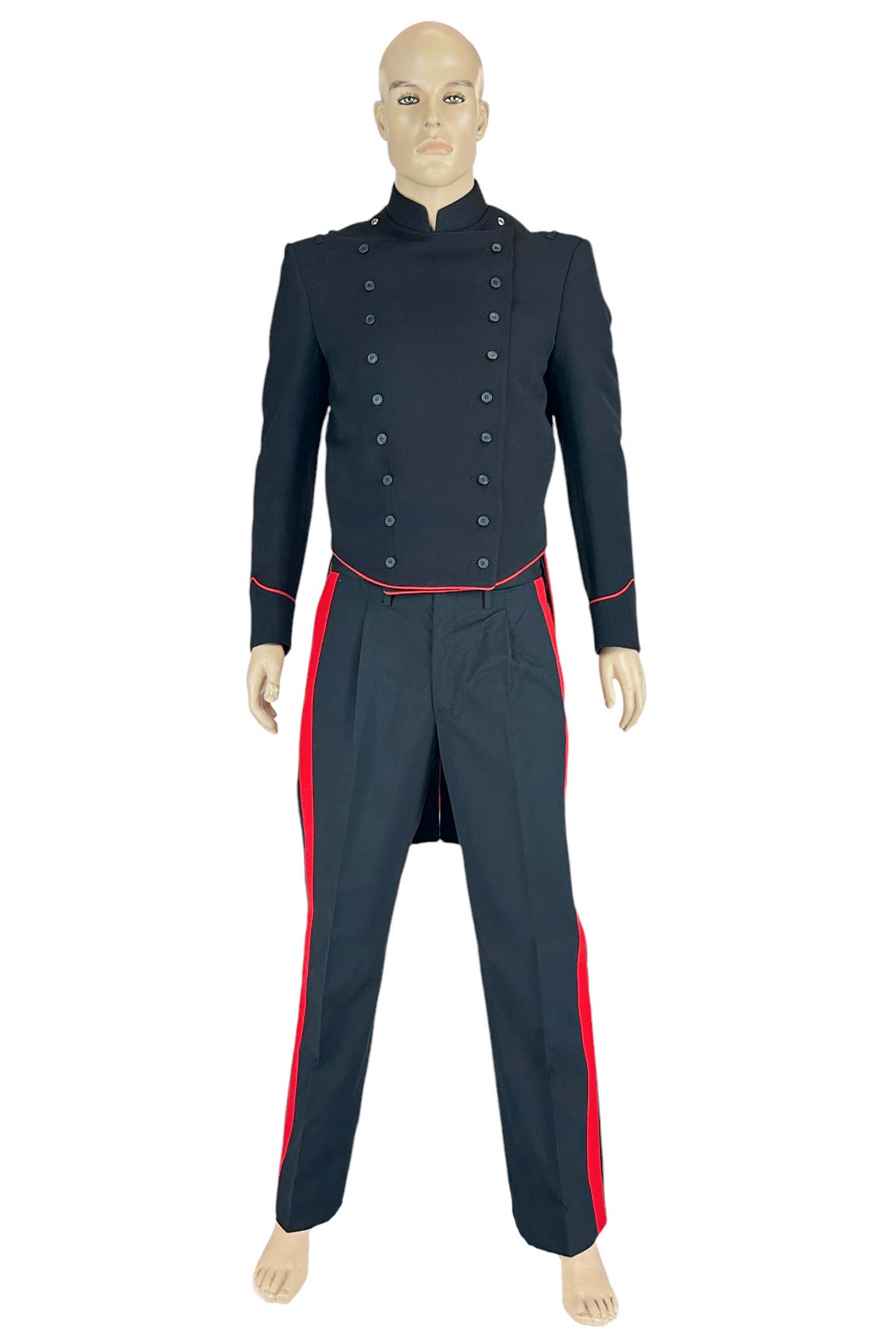 Rivivi l’eleganza e la solennità delle grandi parate d’epoca con il nostro servizio di noleggio Uniforme militare storica uomo nera e rossa. Questo raffinato abito da uomo richiama le divise ufficiali ottocentesche, indossate da ufficiali di alto rango durante cerimonie militari o incarichi rappresentativi. Il completo è composto da una giacca corta doppiopetto con ben 16 bottoni disposti in simmetria, colletto alla coreana e bordature rosse a contrasto su maniche e vita. La parte posteriore si apre in due code allungate, enfatizzate da bande verticali rosse, dettaglio che dona al capo un taglio elegante e autorevole.