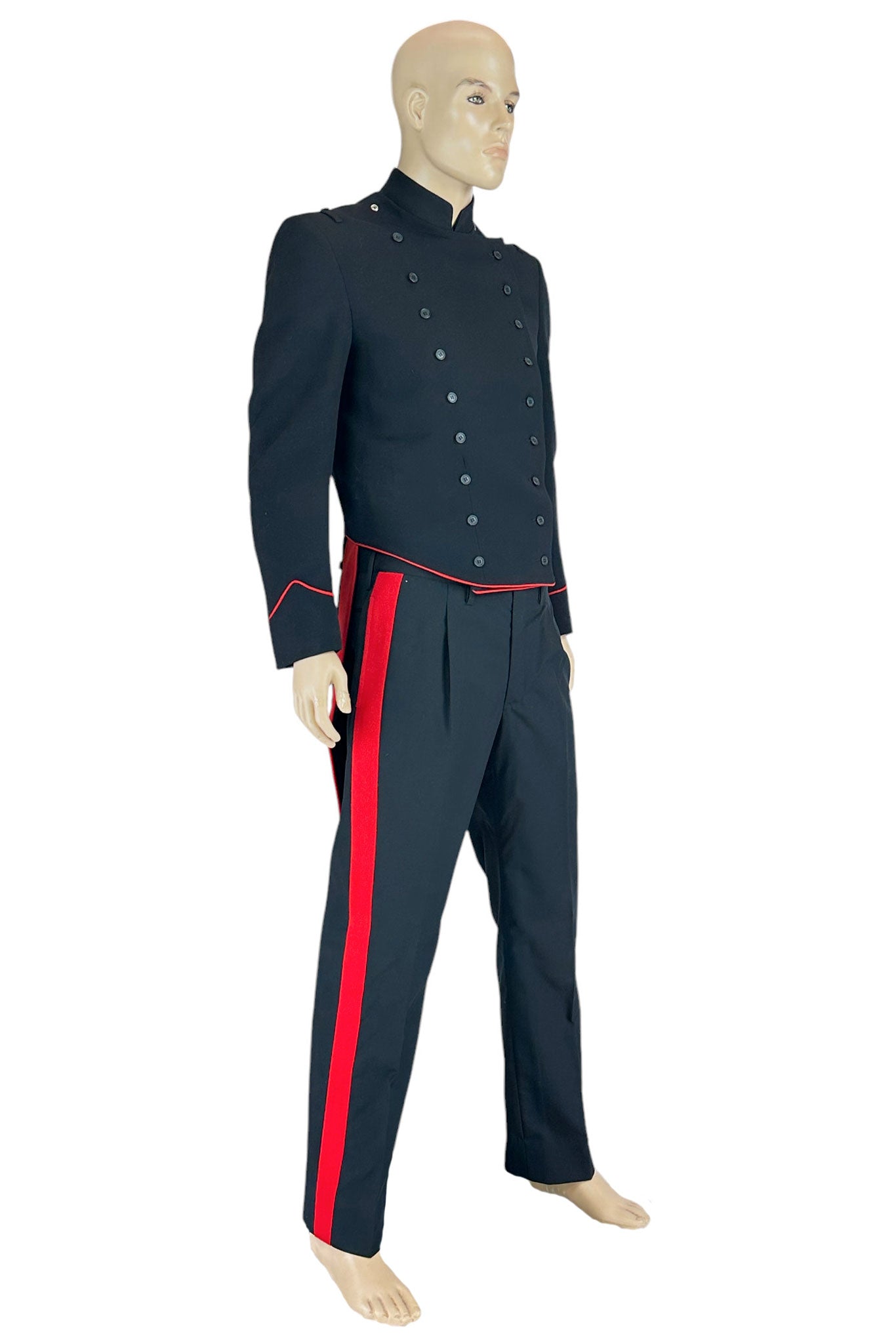 Il pantalone è abbinato alla giacca con bande laterali rosse che percorrono tutta la gamba, esaltando la linea dritta e sobria del completo. La qualità sartoriale e la cura per le rifiniture rendono quest’uniforme perfetta per sfilate, corti storiche, rievocazioni napoleoniche, ricostruzioni militari d’epoca e spettacoli teatrali ambientati nel XIX secolo.