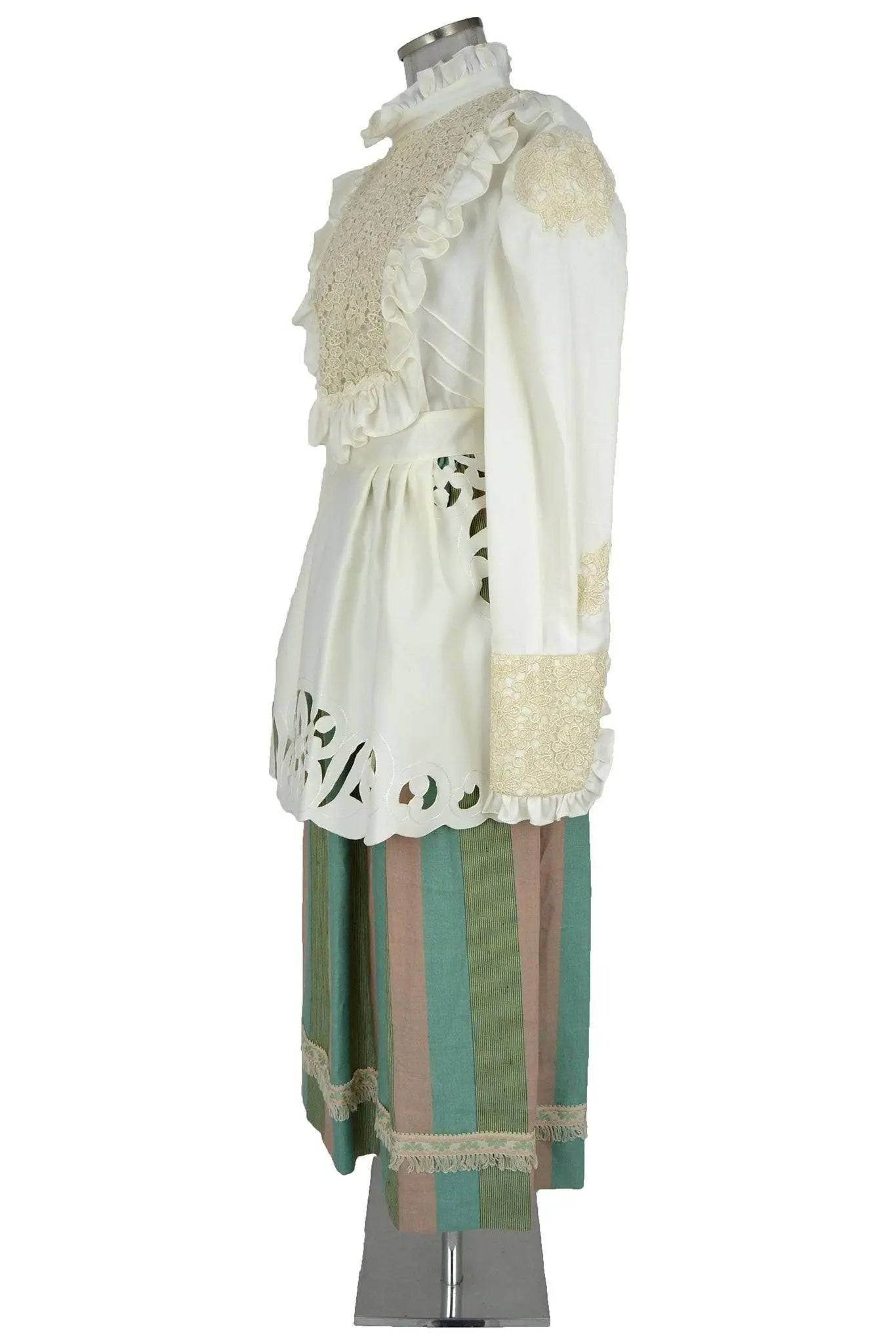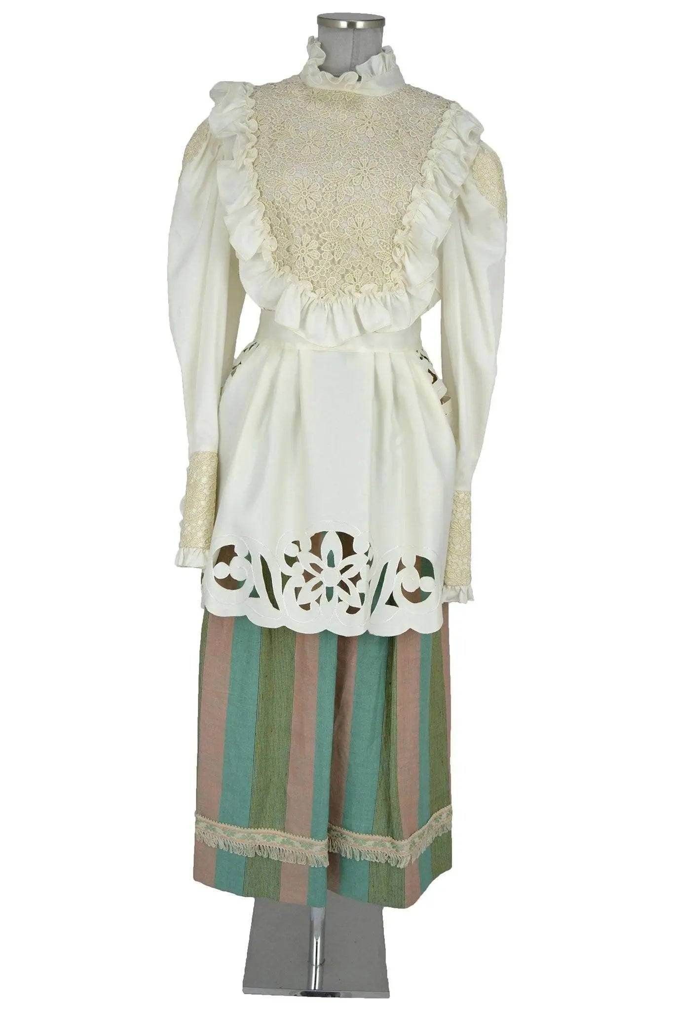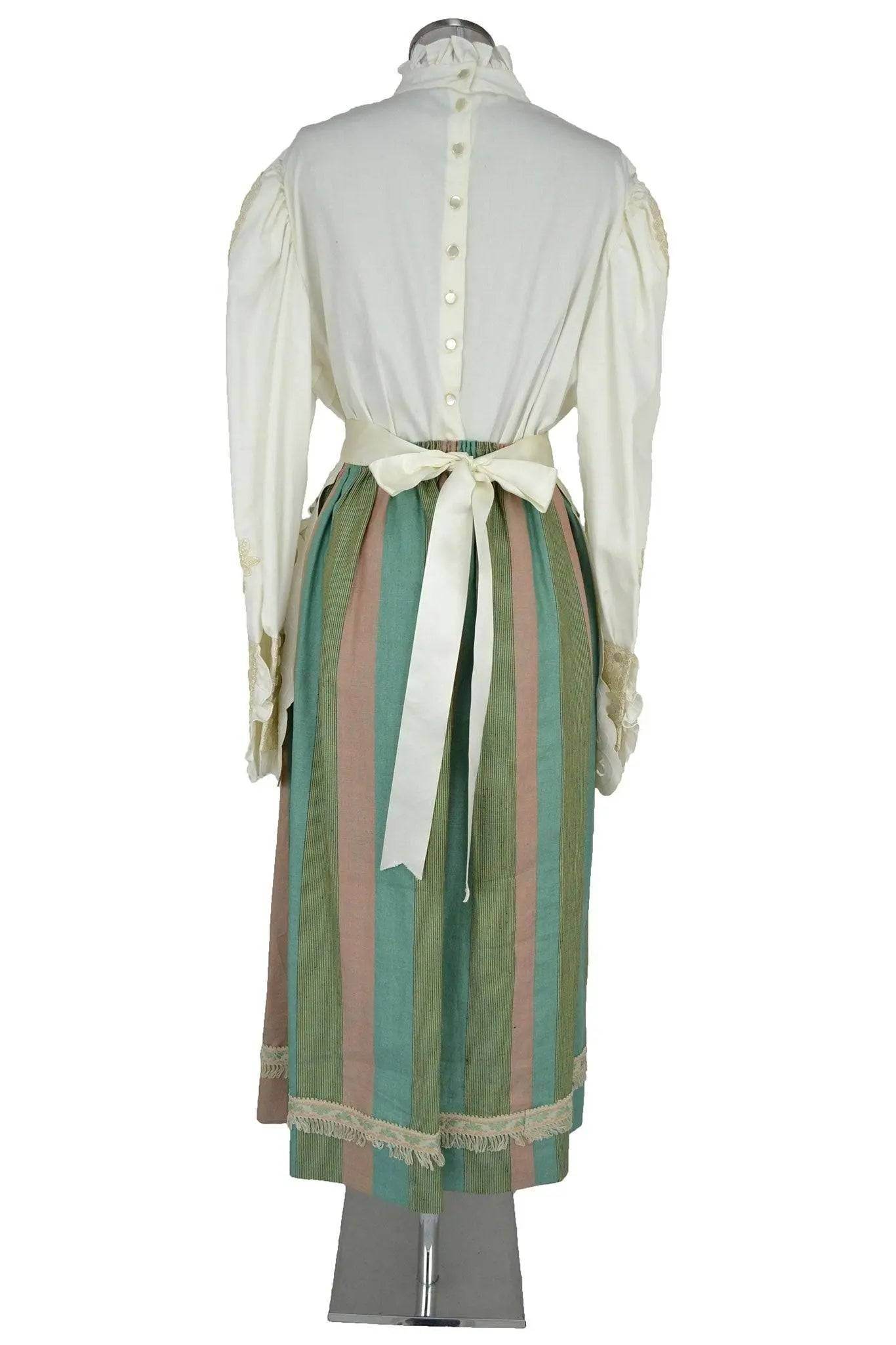 Noleggio abito donna adatto a una nanny, istitutrice o ragazza giovane di epoca edoardiana; si compone di blusa con carré e incrostazioni di pizzo, dai polsi particolari, gonna a righe in colori pastello con passamaneria e sopragonna a grembiulino con traforo tagliato a laser.