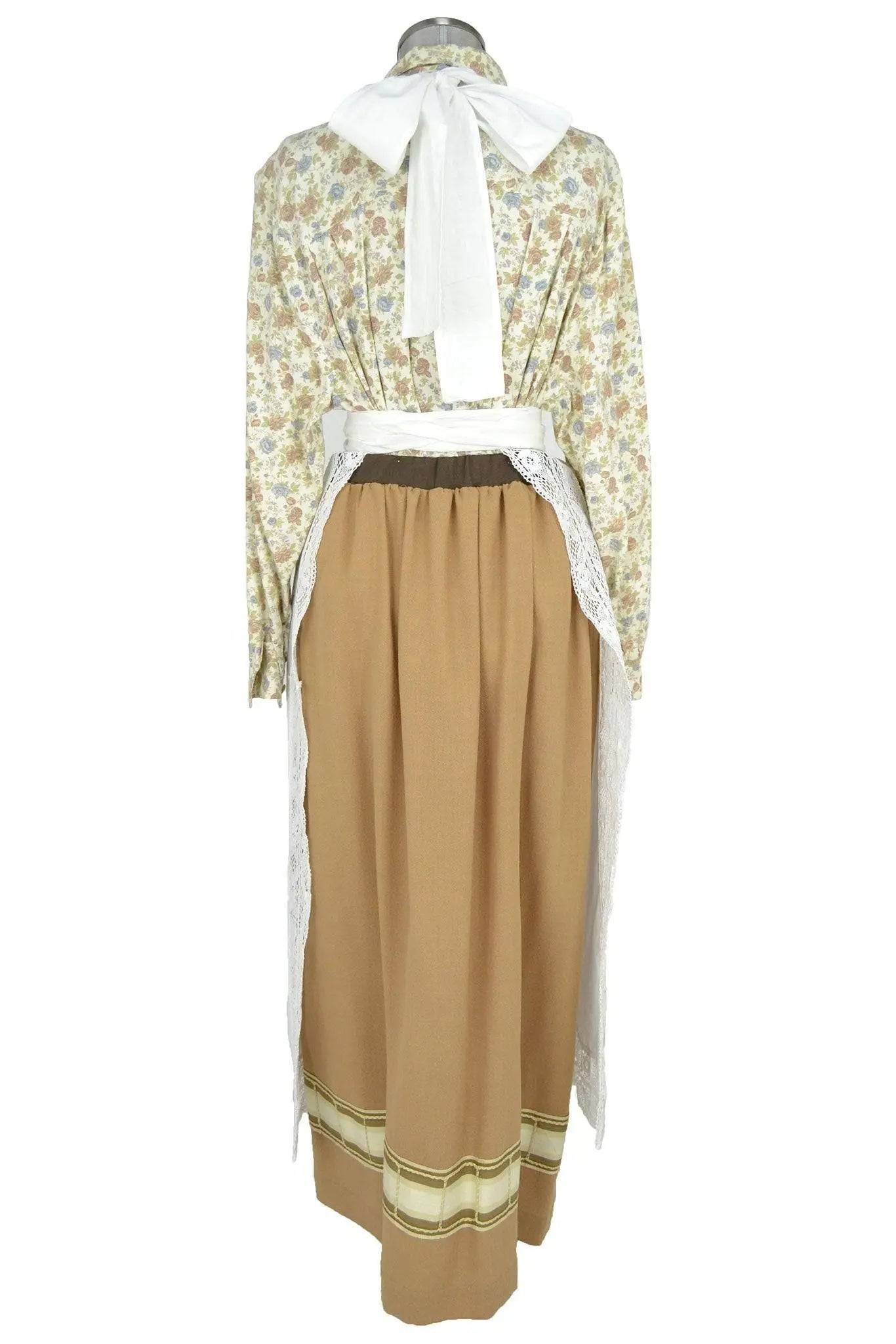 Costume per domestica fine '800 – inizio '900, adatto anche a una casalinga o una bambinaia; la semplice camicia a fiori, in tinta con la gonna diritta, ha la particolarità dell'allacciatura a sinistra; il tutto è sormontato dal lungo grembiule a pettorina con bordure in robusto pizzo meccanico.