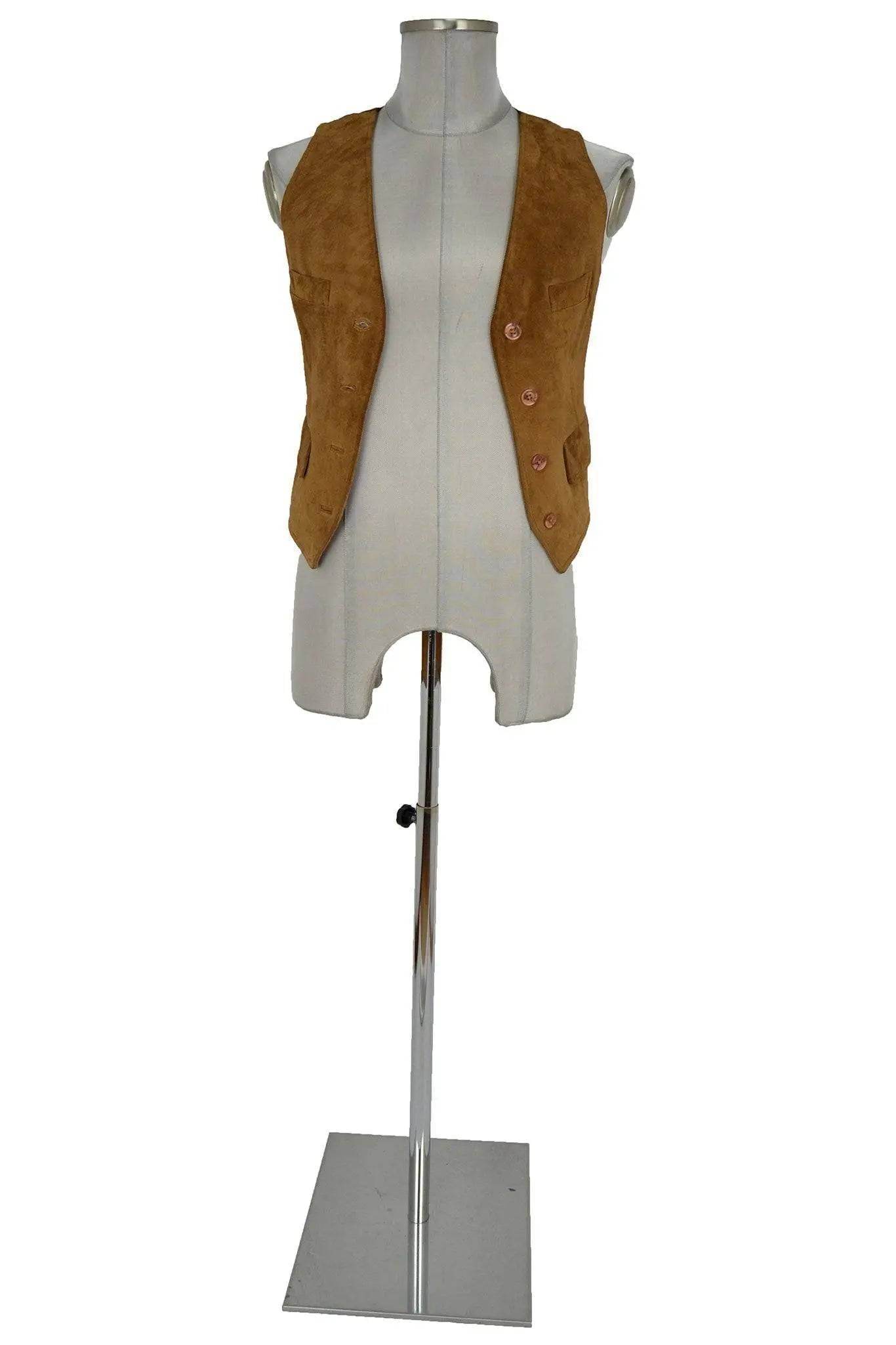 Gilet scamosciato color renna con abbottonatura femminile e taglio un po' sciancrato, per un look anni '70 oppure Vecchio West. Monopetto e senza revers, ha solo quattro bottoni che ne sottolineano il carattere sportivo, due taschini sul petto e due tasche a patella. Da abbinare a gonnellone o jeans.