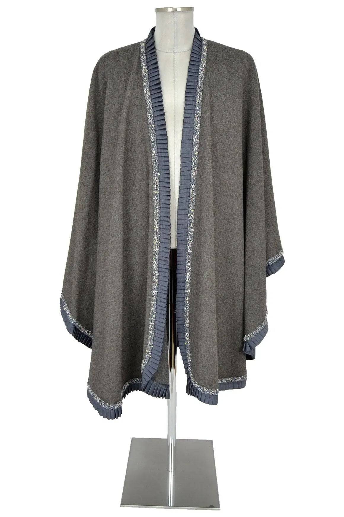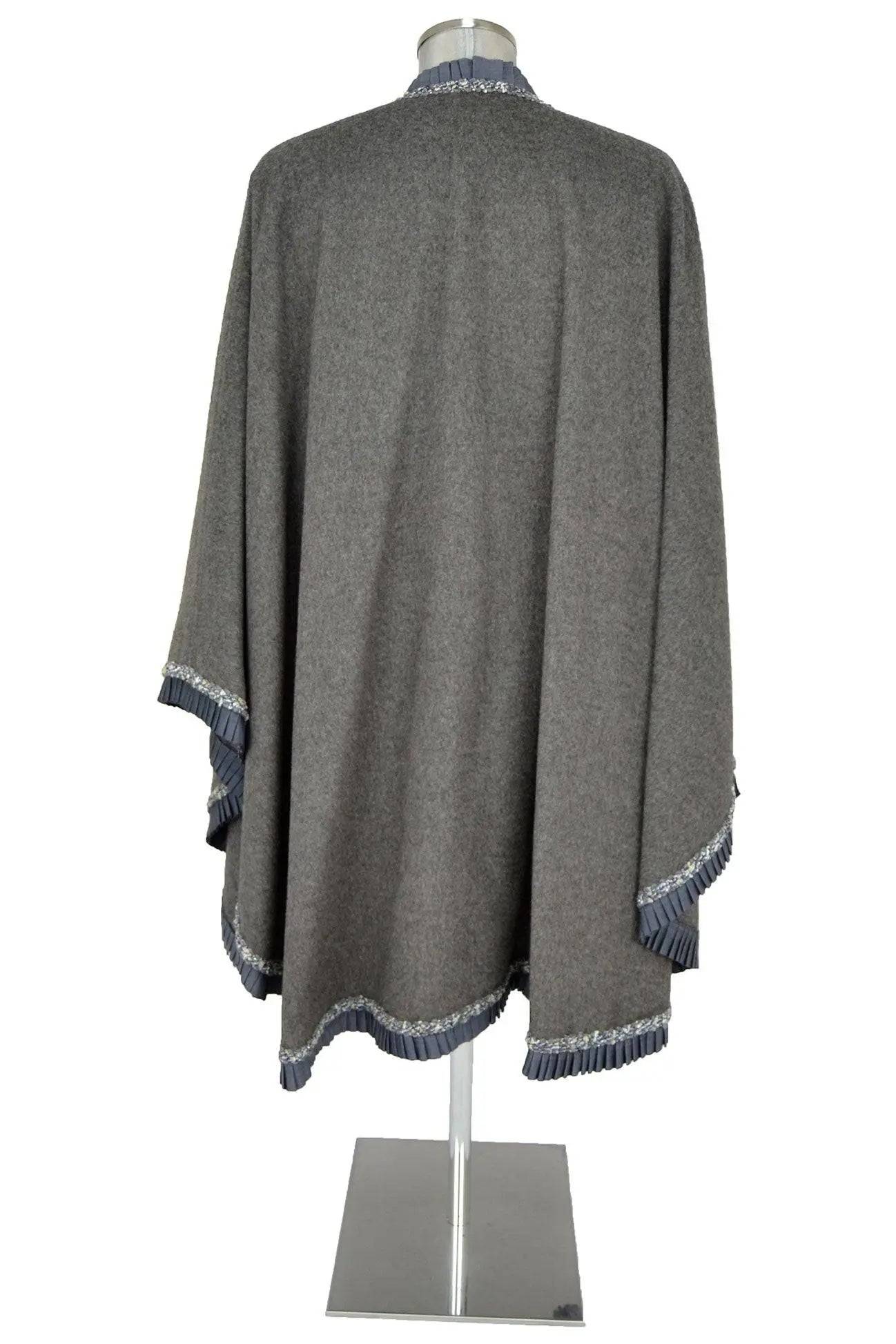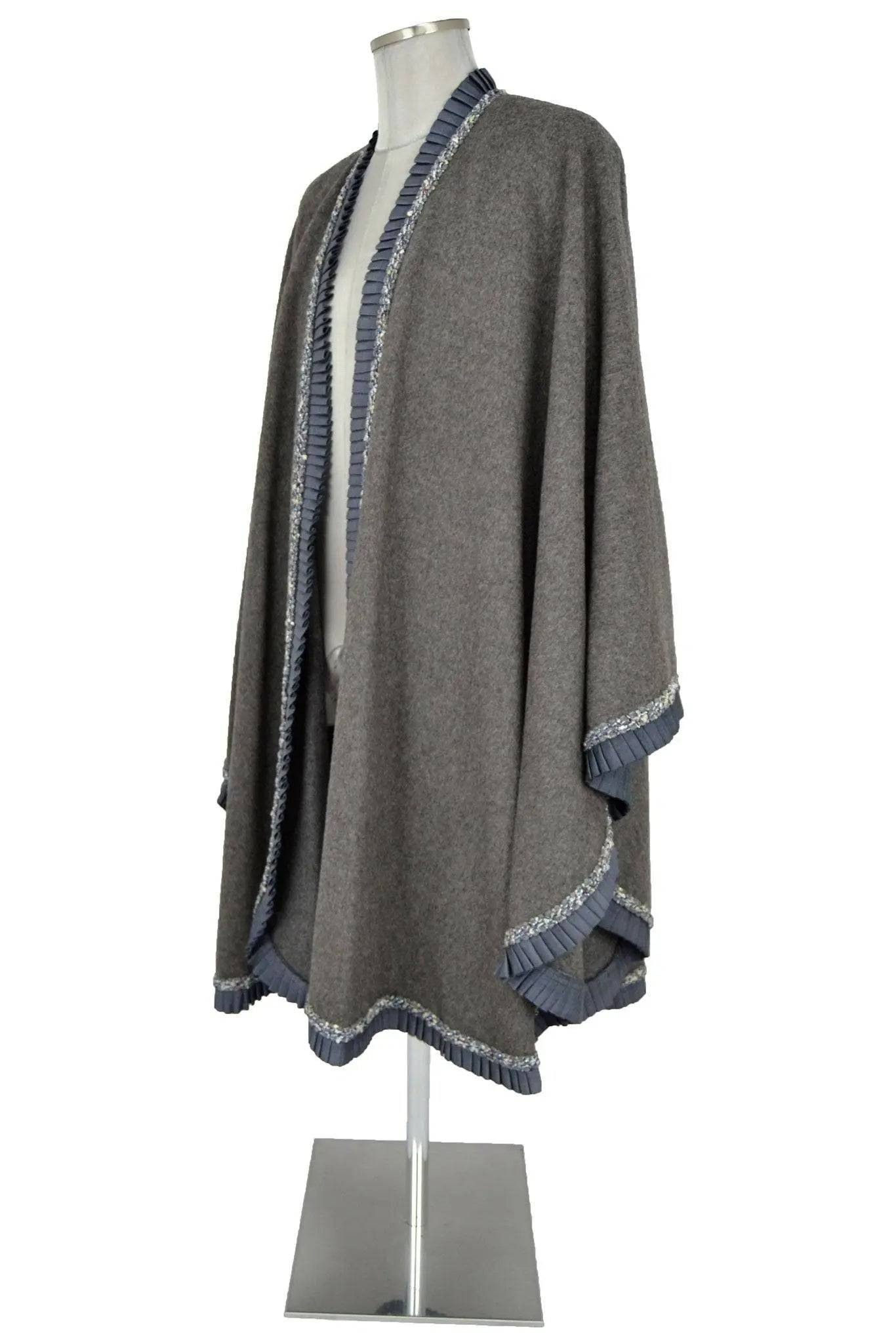Noleggio mantello elegante donna in ottimo panno grigio ferro con bordure di raso plissé e passamaneria luccicante. Si può indossare su un abito da sera moderno come pure su un costume d'epoca, adattandosi a vari secoli: dai personaggi delle sacre rappresentazioni fino ai dandy dell'800 e del '900.