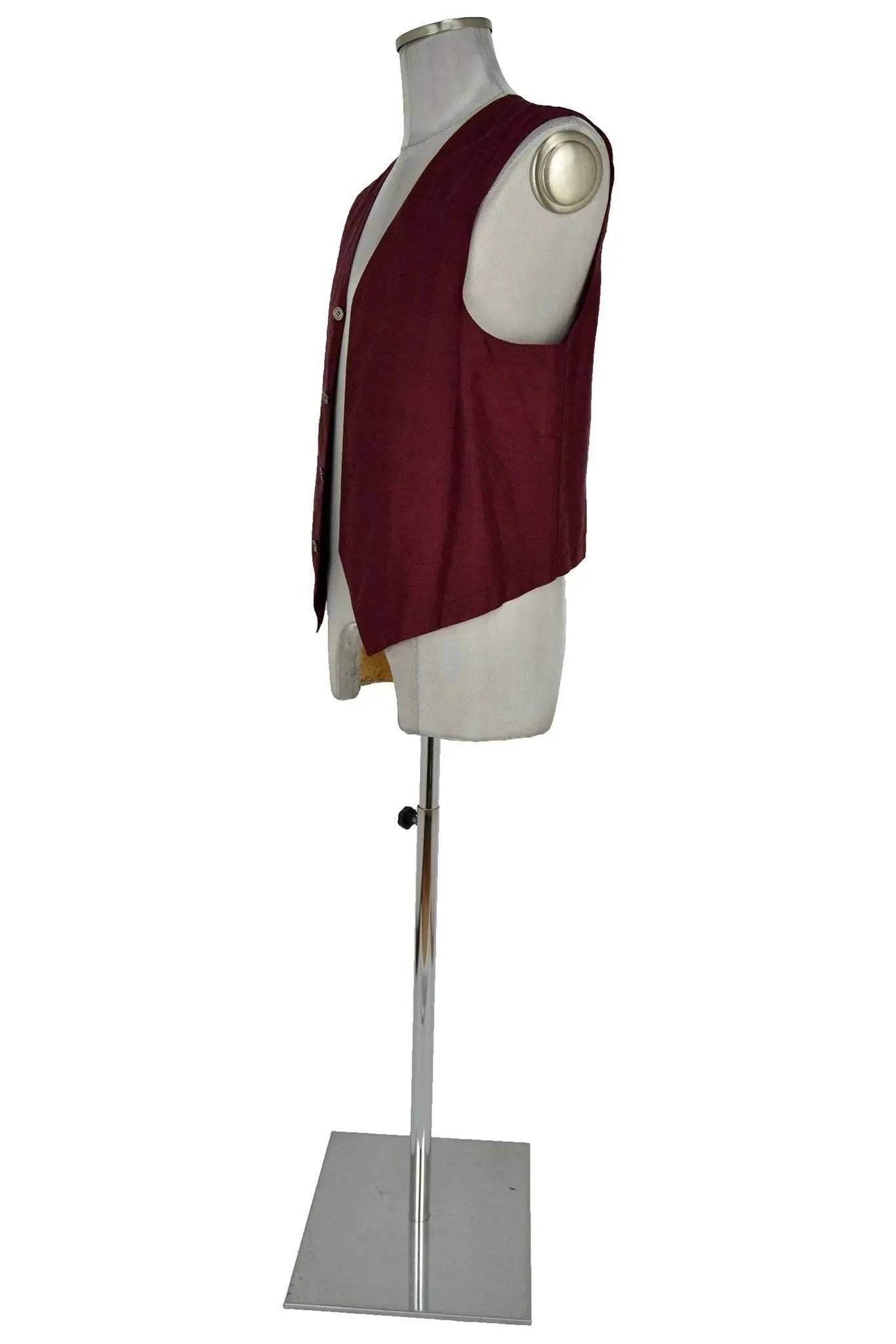 Gilet maschile monopetto senza revers, abbastanza accollato per vedersi sotto una giacca anche se ha solo quattro bottoni; il tessuto è di un bellissimo color vino. Ha un taglio classico adatto sia per l'800 sia per il '900 e si può indossare da solo oppure con un completo scuro giacca e pantaloni.
