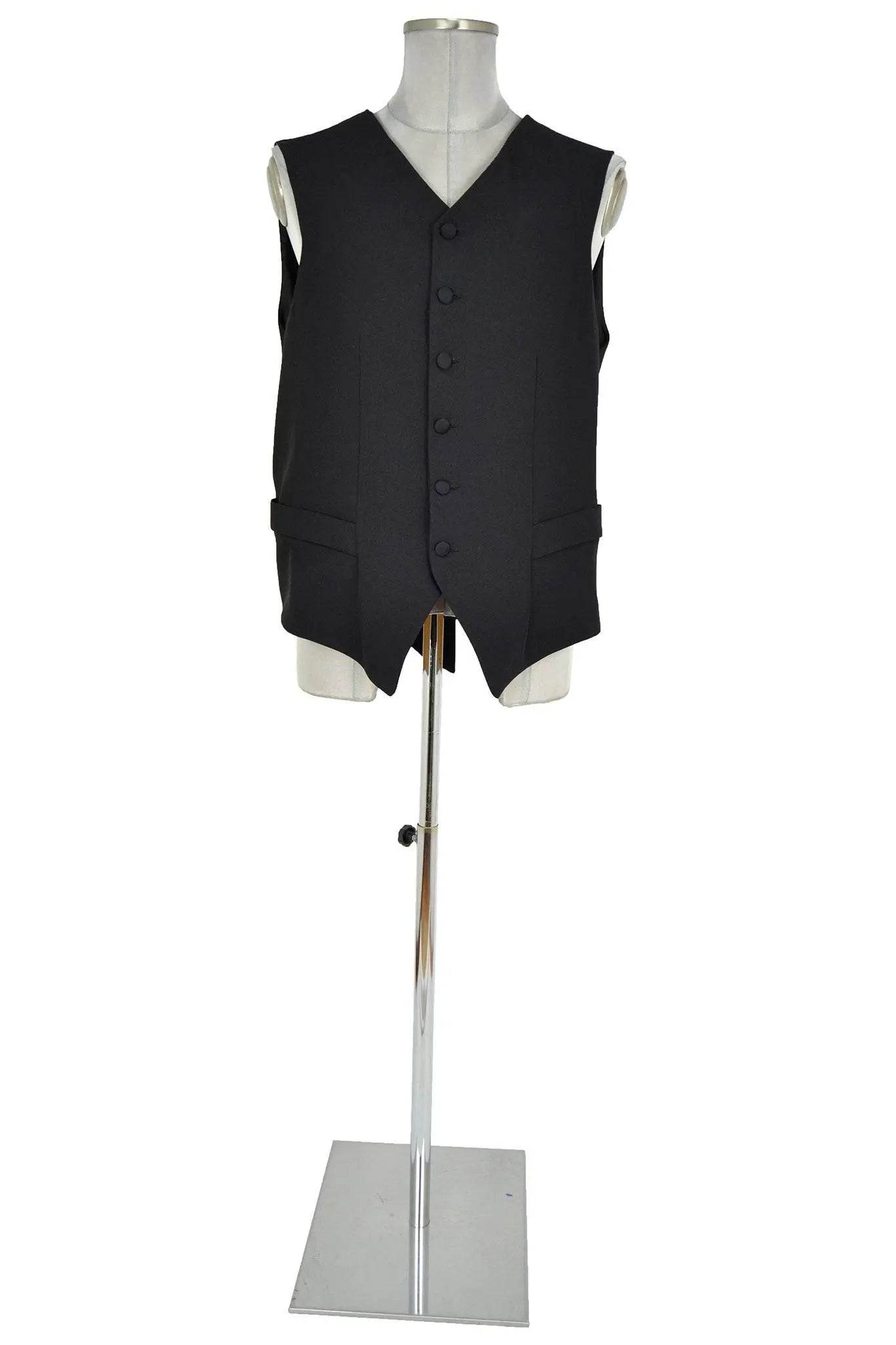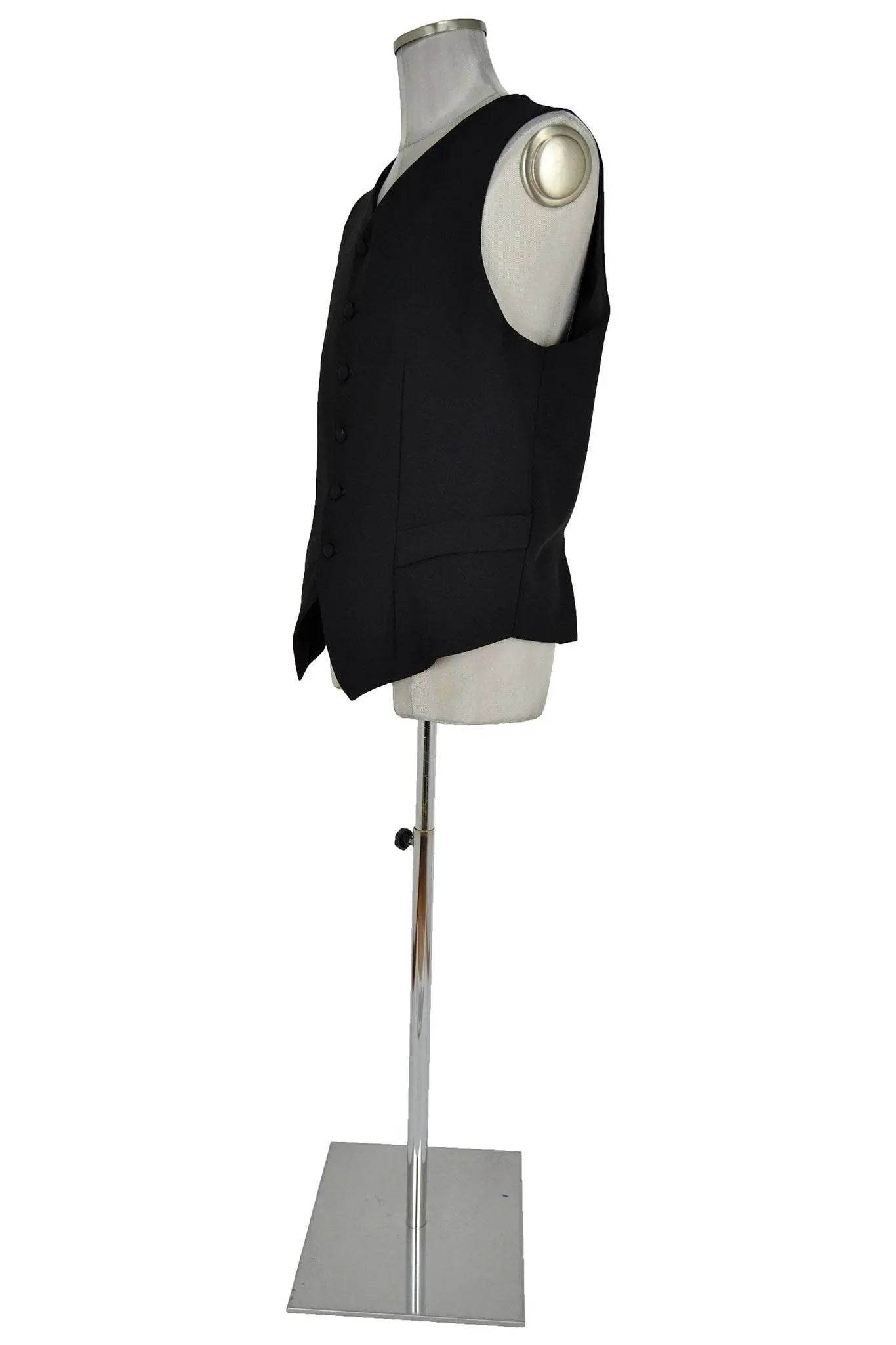 Gilet maschile di taglio molto elegante a sei bottoni ricoperti, monopetto con falde a punta, taschini, e pinces. Il tessuto è grigio antracite e quindi adatto a occasioni formali, oppure a interpretare personaggi di ceto alto, banchieri, ecclesiastici ecc. di fine '800 o preferibilmente '900.