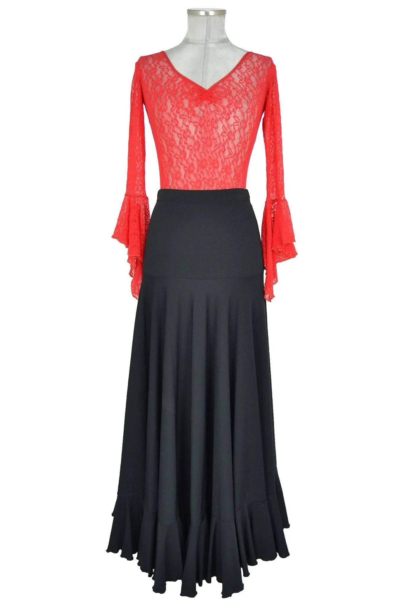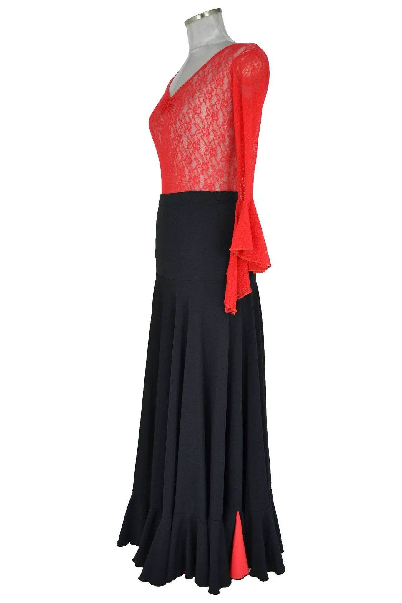 Costume in stile spagnolo adatto per spettacoli di flamenco o altre danze etniche, ma anche per serate e feste. Particolarmente azzeccato l'abbinamento nero e rosso e il contrasto tra la lycra opaca e il pizzo trasparente. La gonna lunga è aderente ai fianchi e termina in una balza arricciata.