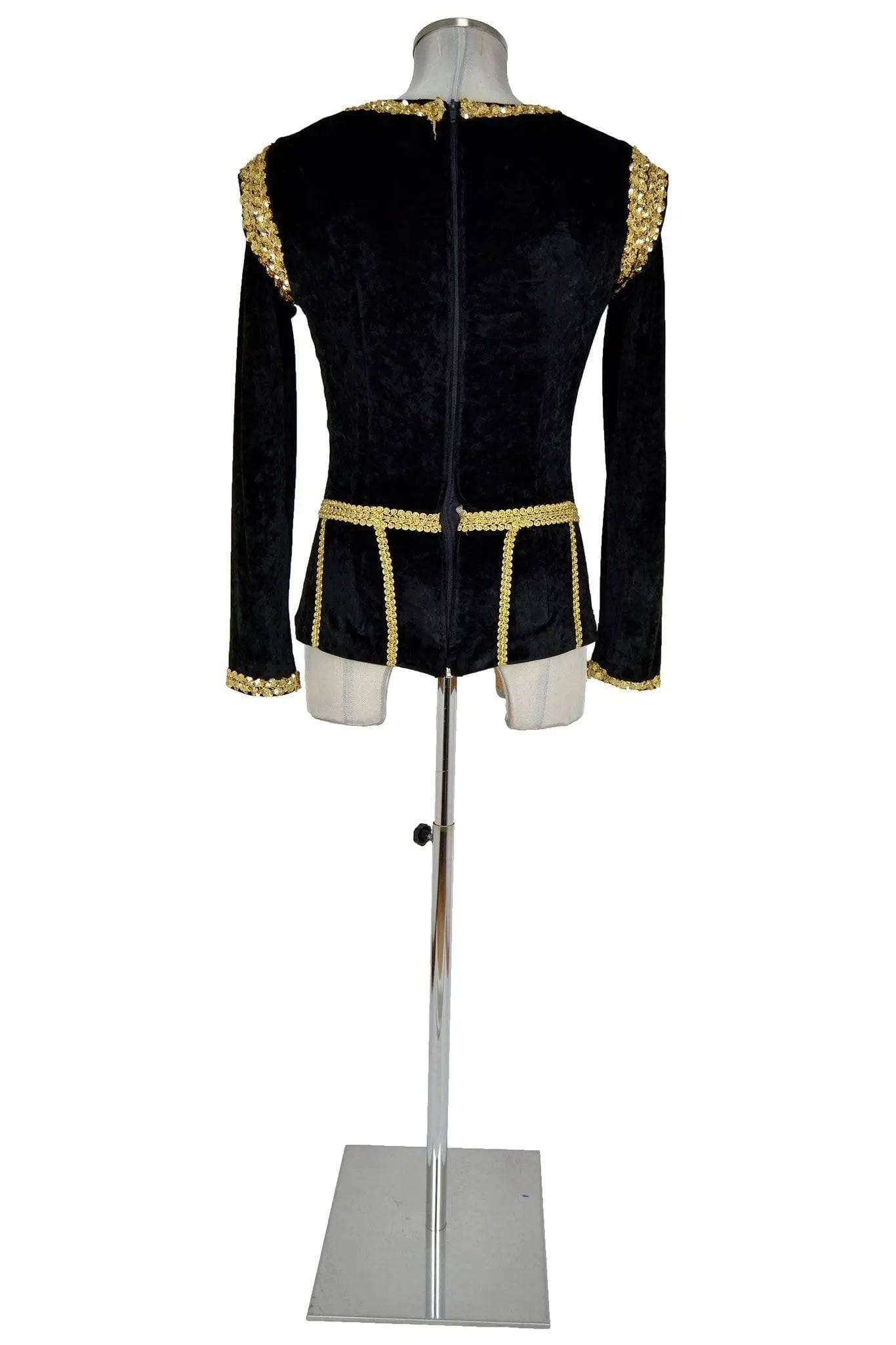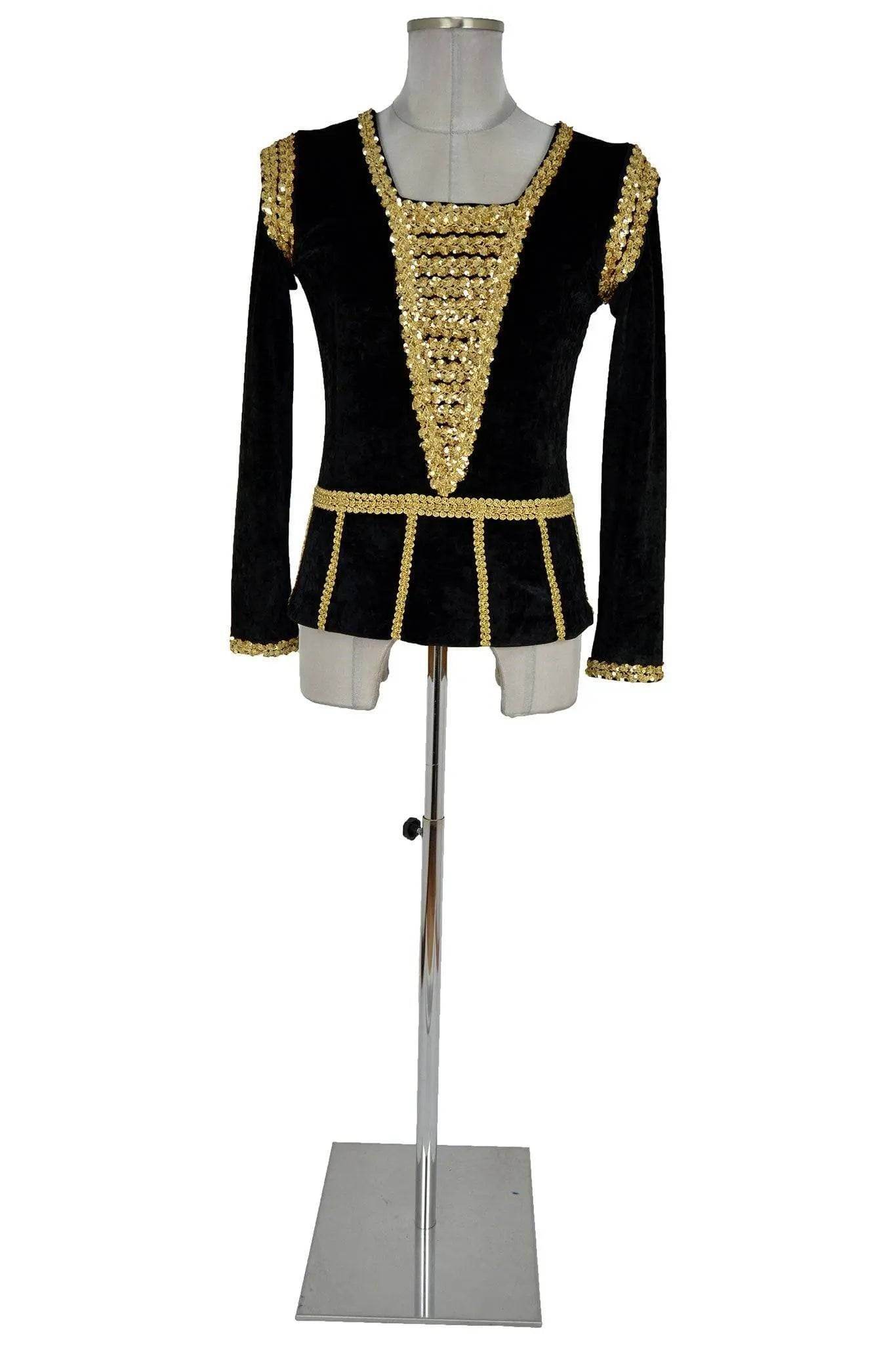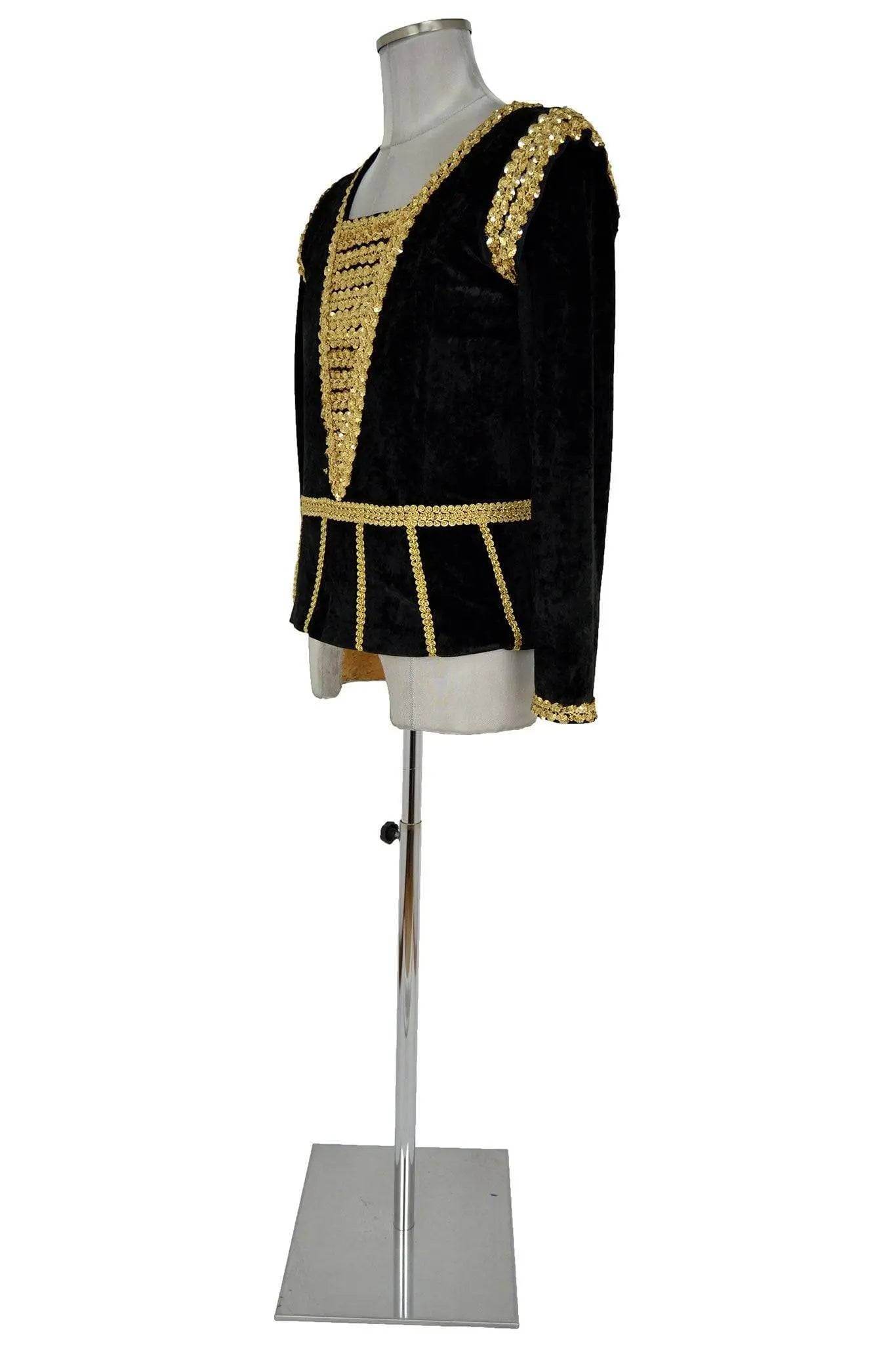 Bellissimo farsetto maschile in velluto scuro con ricche applicazioni di passamanerie e paillettes dorate che creano effetto di pettorina. Per travestimenti o balletti, è perfetto per personaggi come Romeo, cavalieri e principi medievali delle fiabe; da indossare con fuseaux e stivaletti.