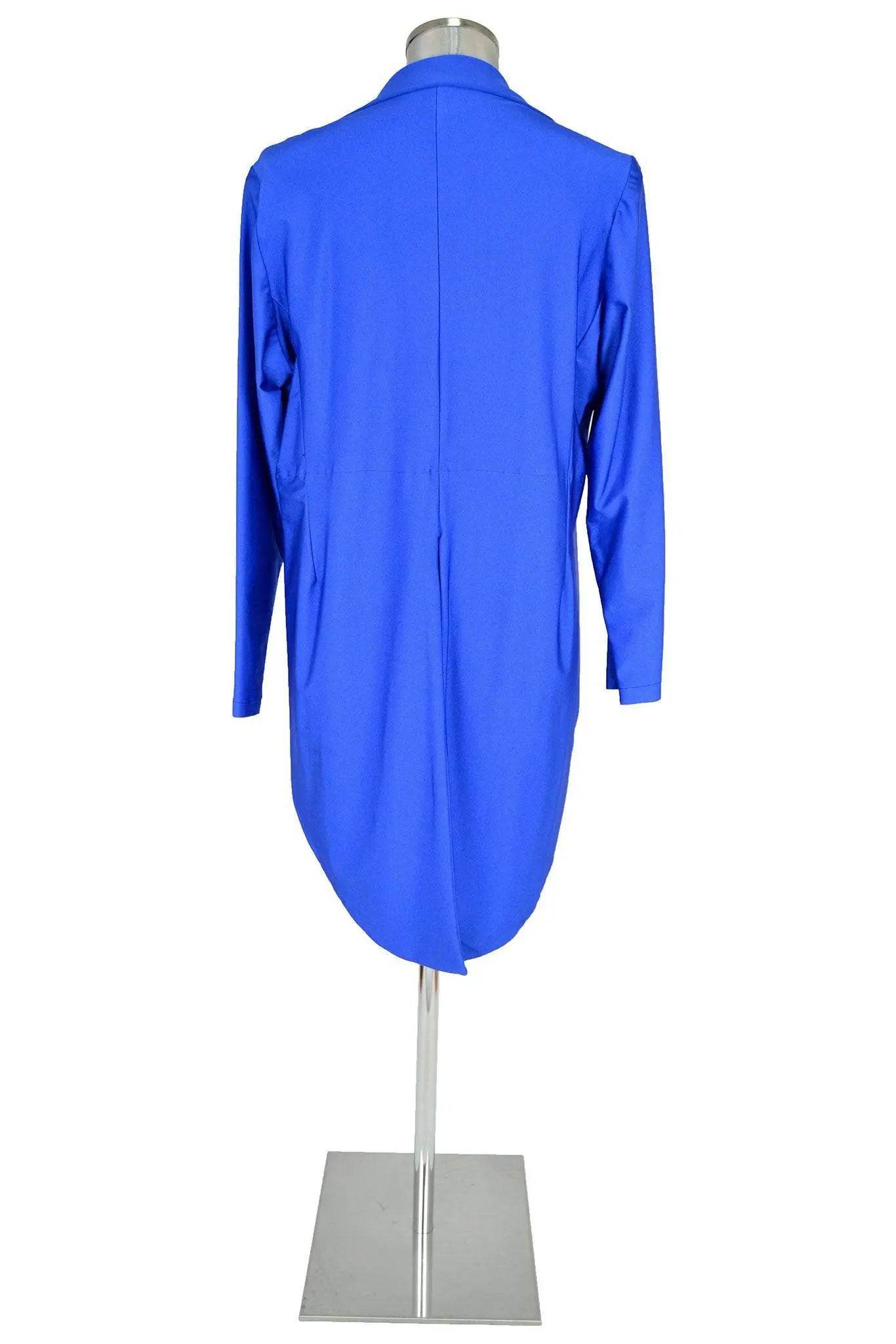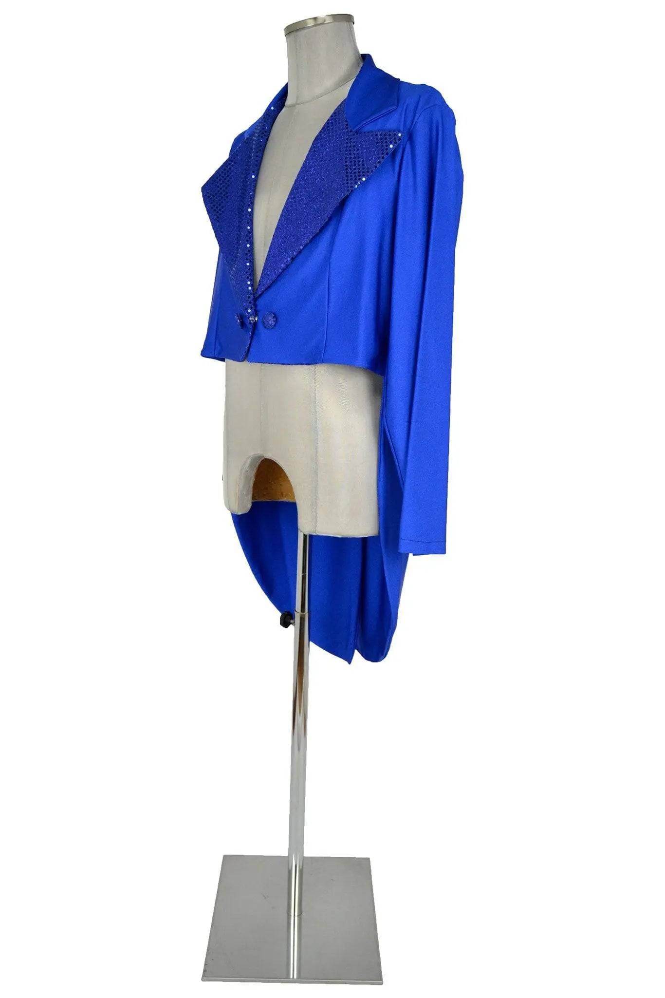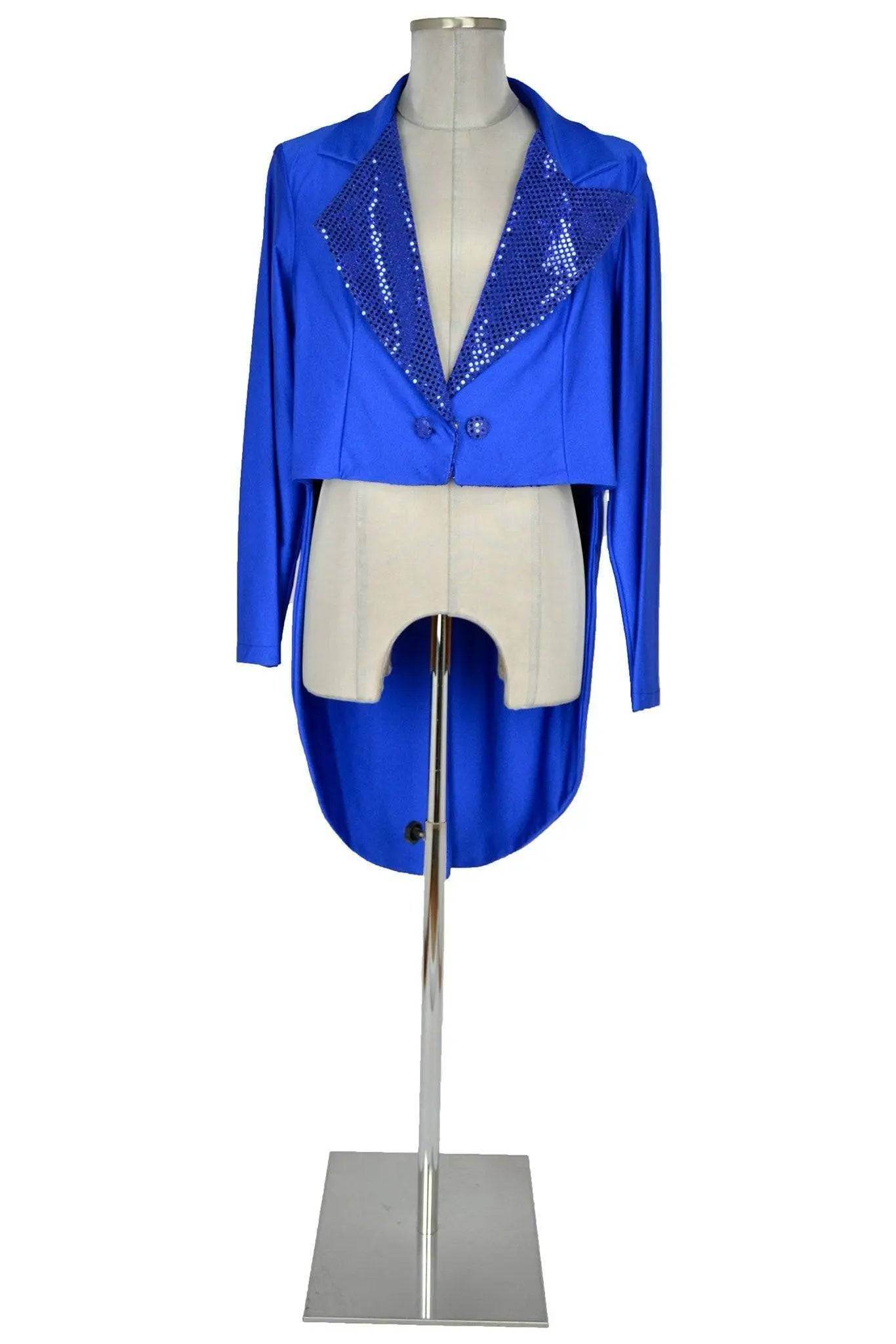 Giacca da donna per personaggio circense come la domatrice di belve oppure una raffinata assistente del prestigiatore. Corta davanti alla vita come una marsina e a lunga coda arrotondata dietro, presenta ampi risvolti e bottoni in tessuto paillettato coordinato nello stesso colore gioiello.