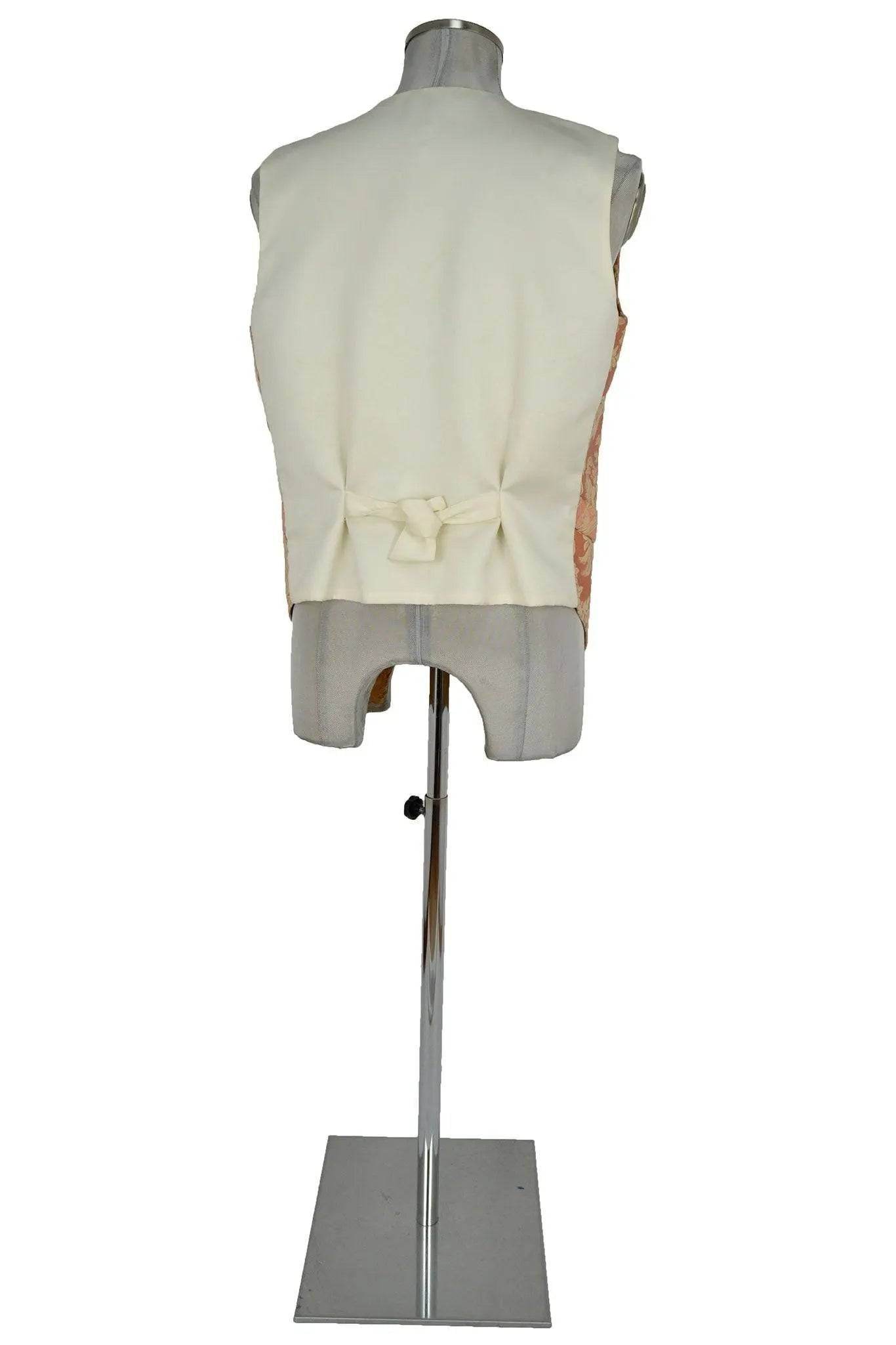 Elegante gilet maschile '700-'800 utilizzabile anche nella contemporaneità abbinandolo a un completo grigio o blu per cerimonie o matrimoni. Realizzato in bellissimo tessuto jacquard floreale in toni caldi, monopetto e senza revers con cinque bottoni, taschine diagonali e lembi a punta.