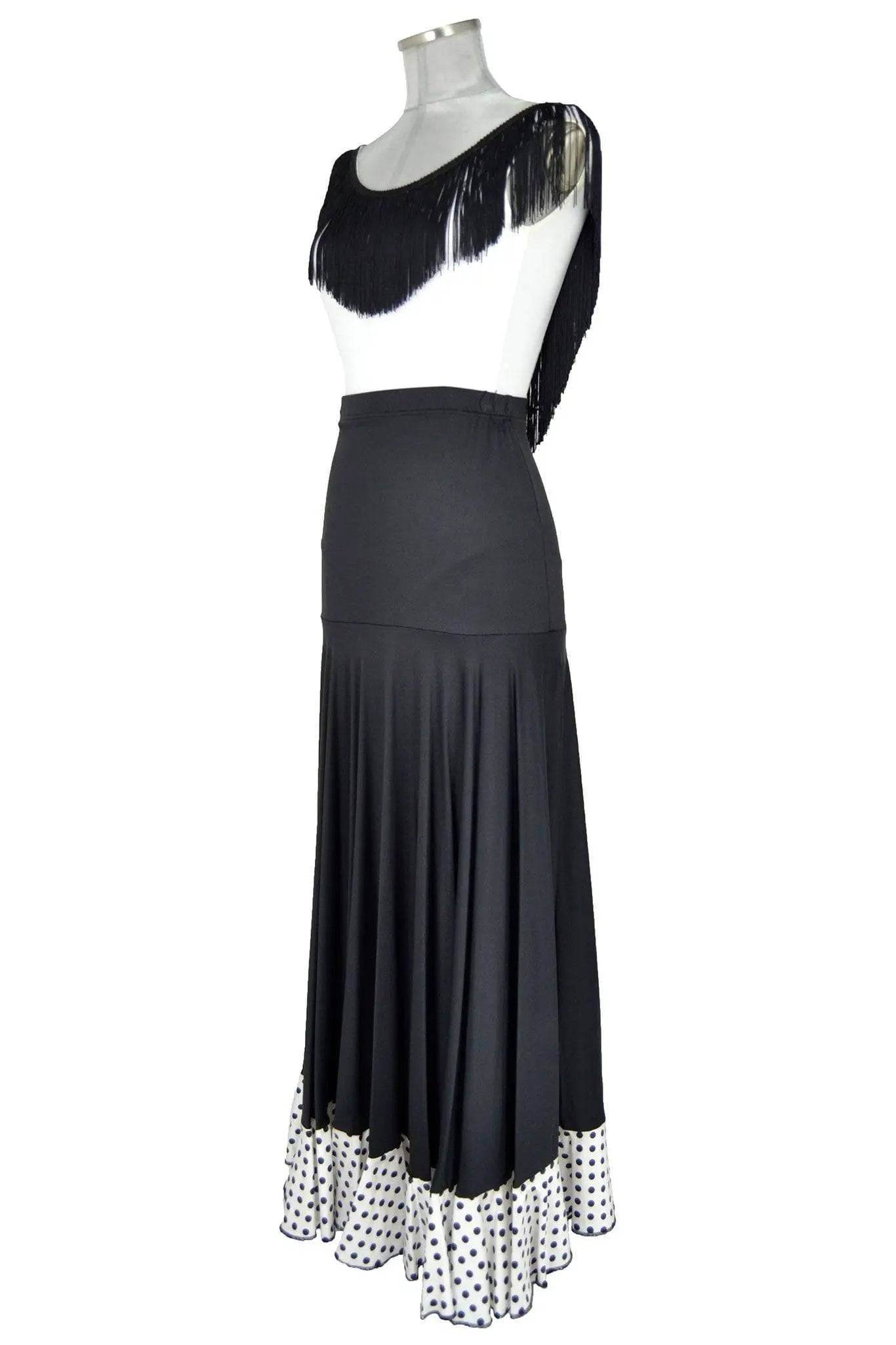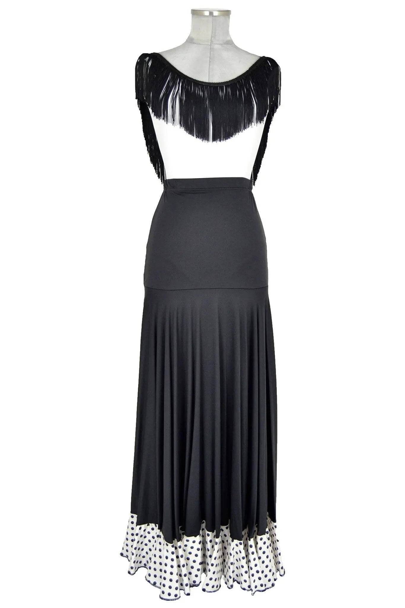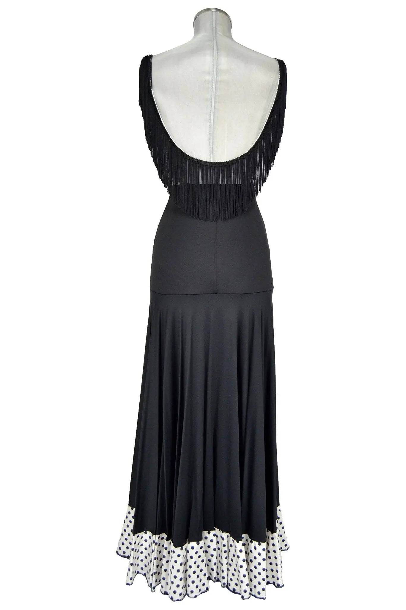 Le frange sul busto creano un effetto dinamico durante i movimenti, donando un'aria leggera e sofisticata. La gonna, con la sua lunghezza elegante e il bordo a pois, garantisce un look unico e senza tempo, mentre il nero conferisce versatilità, permettendo di abbinarlo facilmente ad accessori di vario tipo, come scarpe con tacco e gioielli luccicanti.