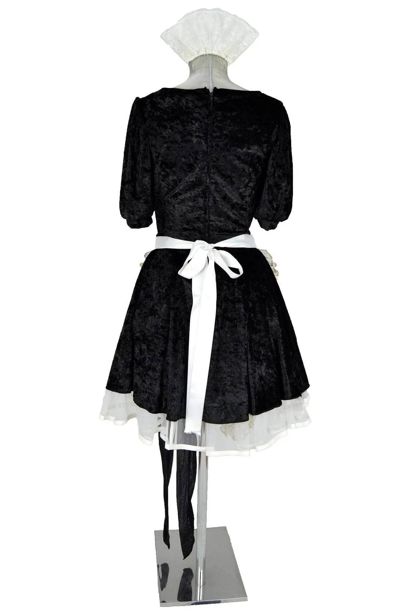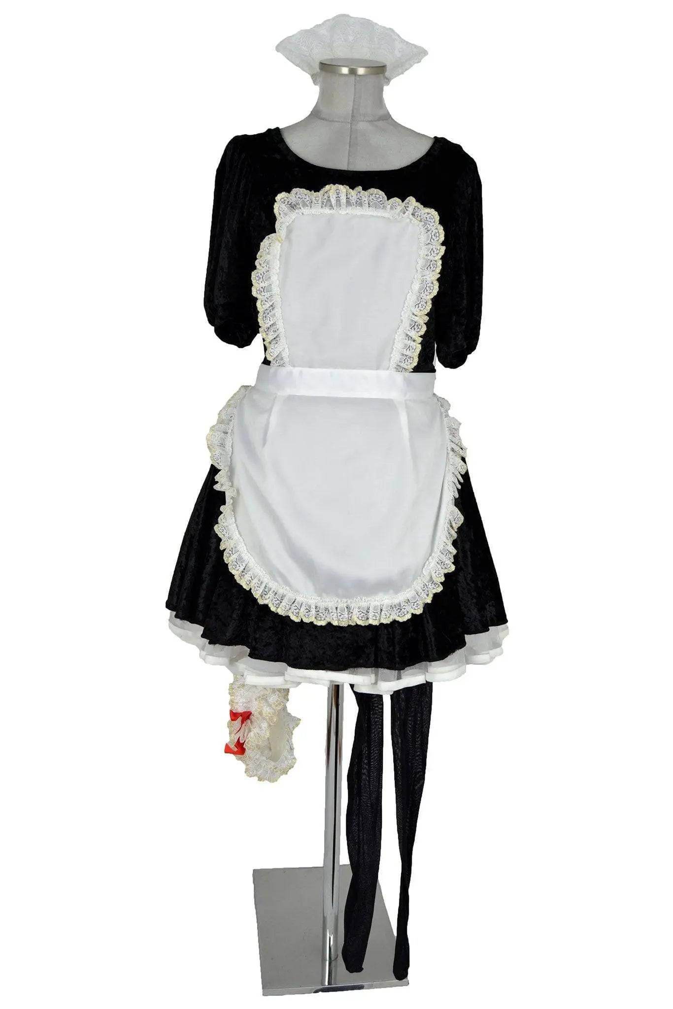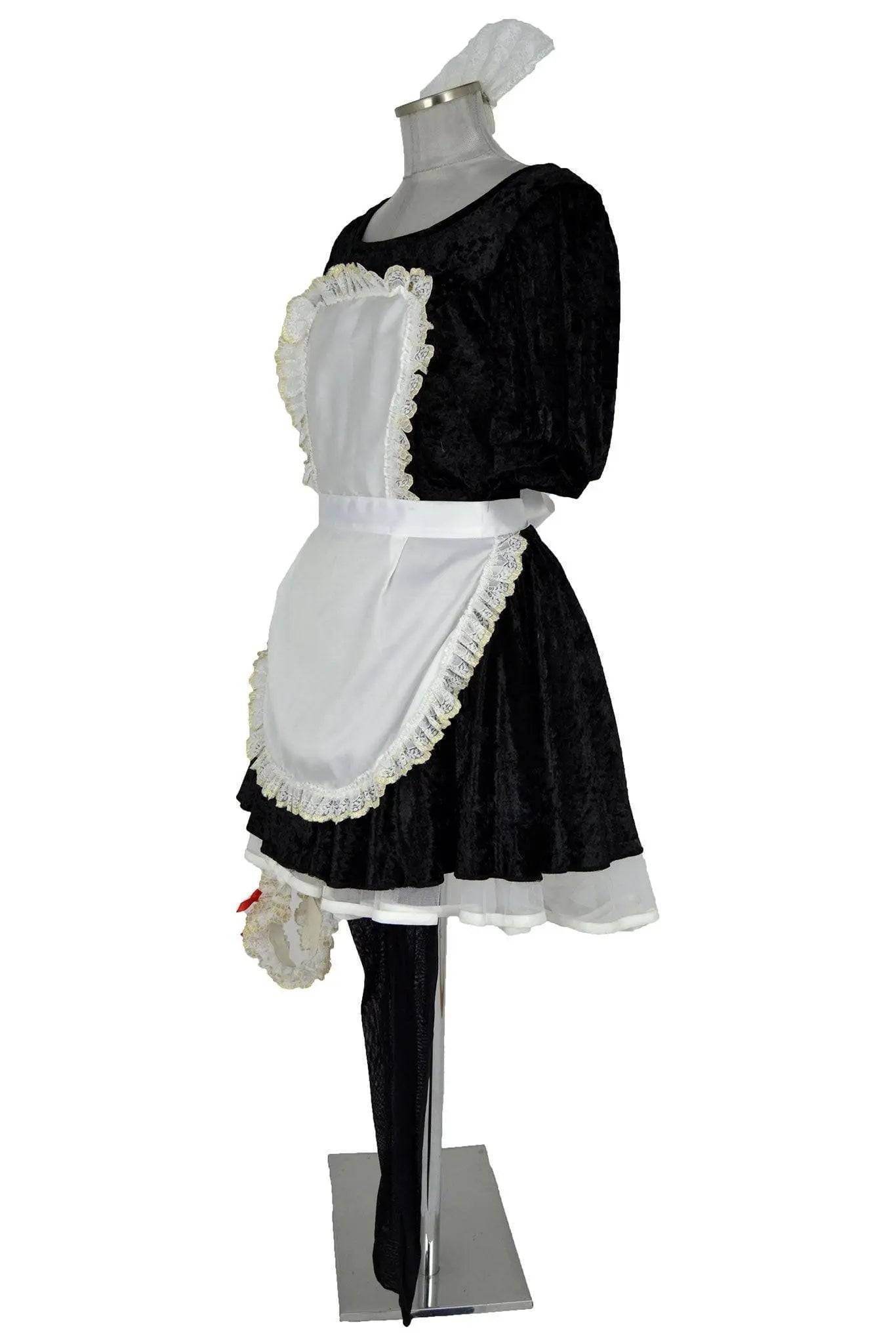 Il completo include un vestito corto in velluto nero con maniche a sbuffo e sottogonna in tulle bianco, un grembiule in cotone bianco bordato con pizzo avorio, una cuffietta coordinata in pizzo e accessori come la giarrettiera con fiocco rosso e le calze nere in pizzo traforato. Il busto del costume segue la linea del corpo e si chiude con una zip sul retro, mentre la gonna ampia e arricciata dona movimento e volume.
